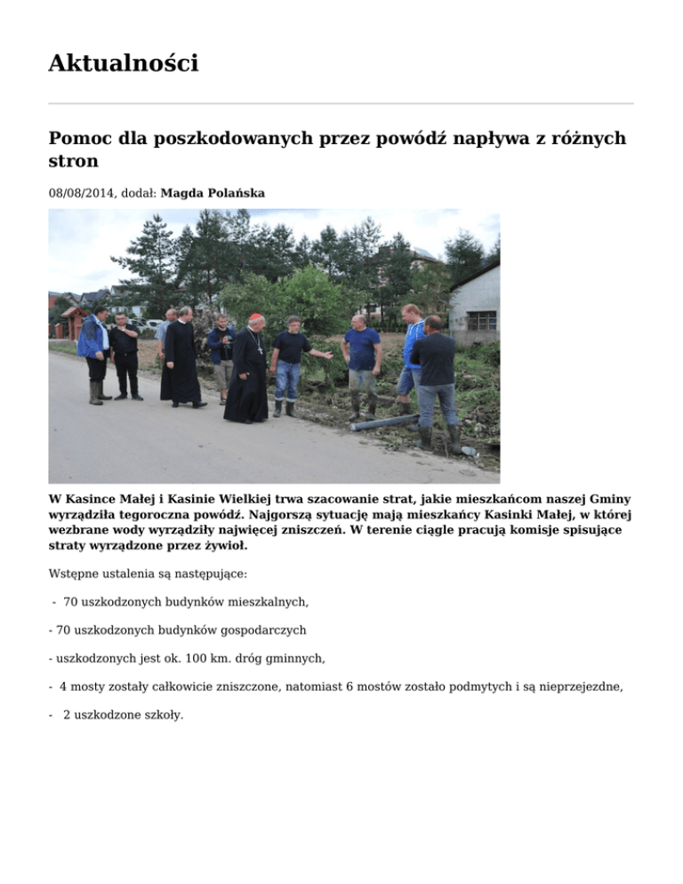 Aktualności Pomoc dla poszkodowanych przez powódź napływa z różnych stron 08/08/2014, dodał: Magda Polańska W Kasince Małej i Kasinie Wielkiej trwa szacowanie strat, jakie mieszkańcom naszej Gminy wyrządziła tegoroczna powódź. Najgorszą sytuację mają mieszkańcy Kasinki Małej, w której wezbrane wody wyrządziły najwięcej zniszczeń. W terenie ciągle pracują komisje spisujące straty wyrządzone przez żywioł. Wstępne ustalenia są następujące: - 70 uszkodzonych budynków mieszkalnych, - 70 uszkodzonych budynków gospodarczych - uszkodzonych jest ok. 100 km. dróg gminnych, - 4 mosty zostały całkowicie zniszczone, natomiast 6 mostów zostało podmytych i są nieprzejezdne, - 2 uszkodzone szkoły. Mieszkańcy Gminy Mszana Dolna nie pozostają jednak bez opieki. Od pierwszych godzin nocnej nawałnicy (5/6 sierpnia) na całym terenie pracowali druhowie Ochotniczych Straży Pożarnych, którzy ofiarnie nieśli swoją pomoc, próbując zabezpieczyć mienie mieszkańców w trakcie nawałnicy; a bezpośrednio po niej usuwali i nadal usuwają skutki żywiołu. Wsparcie w swoich działaniach dostali ze strony innych jednostek OSP z terenu gminy i powiatu, Państwowej Straży Pożarnej z Limanowej oraz Szkoły Aspirantów PSP w Krakowie. Koordynatorem akcji ze strony PSP był st. bryg. mgr inż. Józef Galica – Zastępca Małopolskiego Komendanta Wojewódzkiego PSP oraz bryg. mgr inż. Janusz Kurzeja - Komendant Powiatowy Państwowej Straży Pożarnej w Limanowej. Tereny zalane przez żywioł wizytował gen. brygadier Wiesław Leśniakiewicz – Komendant Główny PSP. Do Kasinki Małej i Kasiny Wielkiej przyjechał również Starosta Limanowski Jan Puchała oraz Wicestarosta Franciszek Dziedzina. Na miejsce z deklaracją pomocy dotarł Wicewojewoda Andrzej Harężlak, a potem również Minister Administracji i Cyfryzacji Rafał Trzaskowski w asyście Wojewody Małopolskiego Jerzego Millera. Zadeklarowali oni pomoc doraźną dla każdego mieszkańca poszkodowanego w wyniku żywiołu w wysokości do 6000 zł, w zależności od rozmiaru szkód. Minister zadeklarował również pomoc rządową przy odbudowie zniszczonych i uszkodzonych mostów oraz dróg gminnych i osiedlowych. Z duchowym wsparciem do powodzian przybył J.E. Ks. Kardynał Stanisław Dziwisz, który oprócz rozmowy i zapewnienia o pamięci w modlitwie zadeklarował pomoc od CARITAS Archidiecezji Krakowskiej. Taka pomoc nadeszła już następnego dnia (pierwszy transport 7, a drugi 8 sierpnia). Do mieszkańców Kasinki Małej i Kasiny Wielkiej z tego właśnie źródła trafiły: - osuszacze (17 szt.), - myjki ciśnieniowe (15 szt.) - żywność - środki czystości (płyny do mycia, proszki do prania itp.) - obuwie ochronne i robocze - środki gospodarcze (łopaty, szczotki, szmaty, rękawice gumowe itp.) Tysiąc pięciolitrowych butelek wody mineralnej dla mieszkańców obydwu miejscowości poszkodowanych przez powódź przekazali właściciele SILLI w Mszanie Dolnej, Państwo Lucyna i Włodzimierz Węglarz. Z transportem ubrań przyjechał Pan Jerzy Wigezzy z Pogwizdowa. Pomoc w dostarczeniu do potrzebujących tych najpilniejszych artykułów zapewnili druhowie OSP z Kasinki Małej, Mszany Górnej, Łętowego i Raby Niżnej. Ofiarnie swoją pomoc niosą księża rodacy z Kasinki Małej przebywający w tym okresie na urlopach wypoczynkowych w swoich domach rodzinnych: ks. Łukasz Kotarba i ks. Piotr Płoskonka oraz radny wsi Kasinka Mała, Andrzej Płoskonka. Całą akcję koordynuje ks. Konrad Kozioł, Wikariusz z Kasinki Małej. W Kasinie Wielkiej rozdysponowaniem tych produktów zajął się Proboszcz, ks. Wiesław Maciaszek. Nie można tutaj pominąć również faktu pomocy przy usuwaniu skutków nawałnicy i zaangażowania sołtys wsi Kasinka Mała Pani Heleny Kania oraz radnych tej miejscowości. Na teren powodzi dotarli również eksperci wojskowi, którzy oglądają zniszczone mosty i badają teren, w którym miałyby powstać przeprawy zastępcze. W jakim czasie i ile ich powstanie zależy jednak od decyzji ministra. Od pierwszych godzin po powodzi do chwili obecnej skutki żywiołu usuwa ciężki sprzęt. Tam gdzie on jeszcze nie dotarł, a jest taka potrzeba, dotrze na pewno w najbliższym czasie. Odpowiednie zgłoszenia w tym zakresie przyjmują: Zastępca Wójta Gminy Mszana Dolna Tadeusz Klimek tel. 728851804, Sołtys wsi Helena Kania tel.: 660911166 lub Inspektor w Urzędzie Gminy Mszana Dolna Józef Duda, tel. 728851806. Przypominam również, że mieszkańcy Gminy Mszana Dolna, których mienie w wyniku tegorocznej powodzi zostało uszkodzone lub zniszczone, wszystkie szkody mogą zgłaszać w Urzędzie Gminy Mszana Dolna osobiście lub telefonicznie: 18/3310009 lub 18/3310223. Mieszkańcy, których budynki zostały uszkodzone zgłoszenia takiego zniszczenia mogą również dokonać również w Gminnym Ośrodku Pomocy Społecznej w Mszanie Dolnej tel. 18/3310541. Zespoły szacujące szkody rozpoczęły już prace w terenie i sukcesywnie będą dokonywać oględzin zniszczeń. Obecnie w terenie pracują inspektorzy PZU, geolog i pracownicy Gminnego Ośrodka Pomocy Społecznej w Mszanie Dolnej. Pragnę z głębi serca podziękować wszystkim osobom zaangażowanym w niesienie pomocy poszkodowanym przez żywioł mieszkańcom naszej Gminy. Swoją wdzięczność kieruję do tych, którzy swoją pomoc podejmowali i podejmują nadal, spontanicznie, nie czekając na prośby ze strony potrzebujących. Dziękuję również tym, których o taka pomoc prosimy i którzy jej nie odmawiają. Wszystkich poszkodowanych przez powódź mieszkańców Kasinki Małej i Kasiny Wielkiej, ale również Łętowego, Łostówki, Mszany Górnej i Lubomierza, zapewniam, że sukcesywnie, w miarę posiadanych możliwości i środków finansowych, będziemy się starali pomóc każdemu, kto takiej pomocy potrzebuje i o taką pomoc do nas się zwróci. Bolesław Żaba Wójt Gminy Mszana Dolna Żródło fotografii: www.diec