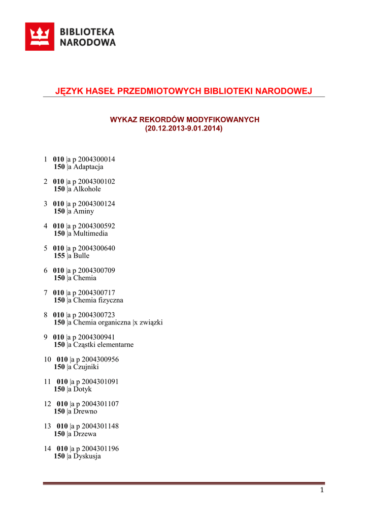 JĘZYK HASEŁ PRZEDMIOTOWYCH BIBLIOTEKI NARODOWEJ WYKAZ REKORDÓW MODYFIKOWANYCH (20.12.2013-9.01.2014) 1 010 |a p 2004300014 150 |a Adaptacja 2 010 |a p 2004300102 150 |a Alkohole 3 010 |a p 2004300124 150 |a Aminy 4 010 |a p 2004300592 150 |a Multimedia 5 010 |a p 2004300640 155 |a Bulle 6 010 |a p 2004300709 150 |a Chemia 7 010 |a p 2004300717 150 |a Chemia fizyczna 8 010 |a p 2004300723 150 |a Chemia organiczna |x związki 9 010 |a p 2004300941 150 |a Cząstki elementarne 10 010 |a p 2004300956 150 |a Czujniki 11 010 |a p 2004301091 150 |a Dotyk 12 010 |a p 2004301107 150 |a Drewno 13 010 |a p 2004301148 150 |a Drzewa 14 010 |a p 2004301196 150 |a Dyskusja 1 15 010 |a p 2004301236 150 |a Dźwignice 16 010 |a p 2004301253 150 |a Egzaminy 17 010 |a p 2004301263 150 |a Ekologia 18 010 |a p 2004301266 150 |a Ekonomia 19 010 |a p 2004301269 150 |a Ekonomiści 20 010 |a p 2004301271 150 |a Ekspertyza 21 010 |a p 2004301312 150 |a Elektrony 22 010 |a p 2004301379 150 |a Enzymy 23 010 |a p 2004301475 155 |a Ewangeliarze 24 010 |a p 2004301502 150 |a Fantastyka naukowa 25 010 |a p 2004301503 155 |a Literatura fantastycznonaukowa 26 010 |a p 2004301533 150 |a Filatelistyka 27 010 |a p 2004301897 150 |a Święta |x chrześcijaństwo 28 010 |a p 2004301918 155 |a Grafika użytkowa 29 010 |a p 2004301967 150 |a Gry i zabawy 30 010 |a p 2004302144 150 |a Hydroliza 31 010 |a p 2004302174 150 |a Ił 32 010 |a p 2004302200 150 |a Informatycy 33 010 |a p 2004302202 150 |a Infrastruktura społeczna 34 010 |a p 2004302251 150 |a Inwestycje 2 35 010 |a p 2004302293 150 |a Jałowiec pospolity 36 010 |a p 2004302350 150 |a Język akadyjski 37 010 |a p 2004302354 150 |a Język angielski 38 010 |a p 2004302518 150 |a Język perski 39 010 |a p 2004302539 150 |a Język serbsko-chorwacki 40 010 |a p 2004302705 150 |a Kabaret 41 010 |a p 2004302713 150 |a Kadry |x administracja 42 010 |a p 2004302716 150 |a Kadry |x polityka 43 010 |a p 2004302849 150 |a Kawaleria 44 010 |a p 2004303048 150 |a Konstytucja 45 010 |a p 2004303159 150 |a Kradzież 46 010 |a p 2004303432 150 |a Leki 47 010 |a p 2004303524 155 |a Literatura |x rodzaje i gatunki 48 010 |a p 2004303573 155 |a Literatura czeska 49 010 |a p 2004303580 150 |a Instrumenty muzyczne mechaniczne 50 010 |a p 2004303673 155 |a Literatura niemiecka 51 010 |a p 2004303688 155 |a Literatura perska 52 010 |a p 2004303845 150 |a Łączność satelitarna 53 010 |a p 2004303893 150 |a Magnetyzm 3 54 010 |a p 2004304059 150 |a Mechanika kwantowa 55 010 |a p 2004304072 150 |a Zawody medyczne 56 010 |a p 2004304283 150 |a Uczniowie 57 010 |a p 2004304491 150 |a Sobór 58 010 |a p 2004304527 150 |a Sól kamienna 59 010 |a p 2004304581 150 |a Spółdzielczość pracy 60 010 |a p 2004304787 150 |a Systemy informatyczne 61 010 |a p 2004304879 150 |a Sztuka 62 010 |a p 2004304903 150 |a Sztuka armeńska 63 010 |a p 2004304928 150 |a Sztuka chorwacka 64 010 |a p 2004305426 150 |a Transmisja danych 65 010 |a p 2004305643 150 |a Urzędnicy 66 010 |a p 2004305884 150 |a Woda morska 67 010 |a p 2004306073 150 |a Wybory 68 010 |a p 2004306248 150 |a Zawód 69 010 |a p 2004306250 150 |a Szkolenie zawodowe 70 010 |a p 2004306362 150 |a Związki cykliczne 71 010 |a p 2004306419 150 |a Żłobki 72 010 |a p 2004306468 150 |a Mowa |x zaburzenia 73 010 |a p 2004306535 150 |a Mydła 4 74 010 |a p 2004306574 150 |a Nałóg 75 010 |a p 2004306636 150 |a Nauczyciele 76 010 |a p 2004306814 150 |a Obyczaje 77 010 |a p 2004306944 150 |a Opinia publiczna 78 010 |a p 2004307121 150 |a Państwo |x ustrój 79 010 |a p 2004307376 150 |a Płeć 80 010 |a p 2004307576 150 |a Poradnictwo 81 010 |a p 2004307577 150 |a Poradnictwo zawodowe 82 010 |a p 2004307893 150 |a Przestępczość 83 010 |a p 2004307901 150 |a Przestępstwo przeciw wolności seksualnej i obyczajności 84 010 |a p 2004307971 150 |a Psychologia |x metodologia 85 010 |a p 2004308000 155 |a Publicystyka 86 010 |a p 2004308100 150 |a Reakcje chemiczne 87 010 |a p 2004308124 150 |a Reklama 88 010 |a p 2004308224 150 |a Rola społeczna 89 010 |a p 2004308311 150 |a Rozpuszczalniki 90 010 |a p 2004308417 150 |a Rzemiosło artystyczne 91 010 |a p 2004308678 150 |a Socjalizacja 92 010 |a p 2004308767 150 |a Internet 5 93 010 |a p 2004309119 150 |a Zamówienia publiczne 94 010 |a p 2004309363 155 |a Muzyka na akordeon 95 010 |a p 2004309438 150 |a Rachunkowość zarządcza 96 010 |a p 2004309526 150 |a Programy wydawnicze 97 010 |a p 2004309647 155 |a Mszały 98 010 |a p 2004310036 155 |a Film rosyjski 99 010 |a p 2004310131 155 |a Poezja angielska 100 010 |a p 2004310171 150 |a Strony WWW 101 010 |a p 2004310505 150 |a Poliestry 102 010 |a p 2004310515 150 |a Terapia zajęciowa 103 010 |a p 2004310652 180 |x histologia 104 010 |a p 2004310777 180 |x wyrazy obce 105 010 |a p 2004311061 150 |a Etylen |x związki 106 010 |a p 2004311197 150 |a Testy psychologiczne 107 010 |a p 2004311273 150 |a Obrona konieczna 108 010 |a p 2004311302 150 |a Intranet 109 010 |a p 2004311306 150 |a Multimedia |x stosowanie |x nauczanie 110 010 |a p 2004311320 150 |a Animacja komputerowa 111 010 |a p 2004311361 150 |a Komunikacja niewerbalna 112 010 |a p 2004311645 150 |a Pocałunek 6 113 010 |a p 2004311683 150 |a Analitycy ekonomiczni 114 010 |a p 2004311842 150 |a Racjonalność 115 010 |a p 2004312045 151 |a Peru |y 16 w. 116 010 |a p 2004312150 150 |a Menedżerowie 117 010 |a p 2004312254 150 |a Controlling 118 010 |a p 2004312403 155 |a Muzyka na orkiestrę 119 010 |a p 2004312439 155 |a Muzyka skrzypcowa 120 010 |a p 2004312462 155 |a Koncert (utwór muz.) 121 010 |a p 2004312602 155 |a Literatura fantastycznonaukowa czeska 122 010 |a p 2004313080 150 |a Biegli rewidenci 123 010 |a p 2004313170 155 |a Wizerunki maryjne 124 010 |a p 2004314124 155 |a Film amerykański 125 010 |a p 2004314270 155 |a Powieść amerykańska 126 010 |a p 2004314271 155 |a Powieść angielska 127 010 |a p 2004314343 155 |a Powieść polska 128 010 |a p 2004314348 155 |a Powieść 