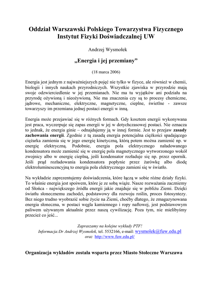 Oddział Warszawski Polskiego Towarzystwa Fizycznego Instytut Fizyki Doświadczalnej UW Andrzej Wysmołek „Energia i jej przemiany” (18 marca 2006) Energia jest jednym z najważniejszych pojęć nie tylko w fizyce, ale również w chemii, biologii i innych naukach przyrodniczych. Wszystkie zjawiska w przyrodzie mają swoje odzwierciedlenie w jej przemianach. Nie ma tu wyjątków ani podziału na przyrodę ożywioną i nieożywioną. Nie ma znaczenia czy są to procesy chemiczne, jądrowe, mechaniczne, elektryczne, magnetyczne, cieplne, świetlne - zawsze towarzyszy im przemiana jednej postaci energii w inną. Energia może przejawiać się w różnych formach. Gdy kosztem energii wykonywana jest praca, wyczerpuje się zapas energii w jej w dotychczasowej postaci. Nie oznacza to jednak, że energia ginie – odnajdujemy ją w innej formie. Jest to przejaw zasady zachowania energii. Zgodnie z tą zasadą energia potencjalna ciężkości spadającego ciężarka zamienia się w jego energię kinetyczną, którą potem można zamienić np. w energię elektryczną. Podobnie, energia pola elektrycznego naładowanego kondensatora może zamienić się w energię pola magnetycznego wytworzonego wokół zwojnicy albo w energię cieplną, jeśli kondensator rozładuje się np. przez opornik. Jeśli prąd rozładowania kondensatora popłynie przez żarówkę albo diodę elektroluminescencyjną to energia pola elektrycznego zamieni się w światło. Na wykładzie zaprezentujemy doświadczenia, które łączą w sobie różne działy fizyki. To właśnie energia jest spoiwem, które je ze sobą wiąże. Nasze rozważania zaczniemy od Słońca - największego źródła energii jakie znajduje się w pobliżu Ziemi. Dzięki światłu słonecznemu zachodzi, podstawowy dla rozwoju roślin, proces fotosyntezy. Bez niego trudno wyobrazić sobie życie na Ziemi, choćby dlatego, że zmagazynowana energia słoneczna, w postaci węgla kamiennego i ropy naftowej, jest podstawowym paliwem używanym aktualnie przez naszą cywilizację. Poza tym, nie mielibyśmy przecież co jeść... Zapraszamy na kolejne wykłady PTF! Informacja:Dr Andrzej Wysmołek, tel. 5532166, e-mail: [email protected] oraz http://www.fuw.edu.pl/ Organizacja wykładów została wsparta przez Miasto Stołeczne Warszawa