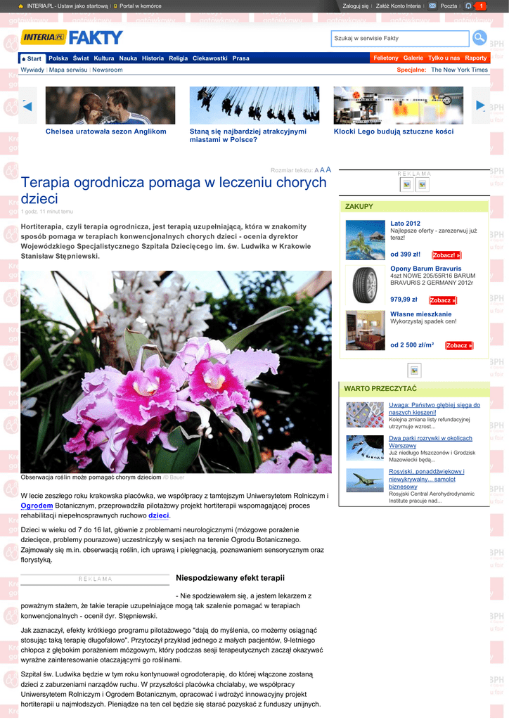 INTERIA.PL - Ustaw jako startową Portal w komórce Zaloguj się Załóż Konto Interia Poczta Ding 1 Szukaj w serwisie Fakty Start Felietony Galerie Tylko u nas Raporty Polska Świat Kultura Nauka Historia Religia Ciekawostki Prasa Wywiady Mapa serwisu Newsroom Specjalne: The New York Times Chelsea uratowała sezon Anglikom Staną się najbardziej atrakcyjnymi miastami w Polsce? Klocki Lego budują sztuczne kości Rozmiar tekstu: A A A Terapia ogrodnicza pomaga w leczeniu chorych dzieci ZAKUPY 1 godz. 11 minut temu Lato 2012 Hortiterapia, czyli terapia ogrodnicza, jest terapią uzupełniającą, która w znakomity sposób pomaga w terapiach konwencjonalnych chorych dzieci - ocenia dyrektor Wojewódzkiego Specjalistycznego Szpitala Dziecięcego im. św. Ludwika w Krakowie Stanisław Stępniewski. Najlepsze oferty - zarezerwuj już teraz! od 399 zł! Zobacz! » Opony Barum Bravuris 4szt NOWE 205/55R16 BARUM BRAVURIS 2 GERMANY 2012r 979,99 zł Zobacz » Własne mieszkanie Wykorzystaj spadek cen! od 2 500 zł/m² Zobacz » WARTO PRZECZYTAĆ Uwaga: Państwo głębiej sięga do naszych kieszeni! Kolejna zmiana listy refundacyjnej utrzymuje wzrost... Dwa parki rozrywki w okolicach Warszawy Już niedługo Mszczonów i Grodzisk Mazowiecki będą... Rosyjski, ponaddźwiękowy i niewykrywalny... samolot biznesowy Obserwacja roślin może pomagać chorym dzieciom /© Bauer W lecie zeszłego roku krakowska placówka, we współpracy z tamtejszym Uniwersytetem Rolniczym i Ogrodem Botanicznym, przeprowadziła pilotażowy projekt hortiterapii wspomagającej proces rehabilitacji niepełnosprawnych ruchowo dzieci. Dzieci w wieku od 7 do 16 lat, głównie z problemami neurologicznymi (mózgowe porażenie dziecięce, problemy pourazowe) uczestniczyły w sesjach na terenie Ogrodu Botanicznego. Zajmowały się m.in. obserwacją roślin, ich uprawą i pielęgnacją, poznawaniem sensorycznym oraz florystyką. Niespodziewany efekt terapii - Nie spodziewałem się, a jestem lekarzem z poważnym stażem, że takie terapie uzupełniające mogą tak szalenie pomagać w terapiach konwencjonalnych - ocenił dyr. Stępniewski. Jak zaznaczył, efekty krótkiego programu pilotażowego "dają do myślenia, co możemy osiągnąć stosując taką terapię długofalowo". Przytoczył przykład jednego z małych pacjentów, 9-letniego chłopca z głębokim porażeniem mózgowym, który podczas sesji terapeutycznych zaczął okazywać wyraźne zainteresowanie otaczającymi go roślinami. Szpital św. Ludwika będzie w tym roku kontynuował ogrodoterapię, do której włączone zostaną dzieci z zaburzeniami narządów ruchu. W przyszłości placówka chciałaby, we współpracy Uniwersytetem Rolniczym i Ogrodem Botanicznym, opracować i wdrożyć innowacyjny projekt hortiterapii u najmłodszych. Pieniądze na ten cel będzie się starać pozyskać z funduszy unijnych. Rosyjski Central Aerohydrodynamic Institute pracuje nad... "Odzew przeszedł oczekiwania" W czwartek w Uniwersytecie Rolniczym w Krakowie odbyła się pierwsza ogólnopolska konferencja "Hortiterapia - stan obecny i perspektywy rozwoju terapii ogrodniczych". Cieszyła się bardzo dużym zainteresowaniem lekarzy, psychologów, terapeutów i ogrodników z całego kraju. - Odzew przeszedł nasze oczekiwania. Przyjechało wiele osób z całej Polski, różnych specjalności oceniła prof. Anna Bach kierownik Katedry Roślin Ozdobnych Uniwersytetu Rolniczego. Według niej krakowskie spotkanie może być impulsem do uruchomienia procesu kształcenia zawodowego w tej dziedzinie. - Hortiterapia to magiczne słowo, która dla każdego z nas ma oddźwięk pozytywny. Jest to terapia, która polega na włączeniu ogrodnictwa do metod terapeutycznych, pozwalających na poprawienie stanu zdrowia - wyjaśniła. W Polsce terapia nie jest jeszcze tak popularna Jak dodała terapia ogrodnicza dzieli się na bierną: polegającą na przebywaniu w otoczeniu przyrody i kontemplowaniu jej oraz czynną związaną z wykonywaniem wielu zabiegów ogrodniczych, jak np. wysiew nasion, pielęgnacja roślin, zbiór owoców. Metoda jest już od dawna popularna w Stanach Zjednoczonych, Kanadzie, Japonii czy krajach starej UE. W Polsce - oceniła prof. Bach - dopiero przecieramy szlaki, choć wiele placówek leczniczych i rehabilitacyjnych stosuje hortiterapię, jako metodę terapeutyczną, ale bez świadomości, iż można ją ująć w ramy metodyczne i korzystać z pomocy specjalistów. W krakowskim Uniwersytecie Rolniczym nauczanie tego przedmiotu wprowadzono w zeszłym roku akademickim. Jest on obowiązkowy dla studentów specjalizacji rośliny ozdobne. Prowadzi go dr Bożena Szewczyk-Taranek z Katedry Roślin Ozdobnych UR. Powiadom mnie Kraków więcej o: chore dzieci, dzieci, terapia, Kraków, kwiaty, Lekarze, pacjenci Oceń artykuł: zobacz ranking » 100% 0% + Wykop Tweet 0 Prześlij Czy doczekasz starości Ile dzieci urodzisz? Naukowy kalkulator długości życia. Sprawdź ile lat Ci jeszcze zostało Nie żyj dłużej w niepewności! Dowiedz s ię ile urodzisz dzieci. GALERIE ZDJĘĆ Belgia w żałobie po katastrofie autokaru Pierwsze Damy na niebiesko liczba zdjęć: 11 liczba zdjęć: 18 Polacy jadą na Święto Narodowe Węgier liczba zdjęć: 16 WASZE KOMENTARZE dodaj komentarz NAJCIEKAWSZE TEMATY NA FORUM Wypada zapytać: Ile zarabiasz? Twój komentarz może być pierwszy! Nauczyciel - trudny zawód Czy Polska powinna przyjąć walutę euro? Zaloguj się lub załóż Konto Interia i korzystaj z dodatkowych opcji. Afera solna NAJCZĘŚCIEJ KOMENTOWANE ARTYKUŁY Piszesz jako Gość Treść: * znaków do wpisania: 4000 1. Stolica: Manifestacja PiS ws. wieku emerytalnego komentarzy: 2208 2. Rząd: Niech Kościół sam płaci składki na ubezpieczenie duchownych komentarzy: 827 3. Komorowski: To jedyny moment, gdy możemy przeprowadzić reformę emerytalną 5 komentarzy: 678 6 Podpis: * System powiadomień Ding poinformuje Cię o odpowiedziach na Twój komentarz. Przejdź do Dinga b c d 
