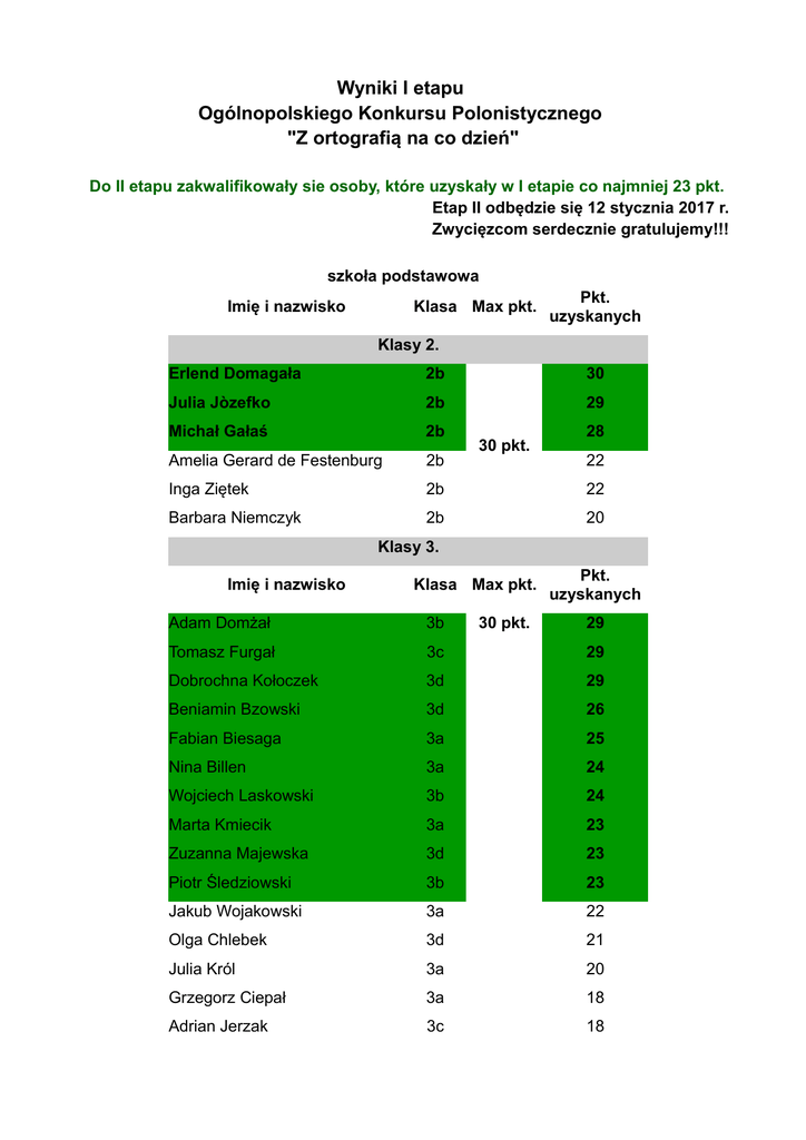 Wyniki I etapu Ogólnopolskiego Konkursu Polonistycznego "Z ortografią na co dzień" Do II etapu zakwalifikowały sie osoby, które uzyskały w I etapie co najmniej 23 pkt. Etap II odbędzie się 12 stycznia 2017 r. Zwycięzcom serdecznie gratulujemy!!! szkoła podstawowa Imię i nazwisko Klasa Max pkt. Pkt. uzyskanych Klasy 2. Erlend Domagała 2b 30 Julia Jòzefko 2b 29 Michał Gałaś 2b Amelia Gerard de Festenburg 2b Inga Ziętek 2b 22 Barbara Niemczyk 2b 20 30 pkt. 28 22 Klasy 3. Imię i nazwisko Klasa Max pkt. 30 pkt. Pkt. uzyskanych Adam Domżał 3b 29 Tomasz Furgał 3c 29 Dobrochna Kołoczek 3d 29 Beniamin Bzowski 3d 26 Fabian Biesaga 3a 25 Nina Billen 3a 24 Wojciech Laskowski 3b 24 Marta Kmiecik 3a 23 Zuzanna Majewska 3d 23 Piotr Śledziowski 3b 23 Jakub Wojakowski 3a 22 Olga Chlebek 3d 21 Julia Król 3a 20 Grzegorz Ciepał 3a 18 Adrian Jerzak 3c 18 Wiktoria Kasperzec 3d 16 Hania Mirowska 3a 15 Jan Stoianov 3a 15 Nikola Malinowska 3b 14 Pola Gawenda 3a 13 Natalia Siwik 3a 11 Klasy 4. Imię i nazwisko klasa Max pkt. Pkt. uzyskanych Franciszek Dynda 4a 30 Michalina Dynda 4a 30 Maria Ślusarczyk 4a 30 Wojciech Pałys 4a 22 Maciej Wróblewski 4c Adam Kubiena 4c 19 Ania Klimek 4c 10 Kamila Jurkowska 4a 14 Łukasz Krawczyk 4a 9 30 pkt. 21 Klasy 5. Imię i nazwisko Klasa Max pkt. Amelia Niewdana 5b Wiktor Orłowski 5b 30 pkt. Pkt. uzyskanych 20 9 Klasy 6. Imię i nazwisko Klasa Max pkt. 30 pkt. Pkt. uzyskanych Inga Nawrot 6b 28 Małgorzata Opydo 6b 26 Katarzyna Neuberg 6b 22 Ignacy Lippa 6b 21 Aleksandra Mrzygłód 6a 21 Pola Panasiuk 6c 20 Joanna Siwek 6a 19 Stanisław Gwiazda 6b 17 Katarzyna Klimek 6b 17 Szymon Rosiek 6b 15 Klaudia Makowska 6c 14 Natalia Pilch 6a 14 Tadeusz Widz 6b 13 Zuzanna Borek 6a 10 Kamil Kwiatkowski 6a 10 Marta Hayduk 6a 6 GIMNAZJUM Klasy I Imię i naziwsko Klasa Max pkt. 30 pkt. Pkt. uzyskanych Katarzyna Chmielowska 1a 26 Antoni Ciągała 1a 25 Monika Natkaniec 1a 25 Stanisław Czoba 1d 24 Paweł Stojak 1a 23 Zuzanna Broszkiewicz 1a 22 Zofia Socha 1a 21 Weronika Przybyło 1a 20 Bartłomiej Wesołowski 1a 20 Weronika Duda 1c 19 Magdalena Kajdrowicz 1d 19 Oliwia Olszak 1a 19 Anna Kowalczuk 1c 18 Natalia Wydmańska 1c 17 Emilia Rychlicka 1a 16 Antoni Baran 1d 14 Maciej Więckowski 1d 12 Anna Wilk 1b 12 Hanna Flajszer 1b 11 Katarzyna Gaździńska 1c 11 Katarzyna Helbin 1d 11 Jan Walczak 1c 11 Aleksandra Korpas 1b 10 Patryk Leśniak 1d 10 Kacper Prusek 1d 10 Adam Styrna 1d 10 Zofia Lechowicz 1d 5 Jan Pagacz 1c 3 Hanna Klich 1c 2 Klasy II Imię i naziwsko Klasa Max pkt. Pkt. uzyskanych Agnieszka Fudali 2c 25 Martyna Leśniak 2c 25 Wiktoria Majewska 2c 25 Kacper Sawczak 2c 25 Maja Liszkiewicz 2b Gabriel Starosielec 2b 21 Amelia Głowacka 2b 20 Jakub Rusinek 2a 13 Pola Czubak 2b 11 30 pkt. 21 Klasy III Klasa Max pkt. Pkt. uzyskanych Tomasz Ślusarczyk 3a 30 pkt. 29 Olga Kotula 3b 26 Milena Muniak 3a 26 Zuzanna Nepelska 3b 26 Maja Szostek 3b 25 Antoni Żminkowski 3b 23 Wiktor Paleczny 3b 24 Małgorzata Niziołek 3c 22 Magdalena Suszyna 3b 22 Agnieszka Szpotowska 3c 22 Piotr Pichór 3a 20 Wojciech Karski 3d 17 Filip Skałka 3d 16 Kacper Bugała 3d 12 Imię i naziwsko Jonas Weßling 3d 10 Liceum Imię i naziwsko Paulina Gąsiorek Klasa Max pkt. 2g 30 pkt. Pkt. uzyskanych 23 Do II etapu zakwalifikowały sie osoby, które uzyskały w I etapie co najmniej 23 pkt. Etap II odbędzie się 12 stycznia 2017 r. Zwycięzcom serdecznie gratulujemy!!!