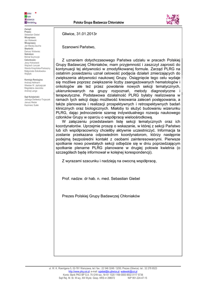 Polska Grupa Badawcza Chłoniaków Zarząd: Prezes: Sebastian Giebel Wiceprezes: Jan Walewski Wiceprezes: Jan Maciej Zaucha Skarbnik: Dariusz Wołowiec Sekretarz: Michał Szymczyk Członkowie: Jerzy Hołowiecki Wojciech Jurczak Wanda Knopińska-Posłuszny Małgorzata SokołowskaWojdyło Komisja Rewizyjna: Andrzej Hellmann Wiesław W. Jędrzejczak Magdalena Jaworska Andrzej Lange Sąd Koleżeński: Jadwiga Dwilewicz-Trojaczek Janusz Meder Kazimierz Sułek Gliwice, 31.01.2013r Szanowni Państwo, Z uznaniem dotychczasowego Państwa udziału w pracach Polskiej Grupy Badawczej Chłoniaków, mam przyjemność i zaszczyt zaprosić do kontynuacji tej aktywności w zmodyfikowanej formule. Zarząd PLRG na ostatnim posiedzeniu uznał celowość podjęcia działań zmierzających do zwiększenia aktywności naukowej Grupy. Osiągnięcie tego celu wydaje się możliwe poprzez zwiększenie liczby zaangażowanych hematologów i onkologów ale też przez powołanie nowych sekcji tematycznych, ukierunkowanych na grupy rozpoznań, metody diagnostyczne i terapeutyczne. Podstawowa działalność PLRG byłaby realizowana w ramach tych sekcji dając możliwość kreowania zaleceń postępowania, a także planowania i realizacji prospektywnych i retrospektywnych badań klinicznych oraz biologicznych. Miałoby to służyć budowaniu wizerunku PLRG, dając jednocześnie szansę indywidualnego rozwoju naukowego członków Grupy w oparciu o współpracę wieloośrodkową. W załączeniu przedstawiam listę sekcji tematycznych oraz ich koordynatorów. Uprzejmie proszę o wskazanie, w której z sekcji Państwo lub ich współpracownicy chcieliby aktywnie uczestniczyć. Informacja ta zostanie przekazana odpowiednim koordynatorom, którzy następnie podejmą bezpośredni kontakt z osobami zainteresowanymi. Pierwsze spotkanie nowo powstałych sekcji odbędzie się w dniu poprzedzającym spotkanie plenarne PLRG planowane w drugiej połowie kwietnia (o szczegółach będę informował w kolejnej korespondencji). Z wyrazami szacunku i nadzieją na owocną współpracę, Prof. nadzw. dr hab. n. med. Sebastian Giebel Prezes Polskiej Grupy Badawczej Chłoniaków ul. W. K. Roentgena 5, 02-781 Warszawa, tel./ fax.: 22 546 3248 / 3250; Prezes (Gliwice): tel.: 32 278 8523 http://www.plrg.coi.pl; e-mail: [email protected]; [email protected] Konto: Bank PKO BP S.A. 75 O/W-wa , Nr 61 1020 1169 0000 8502 0117 5736 Sąd Rej. M. St. W-wy, XIII Wydz. Gosp. KRS nr 298072 NIP 951-224-47-15 Polska Grupa Badawcza Chłoniaków Sekcje tematyczne (proszę o wpisanie osób zainteresowanych w trzeciej kolumnie i odesłanie tabeli fax. 32-2789149 lub [email protected]) Sekcja Koordynator Członkowie (imię nazwisko, e.mail) Chłoniaki skórne Małgorzata Sokołowska-Wojdyło (UM Gdańsk) Chłoniaki agresywne B- Wanda Knopińska-Posłuszny komórkowe (SMSW Olsztyn) Chłoniaki indolentne B- Ewa Kalinka-Warzocha komórkowe (WSS Łódź) Chłoniak z komórek Michał Szymczyk płaszcza (COI Warszawa) Chłoniaki T-komórkowe Ewa Chmielowska (CO Bydgoszcz) Chłoniak Hodgkina Jan Maciej Zaucha (SM Gdynia) Diagnostyka PET Bogdan Małkowski (CO Bydgoszcz) Histopatologia Monika Prochorec-Sobieszek (IHiT Warszawa) Immunobiologia Jacek Roliński (UM Lublin) Radioterapia Leszek Miszczyk (COI Gliwice) Transplantacje komórek Sebastian Giebel krwiotwórczych (COI Gliwice) Ośrodek: Kierownik: Tel: Fax: E.mail: ul. W. K. Roentgena 5, 02-781 Warszawa, tel./ fax.: 22 546 3248 / 3250; Prezes (Gliwice): tel.: 32 278 8523 http://www.plrg.coi.pl; e-mail: [email protected]; [email protected] Konto: Bank PKO BP S.A. 75 O/W-wa , Nr 61 1020 1169 0000 8502 0117 5736 Sąd Rej. M. St. W-wy, XIII Wydz. Gosp. KRS nr 298072 NIP 951-224-47-15