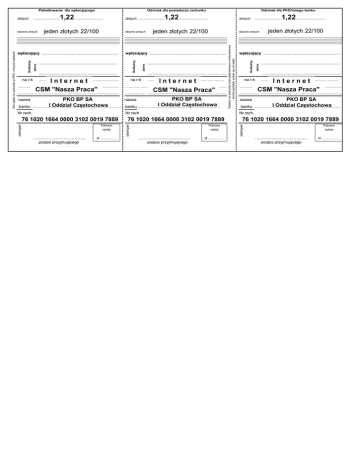 ..................................................................... banku słownie złotych .................................................................... .................................................................... .................................................................. II nn tt ee rr nn ee tt CSM "Nasza Praca" ..................................................................... ........................ ..................................................................... ................. PKO BP SA PKO BP SA nazwa I Oddział Częstochowa I Oddział Częstochowa ............................................................................... banku ....................................................................... Nr rach. Nr rach. 76 1020 1664 0000 3102 0019 7889 Pobrano opłatę ...................................... podpis przyjmującego zł ................ jeden złotych 22/100 wpłacający .................................................................. na r-k .................................................................... .................................................................... ................................................................... Internet CSM "Nasza Praca" ................. ..................................................................... ........................ ..................................................................... nazwa PKO BP SA I Oddział Częstochowa banku .......................................................................... Nr rach. 76 1020 1664 0000 3102 0019 7889 stempel nazwa na r-k 1,22......................... ....................... adres .................................................................... Internet CSM "Nasza Praca" ................. ..................................................................... jeden złotych 22/100 wpłacający .................................................................. .................................................................... ........................ ..................................................................... złotych Dokładny słownie złotych adres adres Dokładny na r-k Odcinek dla PKO/innego banku 1,22......................... złotych ....................... Wpłaty na rachunki oszczędnościowo-rozliczeniowe - konta osobiste wolne są od opłat jeden złotych 22/100 wpłacający .................................................................. stempel Dla wpłat na rachunki w PKO i innych bankach słownie złotych Odcinek dla posiadacza rachunku 1,22......................... Dokładny ....................... Pobrano opłatę ...................................... podpis przyjmującego zł ................ 76 1020 1664 0000 3102 0019 7889 stempel Pokwitowanie dla wpłacającego złotych Pobrano opłatę ...................................... podpis przyjmującego zł ..................