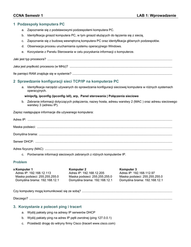 CCNA Semestr 1 LAB 1: Wprowadzenie 1 Podzespoły komputera PC a. Zapoznanie się z podstawowymi podzespołami komputera PC. b. Identyfikacja gniazd komputera PC, w tym gniazd służących do łączenia się z siecią. c. Zapoznanie się z budową wewnętrzną komputera PC oraz identyfikacja głównych podzespołów. d. Obserwacja procesu uruchamiania systemu operacyjnego Windows. e. Korzystanie z Panelu Sterowania w celu pozyskania informacji o komputerze. Jaki jest typ procesora? ................................................................................................................................................. Jaka jest prędkość procesora (w MHz)? ....................................................................................................................... Ile pamięci RAM znajduje się w systemie? .................................................................................................................... 2 Sprawdzanie konfiguracji sieci TCP/IP na komputerze PC a. Identyfikacja narzędzi używanych do sprawdzania konfiguracji sieciowej komputera w różnych systemach operacyjnych. winipcfg, ipconfig (ipconfig /all), arp, Panel sterowania | Połączenia sieciowe b. Zebranie informacji dotyczących połączenia, nazwy hosta, adresu warstwy 2 (MAC ) oraz adresu sieciowego warstwy 3 (adresu IP). Zapisz następujące informacje dla używanego komputera: Adres IP: ........................................................................................................................................................................ Maska podsieci: ............................................................................................................................................................. Domyślna brama: ........................................................................................................................................................... Serwer DHCP: ............................................................................................................................................................... Adres fizyczny (MAC) .................................................................................................................................................... c. Porównanie informacji sieciowych zebranych z różnych komputerów IP. Problem x Komputer 1 Adres IP: 192.168.12.113 Maska podsieci: 255.255.255.0 Domyślna brama: 192.168.12.1 Komputer 2 Adres IP: 192.168.12.205 Maska podsieci: 255.255.255.0 Domyślna brama: 192.168.12.1 Komputer 3 Adres IP: 192.168.112.97 Maska podsieci: 255.255.255.0 Domyślna brama: 192.168.12.1 Czy komputery mogą komunikować się ze sobą? ......................................................................................................... Dlaczego? ...................................................................................................................................................................... 3. Korzystanie z poleceń ping i tracert a. Wyślij pakiety ping na adresy IP serwerów DHCP b. Wyślij pakiety ping na adres IP pętli zwrotnej (ping 127.0.0.1) c. Prześledź drogę do witryny firmy Cisco (tracert www.cisco.com) 4 Konfiguracja sieci TCP/IP na komputerze PC a. Połącz 2 komputery poprzez switch używając kabla prostego, b. Skonfiguruj odpowiednie adresy IP i maski podsieci tak, aby była możliwa komunikacja hostów, c. Sprawdź poprawność połączenia korzystając z komendy ping, d. Używając komendy arp, winipcfg lub ipconfig – określ adres MAC obu komputerów IBM Compatible 5 Instalacja karty sieciowej Zamontuj kartę sieciową NIC IBM Compatible