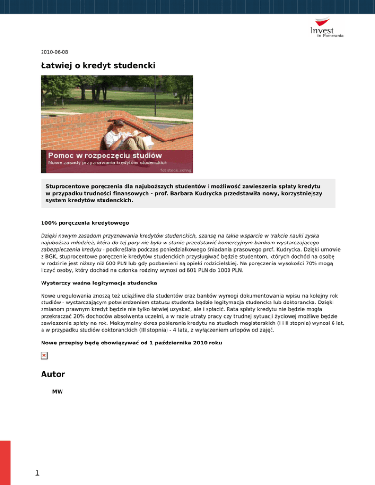 2010-06-08 Łatwiej o kredyt studencki Stuprocentowe poręczenia dla najuboższych studentów i możliwość zawieszenia spłaty kredytu w przypadku trudności finansowych - prof. Barbara Kudrycka przedstawiła nowy, korzystniejszy system kredytów studenckich. 100% poręczenia kredytowego Dzięki nowym zasadom przyznawania kredytów studenckich, szansę na takie wsparcie w trakcie nauki zyska najuboższa młodzież, która do tej pory nie była w stanie przedstawić komercyjnym bankom wystarczającego zabezpieczenia kredytu - podkreślała podczas poniedziałkowego śniadania prasowego prof. Kudrycka. Dzięki umowie z BGK, stuprocentowe poręczenie kredytów studenckich przysługiwać będzie studentom, których dochód na osobę w rodzinie jest niższy niż 600 PLN lub gdy pozbawieni są opieki rodzicielskiej. Na poręczenia wysokości 70% mogą liczyć osoby, który dochód na członka rodziny wynosi od 601 PLN do 1000 PLN. Wystarczy ważna legitymacja studencka Nowe uregulowania znoszą też uciążliwe dla studentów oraz banków wymogi dokumentowania wpisu na kolejny rok studiów - wystarczającym potwierdzeniem statusu studenta będzie legitymacja studencka lub doktorancka. Dzięki zmianom prawnym kredyt będzie nie tylko łatwiej uzyskać, ale i spłacić. Rata spłaty kredytu nie będzie mogła przekraczać 20% dochodów absolwenta uczelni, a w razie utraty pracy czy trudnej sytuacji życiowej możliwe będzie zawieszenie spłaty na rok. Maksymalny okres pobierania kredytu na studiach magisterskich (I i II stopnia) wynosi 6 lat, a w przypadku studiów doktoranckich (III stopnia) - 4 lata, z wyłączeniem urlopów od zajęć. Nowe przepisy będą obowiązywać od 1 października 2010 roku Autor MW 1