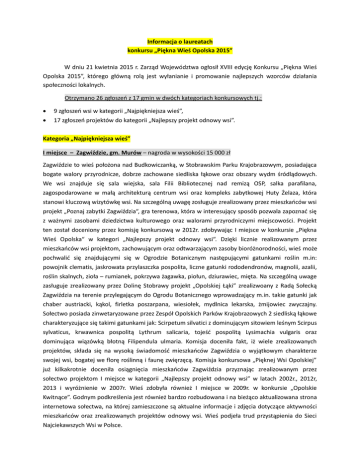 Informacja o laureatach konkursu „Piękna Wieś Opolska 2015” W dniu 21 kwietnia 2015 r. Zarząd Województwa ogłosił XVIII edycję Konkursu „Piękna Wieś Opolska 2015”, którego główną rolą jest wyłanianie i promowanie najlepszych wzorców działania społeczności lokalnych. Otrzymano 26 zgłoszeń z 17 gmin w dwóch kategoriach konkursowych tj.: 9 zgłoszeń wsi w kategorii „Najpiękniejsza wieś”, 17 zgłoszeń projektów do kategorii „Najlepszy projekt odnowy wsi”. Kategoria „Najpiękniejsza wieś” I miejsce – Zagwiździe, gm. Murów – nagroda w wysokości 15 000 zł Zagwiździe to wieś położona nad Budkowiczanką, w Stobrawskim Parku Krajobrazowym, posiadająca bogate walory przyrodnicze, dobrze zachowane siedliska łąkowe oraz obszary wydm śródlądowych. We wsi znajduje się sala wiejska, sala Filii Bibliotecznej nad remizą OSP, salka parafilana, zagospodarowane w małą architekturą centrum wsi oraz kompleks zabytkowej Huty Żelaza, która stanowi kluczową wizytówkę wsi. Na szczególną uwagę zosługuje zrealizowany przez mieszkańców wsi projekt „Poznaj zabytki Zagwiździa“, gra terenowa, która w interesujący sposób pozwala zapoznać się z ważnymi zasobami dziedzictwa kulturowego oraz walorami przyrodniczymi miejscowości. Projekt ten został doceniony przez komisję konkursową w 2012r. zdobywając I miejsce w konkursie „Piękna Wieś Opolska“ w kategori „Najlepszy projekt odnowy wsi“. Dzięki licznie realizowanym przez mieszkańców wsi projektom, zachowującym oraz odtwarzającym zasoby bioróżnorodności, wieś może pochwalić się znajdującymi się w Ogrodzie Botanicznym następującymi gatunkami roślin m.in: powojnik clematis, jaskrowata przylaszczka pospolita, liczne gatunki rododendronów, magnolii, azalii, roślin skalnych, zioła – rumianek, pokrzywa żagawka, piołun, dziurawiec, mięta. Na szczególną uwage zasługuje zrealizowany przez Dolinę Stobrawy projekt „Opolskiej Łąki” zrealizwoany z Radą Sołecką Zagwiździa na terenie przylegającym do Ogrodu Botanicznego wprowadzający m.in. takie gatunki jak chaber austriacki, kąkol, firletka poszarpana, wiesiołek, mydlnica lekarska, żmijowiec zwyczajny. Sołectwo posiada zinwetaryzowane przez Zespół Opolskich Parków Krajobrazowych 2 siedliską łąkowe charakteryzujące się takimi gatunkami jak: Scirpetum silvatici z dominującym sitowiem leśnym Scirpus sylvaticus, krwawnica pospolitą Lythrum salicaria, tojeść pospolitą Lysimachia vulgaris oraz dominująca wiązówką błotną Filipendula ulmaria. Komisja doceniła fakt, iż wiele zrealizowanych projektów, składa się na wysoką świadomość mieszkańców Zagwiździa o wyjątkowym charakterze swojej wsi, bogatej we florę roślinną i faunę zwięrzęcą. Komisja konkursowa „Pięknej Wsi Opolskiej” już kilkakrotnie doceniła osiągnięcia mieszkańców Zagwiździa przyznając zrealizowanym przez sołectwo projektom I miejsce w kategorii „Najlepszy projekt odnowy wsi” w latach 2002r., 2012r, 2013 i wyróżnienie w 2007r. Wieś zdobyła również I miejsce w 2009r. w konkursie „Opolskie Kwitnące”. Godnym podkreślenia jest również bardzo rozbudowana i na bieżąco aktualizowana strona internetowa sołectwa, na której zamieszczone są aktualne informacje i zdjęcia dotyczące aktywności mieszkańców oraz zrealizowanych projektów odnowy wsi. Wieś podjeła trud przystąpienia do Sieci Najciekawszych Wsi w Polsce. II miejsce – Chróścina, gm. Dąbrowa – nagroda w wysokości 10 000 zł Chróścina to największa w Gminie Dąbrowa miejscowość licząca blisko 1600 mieszkańców. W centralnym punkcie wsi usytuowany jest zabytkowy Kościół parafialny pw. Piotra i Pawła, otoczony zabytkowymi murami cmentarnymi z gotycką bramą dzwonnicową. Z zabytków świeckich pozostały zabudowania folwarczne i wiatrak oraz zrewitalizowany Park Dworski, który pełni obecnie funkcję ogólnodostępnego centrum wsi z miejscem plenerowych spotkań. Na terenie wsi funkcjonuje zespół szkół z salą gimnastyczną i komputerową, przedszkole z placem zabaw, biblioteka publiczna oraz świetlica wiejska mieszcząca się w remizie OSP. Komisja wysoko oceniła współpracę aktywnie działających we wsi Stowarzyszenia Miłośników Chróściny z Kołem Gospodyń Wiejskich, OSP, Klubem Wędkarskim, Kołem Mniejszości Niemieckiej oraz Radą Parafialną. Podkreślić należy bardzo dobrą współpracę na rzecz rozwoju miejscowości w/w organizacji z samorządem gminnym. Godnym zauważenia jest, że wieś zrealizowała przy wykorzystaniu rożnych środków zewnętrznych szereg projektów poprawiających estetykę wsi oraz jakość życia mieszkańców tj. projekt „Szukamy skarbów naszego regionu” – zrealizowany ze środków PROW 2007-2013 , oś 4 Leader cykl wakacyjnych zajęć dla dzieci, projekt „4 Pory Roku w Chróścinie” w ramach Działaj Lokalnie (publikacja kwartalnika i organizacja warsztatów komputerowych dla seniorów), projekt pod patronatem Prezydenta RP „Fundusz Sołecki najlepsza inicjatywa” (wykorzystanie funduszu sołeckiego wraz z pracą mieszkańców na terenie parku), czy dofinansowany ze środków EFRWP projekt „Cztery pory roku” dot. budowy dużej wiaty w parku. Stowarzyszenie jest dwukrotnym laureatem organizowanego przez LGD Partnerstwo Borów Niemodlińskich konkursu na najlepszą organizację pozarządową, natomiast wieś Chróścina jest trzykrotnym laureatem organizowanego przez Gminę Dąbrowa konkursu „Aktywna Wieś”. Skupieni w organizacjach pozarządowych mieszkańcy wsi, przykładają dużą wagę do ochrony przyrody, czego dowodem jest rewitalizacja parku, z wykonaniem nasadzeń drzew i krzewów, budowa i montaż domków lęgowych dla ptaków, budowa skalniaków będących ostoją różnych gatunków płazów i gadów. Na szczególną uwagę, zasługuje również stworzenie odpowiednich warunków w parkowym stawie dla wyst