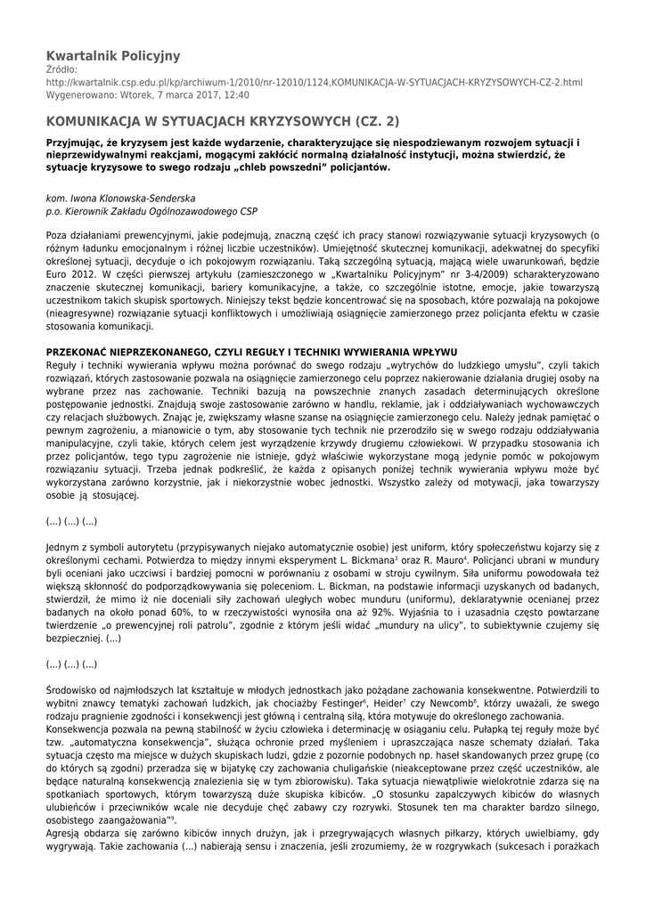 Kwartalnik Policyjny Źródło: http://kwartalnik.csp.edu.pl/kp/archiwum-1/2010/nr-12010/1124,KOMUNIKACJA-W-SYTUACJACH-KRYZYSOWYCH-CZ-2.html Wygenerowano: Wtorek, 7 marca 2017, 12:40 KOMUNIKACJA W SYTUACJACH KRYZYSOWYCH (CZ. 2) Przyjmując, że kryzysem jest każde wydarzenie, charakteryzujące się niespodziewanym rozwojem sytuacji i nieprzewidywalnymi reakcjami, mogącymi zakłócić normalną działalność instytucji, można stwierdzić, że sytuacje kryzysowe to swego rodzaju „chleb powszedni” policjantów. kom. Iwona Klonowska-Senderska p.o. Kierownik Zakładu Ogólnozawodowego CSP Poza działaniami prewencyjnymi, jakie podejmują, znaczną część ich pracy stanowi rozwiązywanie sytuacji kryzysowych (o różnym ładunku emocjonalnym i różnej liczbie uczestników). Umiejętność skutecznej komunikacji, adekwatnej do specyfiki określonej sytuacji, decyduje o ich pokojowym rozwiązaniu. Taką szczególną sytuacją, mającą wiele uwarunkowań, będzie Euro 2012. W części pierwszej artykułu (zamieszczonego w „Kwartalniku Policyjnym” nr 3-4/2009) scharakteryzowano znaczenie skutecznej komunikacji, bariery komunikacyjne, a także, co szczególnie istotne, emocje, jakie towarzyszą uczestnikom takich skupisk sportowych. Niniejszy tekst będzie koncentrować się na sposobach, które pozwalają na pokojowe (nieagresywne) rozwiązanie sytuacji konfliktowych i umożliwiają osiągnięcie zamierzonego przez policjanta efektu w czasie stosowania komunikacji. PRZEKONAĆ NIEPRZEKONANEGO, CZYLI REGUŁY I TECHNIKI WYWIERANIA WPŁYWU Reguły i techniki wywierania wpływu można porównać do swego rodzaju „wytrychów do ludzkiego umysłu”, czyli takich rozwiązań, których zastosowanie pozwala na osiągnięcie zamierzonego celu poprzez nakierowanie działania drugiej osoby na wybrane przez nas zachowanie. Techniki bazują na powszechnie znanych zasadach determinujących określone postępowanie jednostki. Znajdują swoje zastosowanie zarówno w handlu, reklamie, jak i oddziaływaniach wychowawczych czy relacjach służbowych. Znając je, zwiększamy własne szanse na osiągnięcie zamierzonego celu. Należy jednak pamiętać o pewnym zagrożeniu, a mianowicie o tym, aby stosowanie tych technik nie przerodziło się w swego rodzaju oddziaływania manipulacyjne, czyli takie, których celem jest wyrządzenie krzywdy drugiemu człowiekowi. W przypadku stosowania ich przez policjantów, tego typu zagrożenie nie istnieje, gdyż właściwie wykorzystane mogą jedynie pomóc w pokojowym rozwiązaniu sytuacji. Trzeba jednak podkreślić, że każda z opisanych poniżej technik wywierania wpływu może być wykorzystana zarówno korzystnie, jak i niekorzystnie wobec jednostki. Wszystko zależy od motywacji, jaka towarzyszy osobie ją stosującej. (...) (...) (...) Jednym z symboli autorytetu (przypisywanych niejako automatycznie osobie) jest uniform, który społeczeństwu kojarzy się z określonymi cechami. Potwierdza to między innymi eksperyment L. Bickmana3 oraz R. Mauro4. Policjanci ubrani w mundury byli oceniani jako uczciwsi i bardziej pomocni w porównaniu z osobami w stroju cywilnym. Siła uniformu powodowała też większą skłonność do podporządkowywania się poleceniom. L. Bickman, na podstawie informacji uzyskanych od badanych, stwierdził, że mimo iż nie doceniali siły zachowań uległych wobec munduru (uniformu), deklaratywnie ocenianej przez badanych na około ponad 60%, to w rzeczywistości wynosiła ona aż 92%. Wyjaśnia to i uzasadnia często powtarzane twierdzenie „o prewencyjnej roli patrolu”, zgodnie z którym jeśli widać „mundury na ulicy”, to subiektywnie czujemy się bezpieczniej. (...) (...) (...) (...) Środowisko od najmłodszych lat kształtuje w młodych jednostkach jako pożądane zachowania konsekwentne. Potwierdzili to wybitni znawcy tematyki zachowań ludzkich, jak chociażby Festinger6, Heider7 czy Newcomb8, którzy uważali, że swego rodzaju pragnienie zgodności i konsekwencji jest główną i centralną siłą, która motywuje do określonego zachowania. Konsekwencja pozwala na pewną stabilność w życiu człowieka i determinację w osiąganiu celu. Pułapką tej reguły może być tzw. „automatyczna konsekwencja”, służąca ochronie przed myśleniem i upraszczająca nasze schematy działań. Taka sytuacja często ma miejsce w dużych skupiskach ludzi, gdzie z pozornie podobnych np. haseł skandowanych przez grupę (co do których są zgodni) przeradza się w bijatykę czy zachowania chuligańskie (nieakceptowane przez część uczestników, ale będące naturalną konsekwencją znalezienia się w tym zbiorowisku). Taka sytuacja niewątpliwie wielokrotnie zdarza się na spotkaniach sportowych, którym towarzyszą duże skupiska kibiców. „O stosunku zapalczywych kibiców do własnych ulubieńców i przeciwników wcale nie decyduje chęć zabawy czy rozrywki. Stosunek ten ma charakter bardzo silnego, osobistego zaangażowania”9. Agresją obdarza się zarówno kibiców innych drużyn, jak i przegrywających własnych piłkarzy, których uwielbiamy, gdy wygrywają. Takie zachowania (...) nabierają sensu i znaczenia, jeśli zrozumiemy, że w rozgrywkach (sukcesach i porażkach piłkarzy) nie chodzi o rozrywkę, ale o wartość własnej osoby – naszego „ja” budowanego na chwale lub porażce własnych piłkarzy i kibiców innych drużyn. W szczególnie drastycznych przypadkach identyfikacja z jakąś drużyną i zwalczanie innych skutkuje zatracaniem tożsamości. Trudno w takiej sytuacji oddziaływać na jednostkę, zwłaszcza gdy górę biorą zachowania typowe dla tłumu. (...) (...) (...) ASERTYWNOŚĆ – POSTAWĄ WPISUJĄCĄ SIĘ W FILOZOFIĘ TRZECH T (TROSKA, TOLERANCJA, TŁUMIENIE) Hasło będące drogowskazem zbliżającego się Euro 2012 powinno znaleźć swoje uzasadnienie w działaniach, jakie będą stosować policjanci; tłumienie ewentualnych zachowań aspołecznych może być jedynie ostateczności