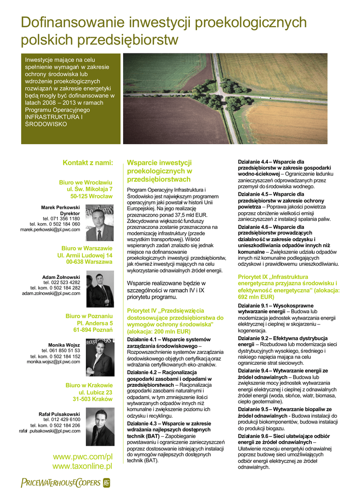 Dofinansowanie inwestycji proekologicznych polskich przedsiębiorstw Inwestycje mające na celu speł nienie wymagańw zakresie ochrony środowiska lub wdrożenie proekologicznych rozwiązańw zakresie energetyki będąmogł y byćdofinansowane w latach 2008 – 2013 w ramach Programu Operacyjnego INFRASTRUKTURA I ŚRODOWISKO Kontakt z nami: Biuro we Wrocł awiu ul. Św. Mikoł aja 7 50-125 Wrocł aw Marek Perkowski Dyrektor tel. 071 356 1180 tel. kom. 0 502 184 060 [email protected] Biuro w Warszawie Ul. Armii Ludowej 14 00-638 Warszawa Adam Żoł nowski tel. 022 523 4282 tel. kom. 0 502 184 282 [email protected] Monika Wojsz tel. 061 850 51 53 tel. kom. 0 502 184 152 [email protected] Biuro w Krakowie ul. Lubicz 23 31-503 Kraków Rafał Pulsakowski tel. 012 429 6100 tel. kom. 0 502 184 206 rafał [email protected] www.pwc.com/pl www.taxonline.pl Program Operacyjny Infrastruktura i Środowisko jest najwię kszym programem operacyjnym jaki powstał w historii Unii Europejskiej. Na jego realizację przeznaczono ponad 37,5 mld EUR. Zdecydowana wię kszoś ćfunduszy przeznaczona zostanie przeznaczona na modernizacjęinfrastruktury (przede wszystkim transportowej). Wś ród wspieranych zadańznalazł o sięjednak miejsce na dofinansowanie proekologicznych inwestycji przedsiębiorstw, jak równieżinwestycji mających na celu wykorzystanie odnawialnych ź ródeł energii. Wsparcie realizowane będzie w szczególności w ramach IV i IX priorytetu programu. Biuro w Poznaniu Pl. Andersa 5 61-894 Poznań Wsparcie inwestycji proekologicznych w przedsiębiorstwach Priorytet IV „Przedsięwzięcia dostosowujące przedsiębiorstwa do wymogów ochrony środowiska” (alokacja: 200 mln EUR) Dział anie 4.1 – Wsparcie systemów zarządzania środowiskowego – Rozpowszechnienie systemów zarzą dzania ś rodowiskowego obję tych certyfikacjąoraz wdraż ania certyfikowanych eko-znaków. Dział anie 4.2 – Racjonalizacja gospodarki zasobami i odpadami w przedsiębiorstwach – Racjonalizacja gospodarki zasobami naturalnymi i odpadami, w tym zmniejszenie ilości wytwarzanych odpadów innych niż komunalne i zwiększenie poziomu ich odzysku i recyklingu. Dział anie 4.3 – Wsparcie w zakresie wdraż ania najlepszych dostę pnych technik (BAT) – Zapobieganie powstawaniu i ograniczenie zanieczyszczeń poprzez dostosowanie istnieją cych instalacji do wymogów najlepszych dostępnych technik (BAT). Dział anie 4.4 – Wsparcie dla przedsiębiorstw w zakresie gospodarki wodno-ściekowej – Ograniczenie ł adunku zanieczyszczeńodprowadzanych przez przemysł do środowiska wodnego. Dział anie 4.5 – Wsparcie dla przedsiębiorstw w zakresie ochrony powietrza – Poprawa jakoś ci powietrza poprzez obniż enie wielkości emisji zanieczyszczeńz instalacji spalania paliw. Dział anie 4.6 – Wsparcie dla przedsiębiorstw prowadzą cych dział alnośćw zakresie odzysku i unieszkodliwiania odpadów innych niż komunalne – Zwiększenie udział u odpadów innych niżkomunalne podlegających odzyskowi i prawidł owemu unieszkodliwianiu. Priorytet IX „Infrastruktura energetyczna przyjazna środowisku i efektywnośćenergetyczna” (alokacja: 692 mln EUR) Dział anie 9.1 – Wysokosprawne wytwarzanie energii – Budowa lub modernizacja jednostek wytwarzania energii elektrycznej i cieplnej w skojarzeniu – kogeneracja. Dział anie 9.2 – Efektywna dystrybucja energii – Rozbudowa lub modernizacja sieci dystrybucyjnych wysokiego, średniego i niskiego napię cia mają ca na celu ograniczenie strat sieciowych. Dział anie 9.4 – Wytwarzanie energii ze ź ródeł odnawialnych – Budowa lub zwiększenie mocy jednostek wytwarzania energii elektrycznej i cieplnej z odnawialnych ź ródeł energii (woda, sł ońce, wiatr, biomasa, ciepł o geotermalne). Dział anie 9.5 – Wytwarzanie biopaliw ze ź ródeł odnawialnych - Budowa instalacji do produkcji biokomponentów, budowa instalacji do produkcji biogazu. Dział anie 9.6 – Sieci uł atwiają ce odbiór energii ze ź ródełodnawialnych – Uł atwienie rozwoju energetyki odnawialnej poprzez budowęsieci umożliwiających odbiór energii elektrycznej ze ź ródeł odnawialnych. Warunki konieczne do speł nienia Dla Priorytetu IV: zgodnoś ćprojektu z celami i zakresem merytorycznym poszczególnych dział ań, okres realizacji inwestycji przypada na lata 2007 – 2013, potwierdzona ekonomiczna wykonalnoś ćinwestycji. Maksymalna wartość dofinansowania dla dział ań Priorytetu IV wynosi 20 mln PLN (z wył ą czeniem dział ania 4.1 – 400 tys. PLN) Dla Priorytetu IX: zgodnoś ćprojektu z celami i zakresem merytorycznym poszczególnych dział ań, wdroż enie wył ącznie nowych, nieuż ywanych, dopuszczonych do stosowania urządzeń, dla dział ań 9.1, 9.4 oraz 9.5 wdroż enie wył ącznie technologii stosowanych dł uż ej niż3 lata. Bardziej innowacyjne rozwiązania wspierane bę dąw ramach Programu Operacyjnego Innowacyjna Gospodarka. Minimalna wartośćprojektów dla dział ańpriorytetu IX wynosi 20 mln PLN. Wyjątek stanowią dział anie 9.1 oraz fragment dział ania 9.4 gdzie minimalna wartośćprojektu został a obniż ona do 10 mln PLN. Dokł adne kryteria oceny róż niąsięw ramach poszczególnych dział ań . Na Pań stwa ż yczenie, przedstawimy kryteria oceny do interesującego Pań stwa dział ania. Dodatkowo pragniemy poinformować, iżprojekty proekologiczne o mniejszej wartości mogą uzyskaćwsparcie w równieżramach niektórych Regionalnych Programów Operacyjnych. Nasza pomoc Na Państwa ż yczenie z przyjemnoś cią przedstawimy szczegół y dotyczą ce korzystania z funduszy unijnych na nowe inwestycje, w tym w szczególnoś ci na temat: warunków dofinansowania inwestycji z funduszy unijnych, zasad oceny inwestycji, trybu skł adania wniosków. Podejmiemy sięrównieżanalizy planowanych przez Państwa zadańinwestycyjnych, celem oceny szans na pozyskanie dofinansowania z funduszy strukturalnych. Nasządewiząjest aktywn