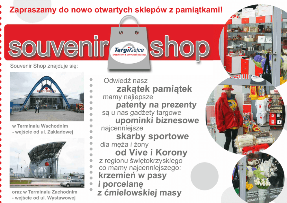 Zapraszamy do nowo otwartych sklepów z pamiątkami! Souvenir Shop znajduje się: Odwiedź nasz zakątek pamiątek mamy najlepsze patenty na prezenty są u nas gadżety targowe w Terminalu Wschodnim - wejście od ul. Zakładowej upominki biznesowe najcenniejsze skarby sportowe dla męża i żony od Vive i Korony z regionu świętokrzyskiego co mamy najcenniejszego: oraz w Terminalu Zachodnim - wejście od ul. Wystawowej krzemień w pasy i porcelanę z ćmielowskiej masy