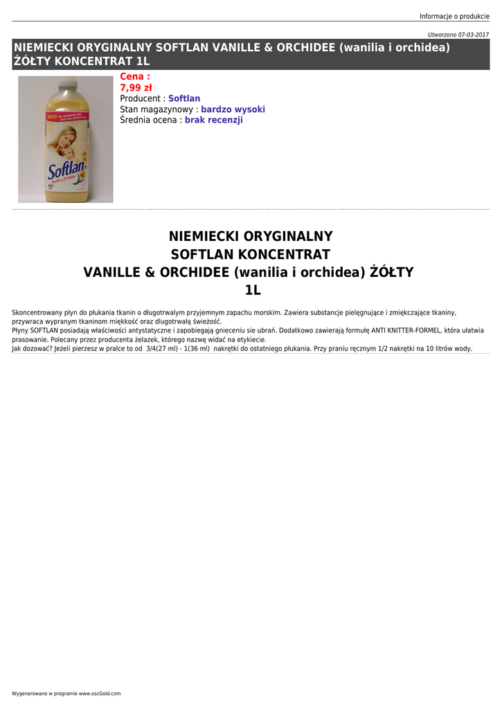Informacje o produkcie Utworzono 07-03-2017 NIEMIECKI ORYGINALNY SOFTLAN VANILLE & ORCHIDEE (wanilia i orchidea) ŻÓŁTY KONCENTRAT 1L Cena : 7,99 zł Producent : Softlan Stan magazynowy : bardzo wysoki Średnia ocena : brak recenzji NIEMIECKI ORYGINALNY SOFTLAN KONCENTRAT VANILLE & ORCHIDEE (wanilia i orchidea) ŻÓŁTY 1L Skoncentrowany płyn do płukania tkanin o długotrwalym przyjemnym zapachu morskim. Zawiera substancje pielęgnujące i zmiękczające tkaniny, przywraca wypranym tkaninom miękkość oraz dlugotrwałą świeżość. Płyny SOFTLAN posiadają właściwości antystatyczne i zapobiegają gnieceniu sie ubrań. Dodatkowo zawierają formułę ANTI KNITTER-FORMEL, która ułatwia prasowanie. Polecany przez producenta żelazek, którego nazwę widać na etykiecie. Jak dozować? Jeżeli pierzesz w pralce to od 3/4(27 ml) - 1(36 ml) nakrętki do ostatniego płukania. Przy praniu ręcznym 1/2 nakrętki na 10 litrów wody. Wygenerowano w programie www.oscGold.com