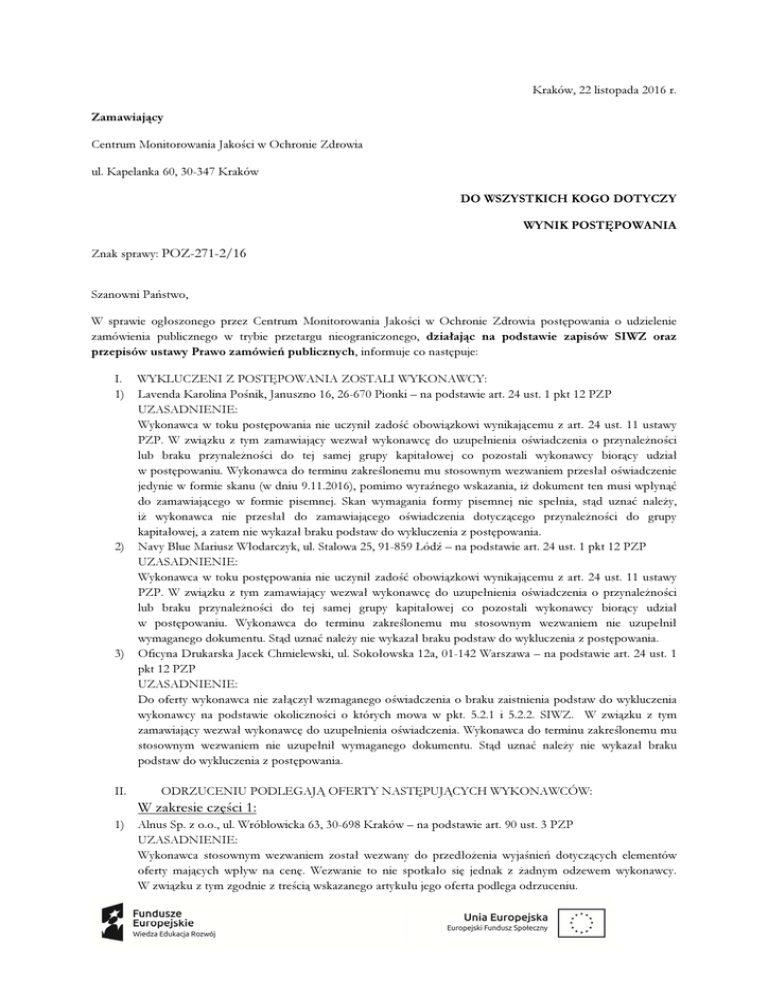 Kraków, 22 listopada 2016 r. Zamawiający Centrum Monitorowania Jakości w Ochronie Zdrowia ul. Kapelanka 60, 30-347 Kraków DO WSZYSTKICH KOGO DOTYCZY WYNIK POSTĘPOWANIA Znak sprawy: POZ-271-2/16 Szanowni Państwo, W sprawie ogłoszonego przez Centrum Monitorowania Jakości w Ochronie Zdrowia postępowania o udzielenie zamówienia publicznego w trybie przetargu nieograniczonego, działając na podstawie zapisów SIWZ oraz przepisów ustawy Prawo zamówień publicznych, informuje co następuje: I. WYKLUCZENI Z POSTĘPOWANIA ZOSTALI WYKONAWCY: 1) Lavenda Karolina Pośnik, Januszno 16, 26-670 Pionki – na podstawie art. 24 ust. 1 pkt 12 PZP UZASADNIENIE: Wykonawca w toku postępowania nie uczynił zadość obowiązkowi wynikającemu z art. 24 ust. 11 ustawy PZP. W związku z tym zamawiający wezwał wykonawcę do uzupełnienia oświadczenia o przynależności lub braku przynależności do tej samej grupy kapitałowej co pozostali wykonawcy biorący udział w postępowaniu. Wykonawca do terminu zakreślonemu mu stosownym wezwaniem przesłał oświadczenie jedynie w formie skanu (w dniu 9.11.2016), pomimo wyraźnego wskazania, iż dokument ten musi wpłynąć do zamawiającego w formie pisemnej. Skan wymagania formy pisemnej nie spełnia, stąd uznać należy, iż wykonawca nie przesłał do zamawiającego oświadczenia dotyczącego przynależności do grupy kapitałowej, a zatem nie wykazał braku podstaw do wykluczenia z postępowania. 2) Navy Blue Mariusz Włodarczyk, ul. Stalowa 25, 91-859 Łódź – na podstawie art. 24 ust. 1 pkt 12 PZP UZASADNIENIE: Wykonawca w toku postępowania nie uczynił zadość obowiązkowi wynikającemu z art. 24 ust. 11 ustawy PZP. W związku z tym zamawiający wezwał wykonawcę do uzupełnienia oświadczenia o przynależności lub braku przynależności do tej samej grupy kapitałowej co pozostali wykonawcy biorący udział w postępowaniu. Wykonawca do terminu zakreślonemu mu stosownym wezwaniem nie uzupełnił wymaganego dokumentu. Stąd uznać należy nie wykazał braku podstaw do wykluczenia z postępowania. 3) Oficyna Drukarska Jacek Chmielewski, ul. Sokołowska 12a, 01-142 Warszawa – na podstawie art. 24 ust. 1 pkt 12 PZP UZASADNIENIE: Do oferty wykonawca nie załączył wzmaganego oświadczenia o braku zaistnienia podstaw do wykluczenia wykonawcy na podstawie okoliczności o których mowa w pkt. 5.2.1 i 5.2.2. SIWZ. W związku z tym zamawiający wezwał wykonawcę do uzupełnienia oświadczenia. Wykonawca do terminu zakreślonemu mu stosownym wezwaniem nie uzupełnił wymaganego dokumentu. Stąd uznać należy nie wykazał braku podstaw do wykluczenia z postępowania. II. ODRZUCENIU PODLEGAJĄ OFERTY NASTĘPUJĄCYCH WYKONAWCÓW: W zakresie części 1: 1) Alnus Sp. z o.o., ul. Wróblowicka 63, 30-698 Kraków – na podstawie art. 90 ust. 3 PZP UZASADNIENIE: Wykonawca stosownym wezwaniem został wezwany do przedłożenia wyjaśnień dotyczących elementów oferty mających wpływ na cenę. Wezwanie to nie spotkało się jednak z żadnym odzewem wykonawcy. W związku z tym zgodnie z treścią wskazanego artykułu jego oferta podlega odrzuceniu. 2) 3) 4) 5) 6) 7) Pasaż Sp. z o.o., ul. Rydlówka 24, 30-363 Kraków – na podstawie art. 89 ust. 1 pkt 1 i 8 PZP UZASADNIENIE: Do oferty wykonawca nie załączył żadnych dokumentów potwierdzających, że Pan Andrzej Machaj jest uprawniony do złożenia w imieniu wykonawcy ofert. W związku z powyższym został on wezwany do uzupełnienia stosownych dokumentów. Wezwanie wystosowane przez zamawiającego nie spotkało się jednak z żadnym odzewem ze strony wykonawcy. W związku z powyższym, iż zamawiający nie jest w stanie stwierdzić, czy oferta została podpisana przez osobę umocowaną do składania oświadczeń woli w imieniu wykonawcy nie może jej uznać za skutecznie złożoną. Business Point Sp. z o.o., ul. Ciołka 11a/302, 01-402 Warszawa – na podstawie art. 89 ust. 1 pkt 7b PZP UZASADNIENIE: Wykonawca do terminu składania ofert, tj. do dnia 26 października 2016 r. do godz.: 10:00 nie wniósł skutecznie wadium, w sposób, który pozwalałby na dysponowaniem nim przez zamawiającego, tzn. nie zostało wniesione w formie gwarancji wraz z ofertą, jak również nie wpłynęło do wskazanego terminu na rachunek bankowy zamawiającego. W związku z powyższym oferta wykonawcy nie została skutecznie zabezpieczona wadium i podlega odrzuceniu. Lavenda Karolina Pośnik, Januszno 16, 26-670 Pionki – na podstawie art. 89 ust. 1 pkt 5 PZP UZASADNIENIE: Ofertę wykonawcy wykluczonego uznaje się za odrzuconą. Navy Blue Mariusz Włodarczyk, ul. Stalowa 25, 91-859 Łódź – na podstawie art. 89 ust. 1 pkt 5 PZP UZASADNIENIE: Ofertę wykonawcy wykluczonego uznaje się za odrzuconą. Oficyna Drukarska Jacek Chmielewski, ul. Sokołowska 12a, 01-142 Warszawa – na podstawie art. 89 ust. 1 pkt 5 PZP UZASADNIENIE: Ofertę wykonawcy wykluczonego uznaje się za odrzuconą. ABA Papier Int Sp. z o.o. ul. Heyki 27, 70-631 Szczecin – na podstawie art. 90 ust. 3 PZP UZASADNIENIE: Wykonawca stosownym wezwaniem został wezwany do przedłożenia wyjaśnień dotyczących elementów oferty mających wpływ na cenę. Wezwanie to nie spotkało się jednak z żadnym odzewem wykonawcy. W związku z tym zgodnie z treścią wskazanego artykułu jego oferta podlega odrzuceniu. W zakresie części 2: 1) 2) 3) Alnus Sp. z o.o., ul. Wróblowicka 63, 30-698 Kraków – na podstawie art. 90 ust. 3 PZP UZASADNIENIE: Wykonawca stosownym wezwaniem został wezwany do przedłożenia wyjaśnień dotyczących elementów oferty mających wpływ na cenę. Wezwanie to nie spotkało się jednak z żadnym odzewem wykonawcy. W związku z tym zgodnie z treścią wskazanego artykułu jego oferta podlega odrzuceniu. Drukarnia Roma-Pol Stefan Pałka, ul. Rydlówka 5, 30-363 Kraków – na podstawie art. 90 ust. 3 PZP UZASADNIENIE: Wykonawca stosownym wezwaniem został wezwany do przedłożenia wyjaśnień dotyczących elementów oferty