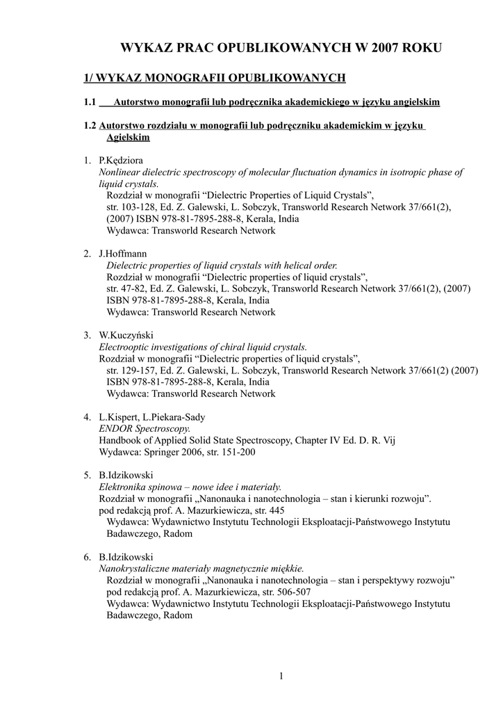 WYKAZ PRAC OPUBLIKOWANYCH W 2007 ROKU 1/ WYKAZ MONOGRAFII OPUBLIKOWANYCH 1.1 Autorstwo monografii lub podręcznika akademickiego w języku angielskim 1.2 Autorstwo rozdziału w monografii lub podręczniku akademickim w języku Agielskim 1. P.Kędziora Nonlinear dielectric spectroscopy of molecular fluctuation dynamics in isotropic phase of liquid crystals. Rozdział w monografii “Dielectric Properties of Liquid Crystals”, str. 103-128, Ed. Z. Galewski, L. Sobczyk, Transworld Research Network 37/661(2), (2007) ISBN 978-81-7895-288-8, Kerala, India Wydawca: Transworld Research Network 2. J.Hoffmann Dielectric properties of liquid crystals with helical order. Rozdział w monografii “Dielectric properties of liquid crystals”, str. 47-82, Ed. Z. Galewski, L. Sobczyk, Transworld Research Network 37/661(2), (2007) ISBN 978-81-7895-288-8, Kerala, India Wydawca: Transworld Research Network 3. W.Kuczyński Electrooptic investigations of chiral liquid crystals. Rozdział w monografii “Dielectric properties of liquid crystals”, str. 129-157, Ed. Z. Galewski, L. Sobczyk, Transworld Research Network 37/661(2) (2007) ISBN 978-81-7895-288-8, Kerala, India Wydawca: Transworld Research Network 4. L.Kispert, L.Piekara-Sady ENDOR Spectroscopy. Handbook of Applied Solid State Spectroscopy, Chapter IV Ed. D. R. Vij Wydawca: Springer 2006, str. 151-200 5. B.Idzikowski Elektronika spinowa – nowe idee i materiały. Rozdział w monografii „Nanonauka i nanotechnologia – stan i kierunki rozwoju”. pod redakcją prof. A. Mazurkiewicza, str. 445 Wydawca: Wydawnictwo Instytutu Technologii Eksploatacji-Państwowego Instytutu Badawczego, Radom 6. B.Idzikowski Nanokrystaliczne materiały magnetycznie miękkie. Rozdział w monografii „Nanonauka i nanotechnologia – stan i perspektywy rozwoju” pod redakcją prof. A. Mazurkiewicza, str. 506-507 Wydawca: Wydawnictwo Instytutu Technologii Eksploatacji-Państwowego Instytutu Badawczego, Radom 1 7. J.Baszyński Nanokontakty perowskitowe dla spintroniki. Rozdział w monografii „Nanonauka i nanotechnologia – stan i perspektywy rozwoju” pod redakcją prof. A. Mazurkiewicza, str. 344-345 Wydawca: Wydawnictwo Instytutu Technologii Eksploatacji-Państwowego Instytutu Badawczego, Radom 8. J.Baszyński Nanostruktury funkcyjne dla spintroniki. Rozdział w monografii „Nanonauka i nanotechnologia – stan i perspektywy rozwoju”. pod redakcją prof. A. Mazurkiewicza, str. 342-343 Wydawca: Wydawnictwo Instytutu Technologii Eksploatacji-Państwowego Instytutu Badawczego, Radom 9. O.Drozdova, M.A.Tanatar, R.Świetlik, K.Yakushi, T.Nakamura, S.Kagoshima, V.S.Yefanov, N.D.Kushch and E. B.Yagubskii Raman spectroscopy of κ-(BEDT-TTF)2Cu[N(CN)2]I Rozdział w monografii “Multifunctional Conducting Molecular Materials, ed. G. Saito et al.The Royal Society of Chemistry Publishing 2007, Cambridge (UK), str. 87-90 Wydawca: The Royal Society of Chemistry, Cambridge, UK 1.3 Autorstwo monografii lub podręcznika akademickiego w języku polskim lub innym nie angielskim 1.4 Autorstwo rozdziału w monografii lub podręczniku akademickim w języku polskim lub innym nie angielskim (nie podstawowym dla danej dziedziny) 1.5 1 Redaktor naczelny wieloautorskich:monografii, podręcznika akademickiego lub serii wydawniczej Tytuł: Materials Science Poland Conference New materials for Magnetoelectronics, Będlewo, 3-6 May 2006 Published by: Oficyna Wydawnicza Politechniki Wrocławskiej Guest Editors: Stanisław Lipiński, Tadeusz Luciński WŁASNE WYDAWNICTWA W ROKU SPRAWOZDAWCZYM 1. Tytuł Scientific Network "New materials for magnetoelectronics" MAG-EL-MAT Meeting of the Members, May 7-10, 2007, Będlewo near Poznań, Poland Published by: IFM PAN, ISBN 83-922407-4-X 2/ WYKAZY PRAC OPUBLIKOWANYCH 2.1 Publikacje w czasopiśmie z listy filadelfijskiego Instytutu Informacji Naukowej 1. B.Andrzejewski, E.Guimeau, A.Kowalczyk, W.Jurga Superconducting properties of Mo2Re3Bx - Mo3Re2Bx eutectic. Acta Physica Polonica A Vol. 111, No. 5, 727-735, 2007 2. J.Jadżyn, J.-L.Dejardin, G.Czechowski Singular pretransitional behavior of the electric field-dependent part of the thermodynamic quantities of strongly polar mesogenic liquids in the isotropic phase. Acta Physica Polonica A Vol. 111, No. 6, 877-884, 2007 2 3. J.Morkowski Spin polarons in antiferromagnetic planes. Acta Physica Polonica A Vol. 111, No. 4, 397-408, 2007 4. M.Zdanowska-Frączek, M.Olszewski, Z.J.Frączek, R.Jakubas The dielectric studies of ferroelectric [NH2(CH3)2]3Sb2Cl9 crystals under moderate pressure. Acta Physica Polonica A Vol. 112, No. 3, 549-555, 2007 5. M.A.Augustyniak-Jabłokow, Yu.V.Yablokov, I.Jacyna-Onyszkiewicz, T.A.Ivanova, V.A.Shustov EPR study of water induced decomposition of the SrCuO2 and Sr2CuO3 ceramics surface. The role of carbon dioxide. Acta Physica Polonica A Vol. 112 Suplement, 143-151, 2007 6. B.Barszcz, A.Bogucki, B.Laskowska, R.M.Ion, A.Graja Spectral investigation of fullerene – porphyrin complexes. Acta Physica Polonica A Vol. 112, No. 3, S523-S536, 2007 7. P.Trocha, J.Barnaś Coherent transport through systems of coupled quantum dots. Acta Physica Polonica 112, 473 (2007) 8. F.Rozpłoch, J.Patyk J.Stankowski Graphenes bonding forces in graphite. Acta Physica Polonica A112, 557 (2007) 9. M.Bielejewski, A.Rachocki, R.Luboradzki and J.Tritt-Goc Molecular dynamics in a new solid glucofuranose-based low molecular weight organogelator as studied by 1H NMR. Applied Magnetic Resonance 33, 4, 431-438 (2007) 10. J.Kaszyńska, A.Rachocki, J.Tritt–Goc, N.Piślewski The NMR study of the molecular dynamics of the D-Amphetamine sulfate salt powder. Applied Magnetic Resonance 33, 4, 439-446 (2007) 11. P.Kerschl, U.K.Rössler, T.Gemming, K.-H.Müller, Z.Śniadecki, B.Idzikowski Amorphous states of melt-spun in the system Dy-(Mn, Fe)6-(Ge, Al)6. Applied Physics Letters 90, 031903-1 do 031903-3, 2007 12. M.Wencka, K.Wichlarz, H.Kasprzyk, S.Lijewski, S.K.Hoffmann Free radicals and their electron spin relax