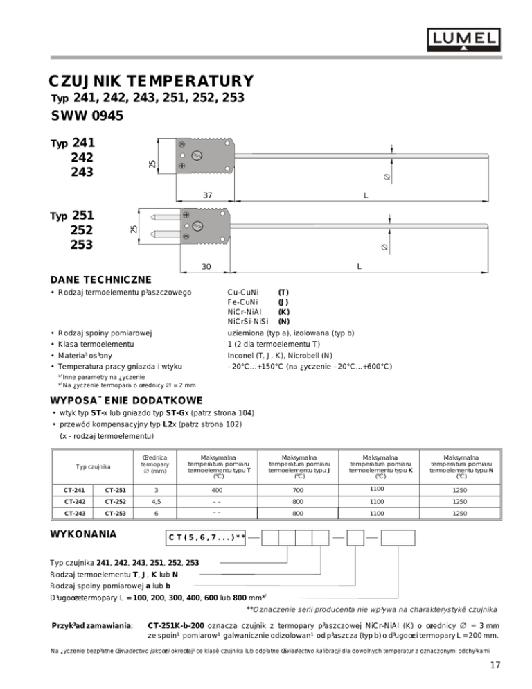 CZUJNIK TEMPERATURY Typ 241, 242, 243, 251, 252, 253 SWW 0945 241 242 243 Æ 25 Typ 37 251 252 253 Æ 25 Typ L L 30 DANE TECHNICZNE (T) (J) (K) (N) • Rodzaj termoelementu p³aszczowego Cu-CuNi Fe-CuNi NiCr-NiAl NiCrSi-NiSi • Rodzaj spoiny pomiarowej uziemiona (typ a), izolowana (typ b) • Klasa termoelementu 1 (2 dla termoelementu T) • Materia³ os³ony Inconel (T, J, K), Nicrobell (N) • Temperatura pracy gniazda i wtyku –20°C...+150°C (na ¿yczenie –20°C...+600°C) *) Inne parametry na ¿yczenie *) Na ¿yczenie termopara o œrednicy Æ = 2 mm WYPOSA¯ENIE DODATKOWE • wtyk typ ST-x lub gniazdo typ ST-Gx (patrz strona 104) • przewód kompensacyjny typ L2x (patrz strona 102) (x - rodzaj termoelementu) Typ czujnika Œrednica termopary Æ (mm) Maksymalna temperatura pomiaru termoelementu typu T (°C) Maksymalna temperatura pomiaru termoelementu typu J (°C) Maksymalna temperatura pomiaru termoelementu typu K (°C) Maksymalna temperatura pomiaru termoelementu typu N (°C) CT-241 CT-251 3 400 700 1100 1250 CT-242 CT-252 4,5 –– 800 1100 1250 CT-243 CT-253 6 –– 800 1100 1250 WYKONANIA CT(5,6,7...)** Typ czujnika 241, 242, 243, 251, 252, 253 Rodzaj termoelementu T, J, K lub N Rodzaj spoiny pomiarowej a lub b D³ugoœæ termopary L = 100, 200, 300, 400, 600 lub 800 mm*) **Oznaczenie serii producenta nie wp³ywa na charakterystykê czujnika Przyk³ad zamawiania: CT-251K-b-200 oznacza czujnik z termopary p³aszczowej NiCr-NiAl (K) o œrednicy Æ = 3 mm ze spoin¹ pomiarow¹ galwanicznie odizolowan¹ od p³aszcza (typ b) o d³ugoœci termopary L = 200 mm. Na ¿yczenie bezp³atne Œwiadectwo jakoœci okreœlaj¹ce klasê czujnika lub odp³atne Œwiadectwo kalibracji dla dowolnych temperatur z oznaczonymi odchy³kami 17