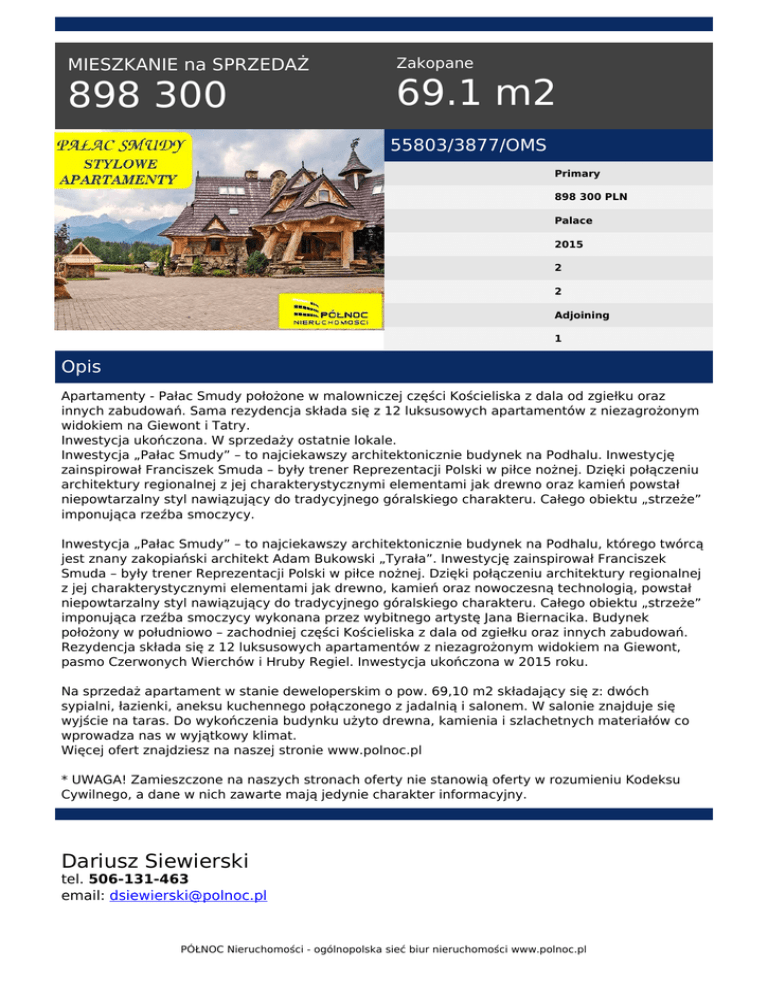 MIESZKANIE na SPRZEDAŻ 898 300 Zakopane 69.1 m2 55803/3877/OMS Primary 898 300 PLN Palace 2015 2 2 Adjoining 1 Opis Apartamenty - Pałac Smudy położone w malowniczej części Kościeliska z dala od zgiełku oraz innych zabudowań. Sama rezydencja składa się z 12 luksusowych apartamentów z niezagrożonym widokiem na Giewont i Tatry. Inwestycja ukończona. W sprzedaży ostatnie lokale. Inwestycja „Pałac Smudy” – to najciekawszy architektonicznie budynek na Podhalu. Inwestycję zainspirował Franciszek Smuda – były trener Reprezentacji Polski w piłce nożnej. Dzięki połączeniu architektury regionalnej z jej charakterystycznymi elementami jak drewno oraz kamień powstał niepowtarzalny styl nawiązujący do tradycyjnego góralskiego charakteru. Całego obiektu „strzeże” imponująca rzeźba smoczycy. Inwestycja „Pałac Smudy” – to najciekawszy architektonicznie budynek na Podhalu, którego twórcą jest znany zakopiański architekt Adam Bukowski „Tyrała”. Inwestycję zainspirował Franciszek Smuda – były trener Reprezentacji Polski w piłce nożnej. Dzięki połączeniu architektury regionalnej z jej charakterystycznymi elementami jak drewno, kamień oraz nowoczesną technologią, powstał niepowtarzalny styl nawiązujący do tradycyjnego góralskiego charakteru. Całego obiektu „strzeże” imponująca rzeźba smoczycy wykonana przez wybitnego artystę Jana Biernacika. Budynek położony w południowo – zachodniej części Kościeliska z dala od zgiełku oraz innych zabudowań. Rezydencja składa się z 12 luksusowych apartamentów z niezagrożonym widokiem na Giewont, pasmo Czerwonych Wierchów i Hruby Regiel. Inwestycja ukończona w 2015 roku. Na sprzedaż apartament w stanie deweloperskim o pow. 69,10 m2 składający się z: dwóch sypialni, łazienki, aneksu kuchennego połączonego z jadalnią i salonem. W salonie znajduje się wyjście na taras. Do wykończenia budynku użyto drewna, kamienia i szlachetnych materiałów co wprowadza nas w wyjątkowy klimat. Więcej ofert znajdziesz na naszej stronie www.polnoc.pl * UWAGA! Zamieszczone na naszych stronach oferty nie stanowią oferty w rozumieniu Kodeksu Cywilnego, a dane w nich zawarte mają jedynie charakter informacyjny. Dariusz Siewierski tel. 506-131-463 email: [email protected] PÓŁNOC Nieruchomości - ogólnopolska sieć biur nieruchomości www.polnoc.pl PÓŁNOC Nieruchomości - ogólnopolska sieć biur nieruchomości www.polnoc.pl Powered by TCPDF (www.tcpdf.org)