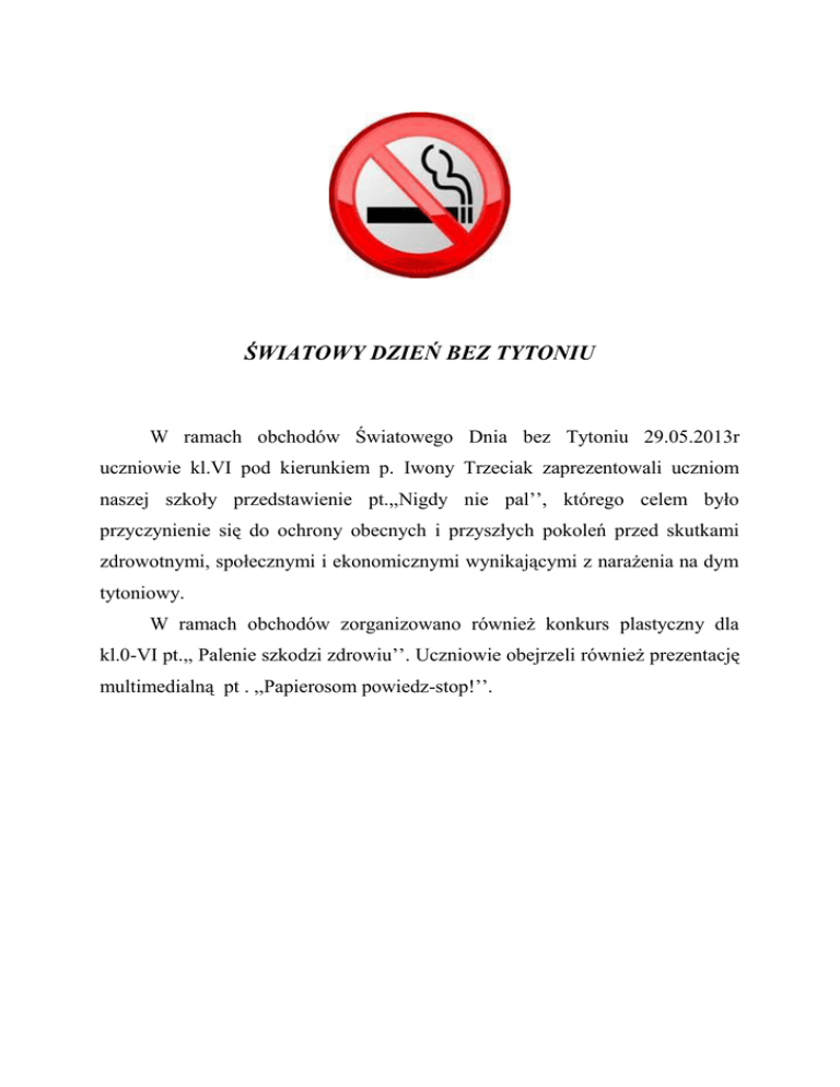 ŚWIATOWY DZIEŃ BEZ TYTONIU W ramach obchodów Światowego Dnia bez Tytoniu 29.05.2013r uczniowie kl.VI pod kierunkiem p. Iwony Trzeciak zaprezentowali uczniom naszej szkoły przedstawienie pt.,,Nigdy nie pal’’, którego celem było przyczynienie się do ochrony obecnych i przyszłych pokoleń przed skutkami zdrowotnymi, społecznymi i ekonomicznymi wynikającymi z narażenia na dym tytoniowy. W ramach obchodów zorganizowano również konkurs plastyczny dla kl.0-VI pt.,, Palenie szkodzi zdrowiu’’. Uczniowie obejrzeli również prezentację multimedialną pt . ,,Papierosom powiedz-stop!’’.