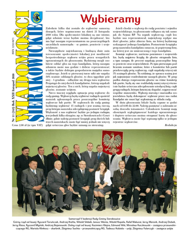 Nr 11 (245) Rok XXII listopad 2010 Wybieramy Cena 2,00 zł (w tym VAT) Zaledwie kilka dni zostało do wyborów samorządowych, które wyznaczono na dzień 21 listopada 2010 roku. Dla społeczności lokalnej są one istotne, gdyż właśnie teraz będzie można decydować, kto ma być naszym reprezentantem na poszczególnych szczeblach samorządu – w gminie, powiecie i województwie. Niewątpliwie najciekawszą i budzącą duże zainteresowanie społeczności lokalnej jest możliwość bezpośredniego wyboru wójta przez wszystkich uprawnionych do głosowania. Będziemy mogli osobiście oddać głos na tego kandydata, który naszym zdaniem może nas godnie i dobrze reprezentować, a także będzie dobrym gospodarzem majątku samorządowego. Jeżeli w pierwszej turze nikt nie uzyska 50% ważnie oddanych głosów, to dwa tygodnie później – 5 grudnia – odbędzie się druga tura wyborów. Przystąpi do niej dwóch kandydatów, którzy uzyskali najwięcej głosów. Ten z nich, który uzyska najwięcej głosów, zostanie wójtem. Nieco inaczej wygląda sytuacja przy wyborze do rady gminy. Wyborcy będą wybierać radnych spośród nazwisk zgłoszonych przez poszczególne komitety wyborcze lub partie. W wyborach do rady gminy będziemy wybierać 15 radnych i jest ważną rzeczą, przy którym nazwisku zdecydujemy postawić krzyżyk. Większość z nas wybierać będzie po jednym radnym, jest jednak kilka okręgów, np. w Sierakowicach i Gowidlinie, gdzie należy postawić krzyżyk przy dwóch lub trzech nazwiskach; może być mniej, jednak nie więcej, gdyż wówczas głos będzie uznany za nieważny. Jeżeli chodzi o wybory do rady powiatu i sejmiku wojewódzkiego, tu głosowanie odbywa się tak samo jak do Sejmu RP. Na wynik wyborczy, czyli kto będzie nas reprezentował, największy wpływ ma ilość głosów, jakie zbierze lista, na której będziemy wskazywać jednego kandydata. Postawienie krzyżyka przy nazwisku kandydata oznacza, iż popieramy listę, na której jest on umieszczony i tego kandydata. Komisje wyborcze, zarówno powiatowe i wojewódzkie, będą najpierw liczyły, ile głosów otrzymała lista, a tym samym, ile procent uzyskają poszczególne listy w powiecie oraz województwie. Po tym pierwszym podliczeniu zostanie ustalone, które z komitetów lub partii przekroczyły próg wyborczy, czyli uzyskały więcej niż 5% ważnych głosów. Tu widzimy, że sprawa ważną jest jak najmniejsze rozdrobnienie naszych głosów. W przypadku dużego rozproszenia głosów na różne komitety lub partie, będą się one rozkładały mniej więcej równo i nie będzie wówczas zdecydowanie wiodącej listy, czyli grupy radnych, którym łatwiej się dogadać, wypracować wspólne stanowisko. Wybory starosty i marszałka województwa będą dokonywać wybrani przez nas radni. Kandydat nie musi być wyłoniony ze składu rady. W dniu głosowania lokale będą czynne w godzinach od 8.00 do 22.00. Należy pamiętać o zabraniu ze sobą dowodu tożsamości. Członkowie komisji mają obowiązek wylegitymować każdego uprawnionego i dopiero wówczas można otrzymać kartę do głosowania. Wyborca może być wpisany tylko w jednym rejestrze wyborców. Redakcja Samorząd V kadencji Rady Gminy Sierakowice Górny rząd od lewej: Ryszard Toruńczak, Andrzej Krefta, Witold Sildatk, Janusz Wenta, Witold Ropela, Rafał Makurat, Jerzy Meronk, Andrzej Dobek, Jerzy Klasa, Ryszard Młyński, Andrzej Bojanowski. Dolny rząd od lewej: Kazimierz Klejna, Edmund Witt, Mirosław Kuczkowski – zastępca przewodniczącego RG, Mariola Klinkosz – skarbnik, Zbigniew Suchta – przewodniczący RG, Tadeusz Kobiela – wójt, Zbigniew Fularczyk – zastępca wójta 2 WIADOMOŚCI SIERAKOWICKIE 11 (245) listopad 2010 Ostatnia sesja V kadencji Rady Gminy Czwartego listopada po raz ostatni obradowali sierakowiccy radni. Ostatnia sesja tej kadencji miała inny niż zwykle przebieg. Oprócz podjęcia ważnych decyzji, radni wyjechali w teren, aby obejrzeć tegoroczne inwestycje. Ale zanim to nastąpiło nie zabrakło słów podziękowania za owocną współpracę, skierowanych do radnych przez wójta Tadeusza Kobielę. Radni także dziękowali wójtowi, a przewodniczący RG Zbigniew Suchta wręczył ozdobny zwój pergaminu ze słowami ks. Piotra Skargi „Kto ojczyźnie swej służy, sam sobie służy”. Ważną wiadomość na samym początku sesji obwieścił wójt Tadeusz Kobiela: – Mamy „schetynówkę”! To informacja, która ucieszy wielu mieszkańców nie tylko naszej gminy. Projekt remontu drogi Sierakowice–Mrozy–Szklana–Borucino, przygotowany przez Starostwo Powiatowe w Kartuzach, zakwalifikował się do dofinansowania ostatniej edycji rządowego programu remontu i budowy dróg, czyli tzw. „schetynówek”. Będzie to inwestycja realizowana przez trzy samorządy: powiat oraz gminy Sierakowice i Stężyca. – Jest to bardzo ważna droga, łącząca dwie drogi wojewódzkie – kontynuował wójt. – Wyremontowany zostanie odcinek długości ok. 11 km, z czego 7 km na terenie gminy Sierakowice. I co ważne: zbudowany zostanie chodnik od wiaduktu w Sierakowicach do wsi Mrozy, a w Szklanej przedłużenie chodnika istniejącego. Całość przedsięwzięcia została skosztorysowana na ponad 8 mln zł, nasz wkład będzie wynosił ok. 2 mln zł. Wójt poinformował także o rozstrzygniętym przetargu na rozbudowę ośrodka zdrowia. Po szczegółowych analizach wybrano ofertę firmy Elwoz, która zobowiązała się wykonać zadanie za kwotę 11.578.060,52 zł. Na wiosnę ogłoszony zostanie kolejny przetarg – na wyposażenie obiektu w specjalistyczny sprzęt. Na ten cel także muszą zostać zarezerwowane fundusze. Szacuje się, że będzie to około 3 mln zł. Łączna wartość tej inwestycji to ok. 15 mln zł. W związku z rozbudową ośrodka zdrowia radni podjęli decyzję o wyemitowaniu obligacji na kwotę do 10 mln zł. Nie obyło się przy tym bez dyskusji zainicjowanej przez radnego Jerzego Me