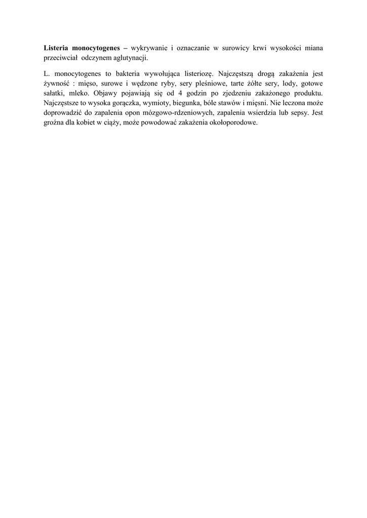 Listeria monocytogenes – wykrywanie i oznaczanie w surowicy krwi wysokości miana przeciwciał odczynem aglutynacji. L. monocytogenes to bakteria wywołująca listeriozę. Najczęstszą drogą zakażenia jest żywność : mięso, surowe i wędzone ryby, sery pleśniowe, tarte żółte sery, lody, gotowe sałatki, mleko. Objawy pojawiają się od 4 godzin po zjedzeniu zakażonego produktu. Najczęstsze to wysoka gorączka, wymioty, biegunka, bóle stawów i mięsni. Nie leczona może doprowadzić do zapalenia opon mózgowo-rdzeniowych, zapalenia wsierdzia lub sepsy. Jest groźna dla kobiet w ciąży, może powodować zakażenia okołoporodowe.