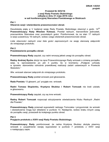DRUK 1/XXVI projekt Protokół Nr XXV/16 z sesji Rady Powiatu Słubickiego odbytej w dniu 31 maja 2016 roku w sali konferencyjnej Starostwa Powiatowego w Słubicach Pkt 1 Otwarcie sesji i stwierdzenie prawomocności obrad. Dwudziestą piątą w V kadencji sesję Rady Powiatu Słubickiego otworzył o godz. 1400 Przewodniczący Rady Wiesław Kołosza. Powitał radnych, kierowników jednostek, pracowników Starostwa oraz pozostałych gości. Poinformował, że na stan 17 radnych w sesji uczestniczy 16 radnych, wobec czego stwierdził prawomocność obrad. Lista obecności radnych oraz lista gości zaproszonych na sesję stanowią załączniki do niniejszego protokołu. Pkt 2 Przedstawienie porządku obrad. Przewodniczący Rady zapytał, czy radni wnoszą jakieś uwagi do porządku obrad. Radny Andrzej Bycka złożył na ręce Przewodniczącego Rady wniosek o zmianę porządku sesji, tj. wprowadzenie po pkt 3 punktu 3a w brzmieniu „Podjęcie uchwały w sprawie stanowiska odnośnie prawidłowej realizacji zadań ustawowych w Powiecie Słubickim.” Ww. wniosek stanowi załącznik do niniejszego protokołu. Przewodniczący Rady poddał wniosek pod głosowanie. Rada Powiatu 13 głosami „za” przyjęła ww. wniosek. Radni Tomasz Stupienko, Krystyna Skubisz i Robert Tomczak nie brali udziału w głosowaniu. Przewodniczący Rady zapytał, czy są inne wnioski. Radny Robert Tomczak rozpoczął odczytywanie oświadczenia Klubu Radnych „Radni dla Powiatu”. Przewodniczący Rady przerwał wypowiedź radnego Tomczaka i przypomniał, że wnioski i oświadczenia mogą być składane w punkcie 13. Następnie, wobec braku innych uwag do porządku sesji, przeszedł do kolejnego punktu obrad. Pkt 3 Przyjęcie protokołu z XXIV sesji Rady Powiatu Słubickiego. Przewodniczący Rady poinformował, że radna Krystyna Skubisz złożyła pisemny wniosek o uzupełnienie swojej wypowiedzi w punkcie 7 protokołu z XXIV sesji o następujący zapis: 1 „Nadmieniła, że podczas posiedzenia Komisji opowiedziała się „za” pozytywnym zaopiniowaniem projektu uchwały, jednak w związku z rozstrzygnięciem nadzorczym Wojewody Lubuskiego w sprawie unieważnienia uchwał Rady Powiatu dotyczących wyboru nowego Zarządu Powiatu, będzie głosować „przeciw” podjęciu uchwały, ponieważ chce w ten sposób uniknąć podejmowania uchwał niezgodnie z prawem.” Przewodniczący Rady zarządził głosowanie nad przyjęciem ww. poprawki do protokołu z XXIV sesji Rady Powiatu. Rada Powiatu 13 głosami „za” przyjęła wnioskowaną poprawkę. Radni Tomasz Stupienko, Krystyna Skubisz i Robert Tomczak nie brali udziału w głosowaniu. Przewodniczący Rady zarządził głosowanie nad przyjęciem całego protokołu z XXIV sesji Rady Powiatu. Rada Powiatu 13 głosami „za” przyjęła protokół z XXIV sesji odbytej 26 kwietnia br. Radni Tomasz Stupienko, Krystyna Skubisz i Robert Tomczak nie brali udziału w głosowaniu. Pkt 3a Podjęcie uchwały w sprawie stanowiska odnośnie prawidłowej realizacji zadań ustawowych w Powiecie Słubickim. Projekt uchwały wraz z uzasadnieniem w imieniu grupy radnych przedstawił radny Andrzej Bycka. O godz. 1415 na salę przybył radny Bogdan Hajkowicz i od tej chwili Rada obradowała w składzie 17-osobowym. Przewodniczący Rady otworzył dyskusję. Radny Tomasz Stupienko powiedział, że ze zdumieniem przyjął projekt tego stanowiska, ze względu na to, że nikt nie ma wątpliwości co do tego, że większościowa grupa radnych jest tutaj w tym gronie i ma takie zdanie, ale rozstrzygnięcie nadzorcze z 22 marca br. dotyczy całkiem innej kwestii, tj. kwestii dotyczącej procedowania nad odwołaniem Starosty Łuczyńskiego. Oznajmił, że jest zaszokowany § 4 uchwały, tj. zapisem, iż sytuacja w powiecie jest stabilna i niezagrożona. Zwrócił uwagę, że 17 maja br. Naczelny Sąd Administracyjny ostatecznie wydał wyrok, z którego wynika zadłużenie powiatu w wysokości 5 mln złotych, a nie jest to jeszcze koniec, ponieważ odbędzie się kontrola urzędu kontroli skarbowej za rok 2012 i początek 2013 i ten dług będzie większy. Powiedział, że jest zdziwiony, że radni tak podchodzą do tej całej sytuacji i uważają, że nie ma żadnego problemu, jeżeli chodzi o kwestię zadłużenia. Radna Amelia Szołtun powiedziała, że rozstrzygnięcie nadzorcze jest nieprawomocne i niewykonalne oraz nie ma nic wspólnego z zadłużeniem i wyrokiem Naczelnego Sądu Administracyjnego. Zapytała, co zrobił poprzedni Zarząd, żeby rozwiązać sytuację powiatu. 2 Nadmieniła, że z dokumentów będących w Starostwie wynika, że przez kilkanaście miesięcy nie zrobiono nic lub były to działania nieskuteczne. Radny Tomasz Stupienko stwierdził, że odniósł się do podstawy i powodu wydania rozstrzygnięcia, a po drugie zauważył w § 4 kuriozalną sytuację, jakoby sytuacja powiatu była niezagrożona i stabilna, z czym się nie zgadza. W kwestii zadłużenia oznajmił, że Zarząd cały czas starał się tę sprawę mieć na uwadze, ale ważniejsza była równolegle tocząca się sprawa dot. własności Terminala. Powiedział, że w najbliższym czasie będzie ten temat zamknięty i tutaj Sąd, do którego poszła apelacja, ustosunkuje się do tej sprawy. Nadmienił, że poprzedni Zarząd interesował się tą sprawą i odbył spotkania z ówczesnym Wojewodą, ale w tym czasie ten temat był procedowany przez Naczelny Sąd Administracyjny. Wobec braku innych uwag Przewodniczący Rady zamknął dyskusję i zarządził głosowanie w sprawie podjęcia uchwały. Rada Powiatu 13 głosami „za” podjęła uchwałę Nr XXV/107/16 w sprawie stanowiska odnośnie prawidłowej realizacji zadań ustawowych w Powiecie Słubickim. Radni Tomasz Stupienko, Krystyna Skubisz, Robert Tomczak i Bogdan Hajkowicz nie brali udziału w głosowaniu. Ww. uchwała stanowi załącznik do niniejszego protokołu. Pkt 4 Sprawozdanie Starosty z działalności Zarządu Powiatu w okresie od poprzedni