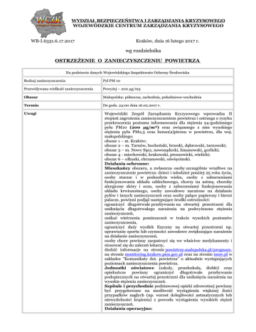 WYDZIAŁ BEZPIECZEŃSTWA I ZARZĄDZANIA KRYZYSOWEGO WOJEWÓDZKIE CENTRUM ZARZĄDZANIA KRYZYSOWEGO WB-I.6331.6.17.2017 Kraków, dnia 16 lutego 2017 r. wg rozdzielnika OSTRZEŻENIE O ZANIECZYSZCZENIU POWIETRZA Na podstawie danych Wojewódzkiego Inspektoratu Ochrony Środowiska Rodzaj zanieczyszczenia: Pył PM 10 Przewidywana wielkość zanieczyszczenia Powyżej – 200 μg/m3 Obszar Małopolska: północna, zachodnia, południowo-wschodnia Termin Do godz. 24:00 dnia 16.02.2017 r. Uwagi Wojewódzki Zespół Zarządzania Kryzysowego wprowadza II stopień zagrożenia zanieczyszczeniem powietrza i ostrzega o ryzyku przekroczenia poziomu informowania dla stężenia 24-godzinnego pyłu PM10 (200 µg/m³) oraz związanego z nim wysokiego stężenia pyłu PM2,5 oraz benzo(a)pirenu w powietrzu, dla woj. małopolskiego: obszar 1 – m. Kraków; obszar 2 – m. Tarnów, bocheński, brzeski, dąbrowski, tarnowski; obszar 3 – m. Nowy Sącz, nowosądecki, limanowski, gorlicki; obszar 4 - miechowski, krakowski, proszowicki, wielicki; obszar 6 – olkuski, chrzanowski, oświęcimski. Działania ochronne: Mieszkańcy obszaru, a zwłaszcza osoby szczególnie wrażliwe na zanieczyszczenie powietrza: dzieci i młodzież poniżej 25 roku życia, osoby starsze i w podeszłym wieku, osoby z zaburzeniami funkcjonowania układu oddechowego, chorzy na astmę, choroby alergiczne skóry i oczu, osoby z zaburzeniami funkcjonowania układu krwionośnego, osoby zawodowo narażone na działanie pyłów i innych zanieczyszczeń oraz osoby palące papierosy i bierni palacze, powinni podjąć następujące środki ostrożności: ograniczyć długotrwałe przebywanie na otwartej przestrzeni dla uniknięcia długotrwałego narażenia na podwyższone stężenia zanieczyszczeń, unikać wietrzenia pomieszczeń w trakcie wysokich poziomów zanieczyszczenia, ograniczyć duży wysiłek fizyczny na otwartej przestrzeni np. uprawianie sportu lub czynności zawodowe zwiększające narażenie na działanie zanieczyszczeń, osoby chore powinny zaopatrzyć się we właściwe medykamenty i stosować się do zaleceń lekarzy, śledzić informacje na stronie powietrze.malopolska.pl/prognozy, na stronie monitoring.krakow.pios.gov.pl oraz na stronie muw.pl w zakładce "Komunikaty dot. powietrza" o aktualnie występujących poziomach zanieczyszczenia powietrza. Jednostki oświatowe (szkoły, przedszkola, żłobki) oraz opiekuńcze powinny ograniczyć długotrwałe przebywanie podopiecznych na otwartej przestrzeni dla uniknięcia narażenia na wysokie stężenia zanieczyszczeń. Szpitale i przychodnie podstawowej opieki zdrowotnej powinny być przygotowane na możliwość wystąpienia większej ilości przypadków nagłych (np. wzrost dolegliwości astmatycznych lub niewydolności krążenia) z powodu wystąpienia wysokich stężeń zanieczyszczeń. Działania operacyjne: Apeluje się do mieszkańców obszaru o: do osób spalających węgiel lub drewno o tymczasowe zastosowanie innego dostępnego źródła ciepła np.: elektrycznego lub gazowego, a jeżeli nie jest to możliwe, zastosowanie lepszego jakościowo paliwa (węgla o zawartości popiołu poniżej 15% oraz kaloryczności co najmniej 21 MJ/kg lub drewna o wilgotności poniżej 15%). Zaprzestanie palenia w kominkach, jeżeli nie stanowią one jedynego źródła ogrzewania. Podróżowanie komunikacją zbiorową lub korzystanie z wspólnych dojazdów zamiast indywidualnych podróży samochodem, a na krótkich odcinkach przemieszczanie się pieszo lub rowerem. ograniczenie rozpalania ognisk i używania dmuchaw do liści. Władze gmin powinny podjąć intensywne kontrole w zakresie przestrzegania zakazu spalania odpadów oraz zakazu spalania pozostałości roślinnych na powierzchni ziemi. Podmioty gospodarcze powinny zawiesić uciążliwe prace budowlane w części, w której wiążą się one z dużą emisją niezorganizowaną do powietrza. Policja oraz zarządcy dróg powinni nasilić kontrole pojazdów opuszczających place budowy pod kątem ograniczenia zanieczyszczenia dróg. W przypadku temperatury powietrza powyżej 5°C Policja oraz Inspekcja Transportu Drogowego powinny prowadzić wzmożone kontrole jakości spalin w ruchu ulicznym. W przypadku temperatury powietrza powyżej 0°C oraz braku opadów w ciągu ostatniego tygodnia, zarządcy dróg powinni realizować czyszczenie ulic na mokro, natomiast podmioty gospodarcze zraszać pryzmy materiałów sypkich mogących powodować pylenie. W związku z powyższym proszę o podjęcie odpowiednich działań zapobiegawczych i ostrzegawczych oraz powiadomienie gmin, służb, straży i instytucji na podległym terenie. O wszelkich zdarzeniach mających istotne znaczenie dla bezpieczeństwa ludzi i podjętych działaniach proszę na bieżąco informować Wojewódzkie Centrum Zarządzania Kryzysowego. tel.: 12 392-13-00, fax.: 12 422-72-08, [email protected] Rozdzielnik: M CZK Kraków MCZK Tarnów MCZK Nowy Sącz PCZ Kraków PCZK Wieliczka PCZK Bochnia PCZK Brzesko PCZK Dąbrowa T. PCZK Proszowice PCZK Miechów PCZK Olkusz PCZK Chrzanów PCZK Oświęcim PCZK Limanowa PCZK Nowy Sącz PCZK Gorlice Dyżurny Operacyjny Wojewódzkiego Centrum Zarządzania Kryzysowego Piotr Rosłoniec