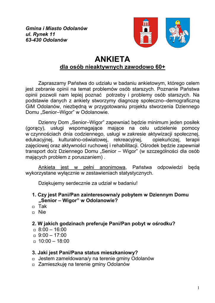 Gmina i Miasto Odolanów ul. Rynek 11 63-430 Odolanów ANKIETA dla osób nieaktywnych zawodowo 60+ Zapraszamy Państwa do udziału w badaniu ankietowym, którego celem jest zebranie opinii na temat problemów osób starszych. Poznanie Państwa opinii pozwoli nam lepiej poznać potrzeby i problemy osób starszych. Na podstawie danych z ankiety stworzymy diagnozę społeczno–demograficzną GiM Odolanów, niezbędną w przygotowaniu projektu stworzenia Dziennego Domu „Senior–Wigor” w Odolanowie. Dzienny Dom „Senior–Wigor” zapewniać będzie minimum jeden posiłek (gorący), usługi wspomagające mające na celu udzielenie pomocy w czynnościach dnia codziennego, usługi w zakresie aktywizacji społecznej, edukacyjnej, kulturalno-oświatowej, rekreacyjnej, opiekuńczej, terapii zajęciowej oraz aktywności ruchowej i rehabilitacji. Ośrodek będzie zapewniał transport do/z Dziennego Domu „Senior – Wigor” (w szczególności dla osób mających problem z poruszaniem) . Ankieta jest w pełni anonimowa, Państwa odpowiedzi wykorzystane wyłącznie w zestawieniach statystycznych. będą Dziękujemy serdecznie za udział w badaniu! 1. Czy jest Pani/Pan zainteresowna/y pobytem w Dziennym Domu „Senior – Wigor” w Odolanowie? Tak Nie 2. W jakich godzinach preferuje Pani/Pan pobyt w ośrodku? 8:00 – 16:00 9:00 – 17:00 10:00 – 18:00 3. Jaki jest Pani/Pana status mieszkaniowy? Jestem zameldowana/y na terenie gminy Odolanów Zamieszkuję na terenie gminy Odolanów 1 4. Jaka jest Pani/Pana struktura gospodarstwa domowego? Jestem osobą samotną (bez rodziny) Jestem osobą samotnie gospodarującą (posiadam rodzinę wspólnie niezamieszkującą) Zamieszkuję z rodziną 5. Jaka jest Pani/Pana sytuacja rodzinna? Zła Raczej zła Średnia Raczej dobra Dobra 6. Jaka jest Pani/Pana sytuacja materialna? Zła Raczej zła Średnia Raczej dobra Dobra 7. Jakie jest kryterium dochodowe NETTO w Pani/Pana rodzinie w przeliczeniu na jedną osobę? Do 514 zł Więcej niż 514 zł, ale nie więcej niż 634 zł Więcej niż 634 zł, ale nie więcej niż 1028 zł Więcej niż 1028 zł, ale nie więcej niż 1268 zł Więcej niż 1268 zł 8.Czy byłaby Pani gotowa/ byłby Pan gotowy do udziału w kosztach swojego pobytu w Dziennym Domu „Senior-Wigor”? nie tak, ale nie więcej niż 40 zł/mies. tak, ale nie więcej niż 80 zł/mies. tak, ale nie więcej niż 100 zł/mies. tak, ale nie więcej niż 130 zł/mies. powyżej 130zł/mies. 9. Jaka jest Pana/Pani sytuacja zdrowotna? Dobra (Jestem w pełni sprawny/a) Średnia (Potrzebuję pomocy tylko w czynnościach wymagających dużego wysiłku) Zła (Potrzebuję stałej opieki i pomocy w codziennych czynnościach) 2 10.Czy jest Pani/Pan zainteresowana/y transportem do/z Dziennego Domu „Senior-Wigor” w Odolanowie? (dotyczy w szczególności osób mających problem z poruszaniem) tak nie 11. Czy korzysta Pani/Pan z bezpłatnej opieki lekarskiej? Tak, korzystam regularnie Tak, ale chodzę do lekarza tylko wtedy gdy czuję, że coś mi dolega Nie korzystam, ponieważ (proszę podać przyczynę) ……………………………………………………………………………………… ……………………………………………………………………………………… …………………………………………………………………............................. 12. Czy robi Pani/Pan coś, żeby poprawić sprawność fizyczną? □ Tak (proszę wymienić) …………………………………………………….... ……………………………………………………………………………………… □ Nie, ale chciałabym/chciałbym tylko nie wiem jak to można zrobić □ Nie (proszę napisać dlaczego) ………………………………………………. ……………………………………………………………………………………… 13. Gdzie spędza Pani/Pan wolny czas? □ Raczej poza domem □ Czasem w domu, czasem poza domem □ Raczej w domu 14. Co Pani/Pana zdaniem sprawia, że starsze osoby spędzają wolny czas w domu nawet jeżeli są w pełni sprawni? □ Brak atrakcji dla osób starszych □ Brak informacji o tym, co można robić poza domem □ Inne (proszę wpisać jakie)………………………………………………....… …………………………………………………………………………………….. 15. W jakich formach spędzania wolnego czasu chciałaby Pani/chciałby Pan uczestniczyć: poszerzanie wiedzy - zajęcia edukacyjne (proszę podać typ zajęć) np. języki obce, posługiwanie się komputerem i Internetem, obsługa bankomatów i kart płatniczych, literatura i sztuka, zdrowie lub inne (jakie?)………………………………………………………………………… ………………………………………………………………………............... udział w inicjatywach o charakterze kulturalnym wycieczki turystyczne gry towarzyskie 3 czytanie literatury, prasy spotkania tematyczne, których celem byłaby pomoc w radzeniu sobie z problemami wieku starszego zajęcia sportowe (proszę podać typ zajęć)……………………………...... ……………………………………………………………………………………. zajęcia plastyczne inne (jakie?) ………………………………………………………………...... ………………………………………………………………………………... 16.Jakie problemy społeczne, Pani/a zdaniem, najczęściej dotykają osób starszych? ubóstwo i bieda niepełnosprawność brak opieki ze strony rodziny choroby, samotność niedostosowanie społeczne bariery architektoniczne utrudniony dostęp do placówek rehabilitacyjnych utrudniony dostęp do usług opiekuńczych brak akceptacji w środowisku lokalnym inne (jakie?) …………………………………………………………….... …………