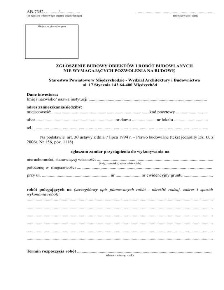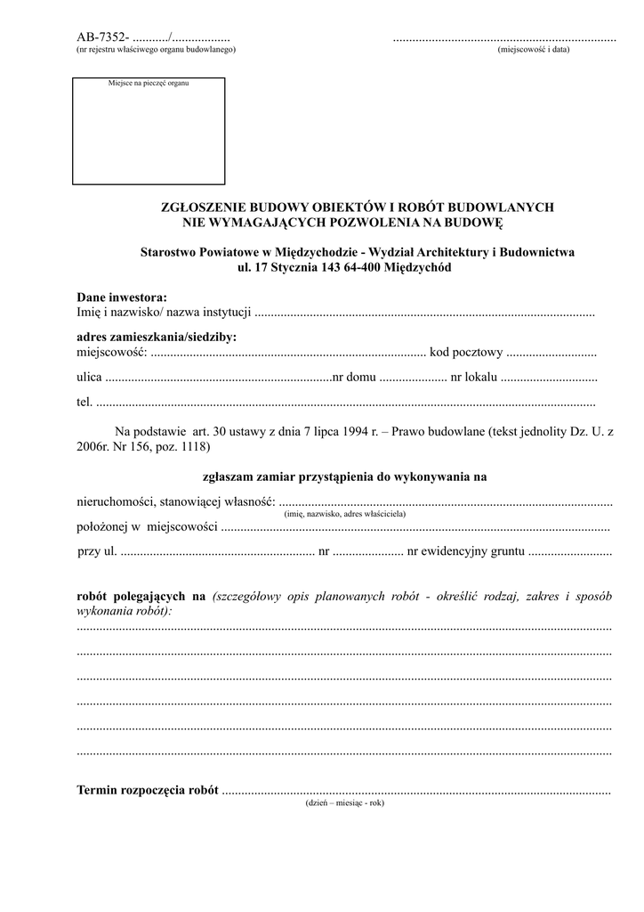 AB-7352- .........../.................. ..................................................................... (nr rejestru właściwego organu budowlanego) (miejscowość i data) Miejsce na pieczęć organu ZGŁOSZENIE BUDOWY OBIEKTÓW I ROBÓT BUDOWLANYCH NIE WYMAGAJĄCYCH POZWOLENIA NA BUDOWĘ Starostwo Powiatowe w Międzychodzie - Wydział Architektury i Budownictwa ul. 17 Stycznia 143 64-400 Międzychód Dane inwestora: Imię i nazwisko/ nazwa instytucji ......................................................................................................... adres zamieszkania/siedziby: miejscowość: ..................................................................................... kod pocztowy ............................ ulica ......................................................................nr domu ..................... nr lokalu .............................. tel. .......................................................................................................................................................... Na podstawie art. 30 ustawy z dnia 7 lipca 1994 r. – Prawo budowlane (tekst jednolity Dz. U. z 2006r. Nr 156, poz. 1118) zgłaszam zamiar przystąpienia do wykonywania na nieruchomości, stanowiącej własność: ....................................................................................................... (imię, nazwisko, adres właściciela) położonej w miejscowości ........................................................................................................................ przy ul. ............................................................ nr ...................... nr ewidencyjny gruntu .......................... robót polegających na (szczegółowy opis planowanych robót - określić rodzaj, zakres i sposób wykonania robót): ..................................................................................................................................................................... ..................................................................................................................................................................... ..................................................................................................................................................................... ..................................................................................................................................................................... ..................................................................................................................................................................... ..................................................................................................................................................................... Termin rozpoczęcia robót ........................................................................................................................ (dzień – miesiąc - rok) Proszę o wydanie zaświadczenia ( tak / nie ) * W załączeniu przedkładam: * 1. oświadczenie o posiadanym prawie do dysponowania nieruchomością na cele budowlane, 2. mapę geodezyjną z zaznaczonym obiektem w przedmiotowej sprawie, 3. szkice i rysunki. 4. ........................................................................................................................................................................................ 5. ........................................................................................................................................................................................ 6. ........................................................................................................................................................................................ Pouczenie: Do wykonania robót budowlanych można przystąpić, jeżeli w terminie 30 dni od dnia doręczenia zgłoszenia właściwy organ nie wniesie, w drodze decyzji, sprzeciwu i nie później niż po upływie 2 lat od określonego w zgłoszeniu terminu ich rozpoczęcia, (art. 30 ust. 5 ustawy - Prawo Budowlane). * niepotrzebne skreślić pkt 2 (wypełnia wnioskodawca zaznaczając właściwe kwadraty pola oznaczone kolorem szarym wypełnia pracownik) budownictwo mieszkaniowe (w tym urządzenia i budowle z nimi związane) jednostki budżetowe pkt 3 jednostki samorządu terytorialnego O OPŁATA SKARBOWA Nie podlega art. 2 ust.1 pkt 2 art. 7 zwolnienie kwota pełnomocnictwo Zaświadczenie (za każde) inne przypadki przewidziane ustawą, art. ....... pobrana 17 zł 17 zł x ........ = należna dopłata zwrot zweryfikowano wysokość pobranej opłaty suma potwierdzenie przyjęcia opłaty dopłaty nr pokwitowania data wpłaty podpis i pieczęć podpis i pieczęć osoby przyjmującej 47 9082 0005 0000 3636 2000 0010 47 9082 0005 0000 3636 2000 0010 wysokość opłaty zostanie zweryfikowana po opracowaniu dokumentu wg przepisów ustawy o opłacie skarbowej z dnia 16 listopada 2006 roku (Dz. U. nr 225 poz.1635) ................................................................................... (podpis inwestora lub osoby przez niego upoważnionej)