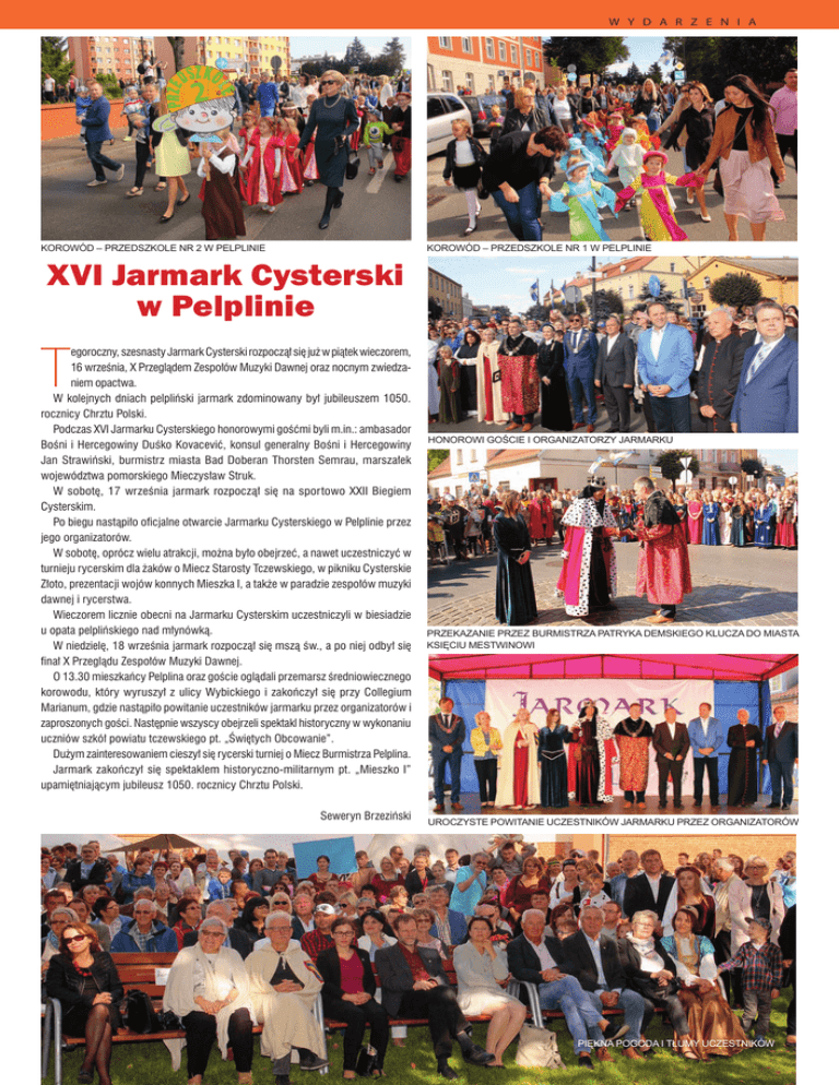 W Y D A R Z E N I A KOROWÓD – PRZEDSZKOLE NR 2 W PELPLINIE KOROWÓD – PRZEDSZKOLE NR 1 W PELPLINIE XVI Jarmark Cysterski w Pelplinie T egoroczny, szesnasty Jarmark Cysterski rozpoczął się już w piątek wieczorem, 16 września, X Przeglądem Zespołów Muzyki Dawnej oraz nocnym zwiedzaniem opactwa. W kolejnych dniach pelpliński jarmark zdominowany był jubileuszem 1050. rocznicy Chrztu Polski. Podczas XVI Jarmarku Cysterskiego honorowymi gośćmi byli m.in.: ambasador Bośni i Hercegowiny Duśko Kovacević, konsul generalny Bośni i Hercegowiny Jan Strawiński, burmistrz miasta Bad Doberan Thorsten Semrau, marszałek województwa pomorskiego Mieczysław Struk. W sobotę, 17 września jarmark rozpoczął się na sportowo XXII Biegiem Cysterskim. Po biegu nastąpiło oficjalne otwarcie Jarmarku Cysterskiego w Pelplinie przez jego organizatorów. W sobotę, oprócz wielu atrakcji, można było obejrzeć, a nawet uczestniczyć w turnieju rycerskim dla żaków o Miecz Starosty Tczewskiego, w pikniku Cysterskie Złoto, prezentacji wojów konnych Mieszka I, a także w paradzie zespołów muzyki dawnej i rycerstwa. Wieczorem licznie obecni na Jarmarku Cysterskim uczestniczyli w biesiadzie u opata pelplińskiego nad młynówką. W niedzielę, 18 września jarmark rozpoczął się mszą św., a po niej odbył się finał X Przeglądu Zespołów Muzyki Dawnej. O 13.30 mieszkańcy Pelplina oraz goście oglądali przemarsz średniowiecznego korowodu, który wyruszył z ulicy Wybickiego i zakończył się przy Collegium Marianum, gdzie nastąpiło powitanie uczestników jarmarku przez organizatorów i zaproszonych gości. Następnie wszyscy obejrzeli spektakl historyczny w wykonaniu uczniów szkół powiatu tczewskiego pt. „Świętych Obcowanie”. Dużym zainteresowaniem cieszył się rycerski turniej o Miecz Burmistrza Pelplina. Jarmark zakończył się spektaklem historyczno-militarnym pt. „Mieszko I” upamiętniającym jubileusz 1050. rocznicy Chrztu Polski. Seweryn Brzeziński HONOROWI GOŚCIE I ORGANIZATORZY JARMARKU PRZEKAZANIE PRZEZ BURMISTRZA PATRYKA DEMSKIEGO KLUCZA DO MIASTA KSIĘCIU MESTWINOWI UROCZYSTE POWITANIE UCZESTNIKÓW JARMARKU PRZEZ ORGANIZATORÓW PIĘKNA POGODAPELPLIŃSKI I TŁUMY UCZESTNIKÓW INFORMATOR 9