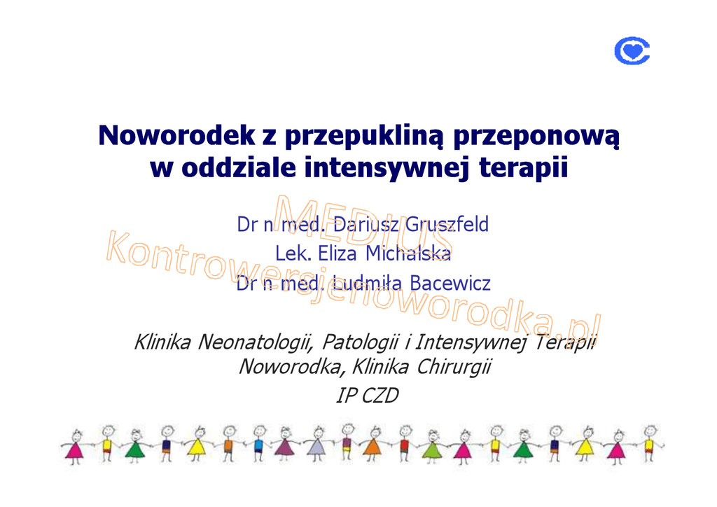 Noworodek z przepukliną przeponową w oddziale intensywnej terapii Dr n med. Dariusz Gruszfeld Lek. Eliza Michalska Dr n med. Ludmiła Bacewicz Klinika Neonatologii, Patologii i Intensywnej Terapii Noworodka, Klinika Chirurgii IP CZD CDH – congenital diaphragmatic hernia Definicja Ambrose Pare (1575) pierwszy opis przepukliny przeponowej „defekt rozwoju przepony płodu prowadzący do wpuklenia narządów jamy brzusznej do klatki piersiowej” Fanaroff and Martin’s Neonatal-Perinatal Medicine, 2006 Epidemiologia ● 3,5 na 10,000 żywych urodzeń (= ok. 1:3000 ur.) ● Wright JC, Budd JL, Field DJ, Draper ES. Epidemiology and outcome of congenital diaphragmatic hernia: a 9-year experience. Paediatr Perinat Epidemiol 2011 Śmiertelność Matthew T. Harting, Kevin P. Lally, The Congenital Diaphragmatic Hernia Study Group registry update, Seminars in Fetal & Neonatal Medicine 19 (2014) 370e37 Etiologia 40% - element zespołu wad wrodzonych Wady towarzyszące: układ krążenia, układ moczowo-płciowy, przewód pokarmowy nieprawidłowy kariotyp w 4% Śmiertelność w przypadku wad towarzyszących do 85%* Etiologia niejasna Czynniki genetyczne wieloczynnikowa Czynniki zewnętrzne Hipoteza „double hit” (?)** *Deprest J et al. J Pediatr Surg. 2012; ** Keijzer R et al. Am J Pathol 2000 Patofizjologia 95% - ubytek w części tylno-bocznej przepony (otwór Bochdaleka) 80% - lewostronny 5% - ubytek w okolicy zamostkowej (otwór Mrgagni’ego) początek w I trymestrze Lally et al. Congenital diaphragmatic hernia. Curr Opin Pediatr 2002;14:486-490 Narządy jamy brzusznej w klatce piersiowej Hipoplazja płuc, zwłaszcza po stronie ubytku Niedorozwój naczyń płucnych → nadciśnienie płucne Rozpoznanie prenatalne USG MRI Czynniki rokownicze LHR „lung „lung--toto-head ratio” O/E LHR Metkus AP, et al. Sonographic predictors of survival in fetal diaphragmatic hernia. J Pediatr Surg 1996;31(1):148– 51 [discussion: 151–2]. Położenie wątroby „liver up/down” Kitano Y et al. Liver position in fetal congenital diaphragmatic hernia retains a prognostic value in the era of lung-protective strategy. J Pediatr Surg 2005;40(12):1827–32. MRI TLV – „Total Lung Volume” Lee TC et al. J Pediatr Surg 2011; Büsing KA et al. Radiology 2008 Postępowanie prenatalne Leki prenatalnie Vitamina A - 1 „case report” Steroidy - 1 RCT (brak efektu) TRH - brak badań Sildenafil - brak badań Imatinib - 1 „case report” Komórki macierzyste - brak badań Open fetal surgery* FETO *Sydorak RM, Harrison MR. Clin Perinatol. 2003 - brak przewagi Postępowanie po urodzeniu ośrodki: >20 pacjentów/rok; przeżywalność >75% stopień rekomendacji: „D” wg. SIGN criteria Sala porodowa Poród w ośrodku referencyjnym (>6/rok) PSN vs. CC – przewaga CC (?) elektywna intubacja (nie wentylować przez maskę!) dążyć do SaO2 80-95% przedprzewodowo ciś. szczytowe max. 25 cm H20 sonda odbarczająca do żołądka monitorowanie BP (docelowo inwazyjny pomiar na prawej t. promieniowej) leczenie hipotensji (10-20 ml/kg 0,9%NaCl; ew. leki inotropowe) nie podawać rutynowo surfaktantu Wentylacja SaO2 przedprzewodowo 85(80*)-95%, zaprzewodowo > 70% PaCO2 45-60 mm Hg PIP 20-25 cm H20; PEEP 2-5 cm H20; 40-60 oddechów/min HFOV – wstępne nastawy: MAP 13-17 cm H2O; f-10 Hz, delta-p 30-50 obniżanie FiO2, jeżeli SaO2 przedprzewodowa powyżej 95% Sedacja; nie zaleca się rutynowo zwiotczenia Płyny: restrykcje w 1 dobie ż. Nadciśnienie płucne ECHO w ciągu 24h Jeżeli nadciśnienie płucne → utrzymać BP w granicach normy iNO jeżeli przeciek P-L & OI >20 (i/lub różnica SaO2>10%) Jeżeli ciśnienie ponad-systemowe w PA i przeciek P-L przez FO rozważyć PGE1 (Prostin) Leki nie objęte konsensusem CDH Euro Consortium ! Bozentan – brak badań Imatinib – brak badań Sildenafil – tylko w okresie przewlekłym Prostacyklina (Flolan) – pojedyncze doniesienia Milrinon* - korzyści w serii 6 przypadków *Patel N. Neonatology 2012 ECMO - wskazania Brak możliwości utrzymania przedprzewodowej SaO2>85% lub zaprzewodowej >70% ↑PaCO2 z kwasicą oddechową pH<7,15 PIP>28 cm H2O lub MAP>17 cm H2O Kwasica metaboliczna: mleczany >=5 mmol/l (45 mg/dl) Hipotensja oporna na terapię z oligurią <0,5 ml/kg/g przez ponad 12-24 godz Indeks oksygenacji stale >=40 Optymalny czas zabiegu 1385 noworodków, 65 ośrodków, 2007-2012 Śmiertelność wyższa gdy zabieg odroczony 4-7 dni (OR=2,98); >8 dni (OR=3,42) Po uwzględnieniu stopnia ciężkości wady – brak różnic Hollinger LE et al. Surgery. 2014 Optymalny czas zabiegu Po uzyskaniu stabilizacji parametrów życiowych BP w normie dla wieku postkoncepcyjnego SaO2>85% przy FiO2 <50% Mleczany <3 mmol/l (28 mg/dl) Diureza >2 ml/kg/g Można rozważyć zabieg operacyjny na ECMO Basiewicz-Ślączka E, WołoszczukBasiewiczWołoszczuk-Gębicka B, Yaqoub S, Kamiński A. The value of the oxygenation index in the prediction of postnatal outcome in infants with congenital diaphragmatic hernia. hernia. Medycyna Wieku Rozwojowego [w druku] Materiał IP CZD 154 dzieci (1981(1981-2015) Płeć Śmiertelność IP CZD (%) 60 50 M 50 43 Ż 42 40 25 30 25 25 21 20 10 38% 0 62% Liczba dzieci w okresie 45 40 35 30 25 20 15 10 5 0 40 33 16 8 12 16 28 Materiał 2 ośrodków warszawskich (2006(2006-2014) IP CZD Liczba - 59 GA – 38,3 Hbd Śr. masa ur. – 3177 g L/P – 73% L (4 LP) Zabieg śr. w 4 (1-22) d.ż. Bez zabiegu – 9 (15%) iNO – 34% HFO – 40% Rodzaj zabiegu – laparotomia, torakoskopia (25%), GoreTex Przeżywalność – 71% KAiIT, WUM – Litewska Liczba - 58 Śr. GA – 37,5 Hbd Śr. masa ur. – 3015 g L/P - ? Zabieg śr. w 4 (1-20) d.ż. Bez zabiegu – 8 (14%) iNO – 75,8% HFO – 100% Rodzaj zabiegu – laparotomia, GoreTex Przeżywalność – 74% KONTROWERSJE Kontrowersje iNO Neonatal Inhaled Nitric Oxide Study (NINOS) RCT, 13 ośrodków 25 otrzymywało iNO (20 ppm) vs. 28 grupa kontrolna Wnioski: Krótkookresowa poprawa utlenowania Brak wpływu na śmiertel