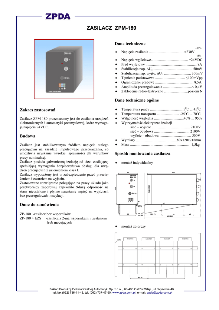 ZASILACZ ZPM-180 Dane techniczne +10% ♦ Napięcie zasilania ......................................≈230V ♦ ♦ ♦ ♦ ♦ ♦ ♦ ♦ Napięcie wyjściowe........................................ =24VDC Prąd wyjściowy ....................................................... 8A Stabilizacja nap. ∆Us .......................................... 50mV Stabilizacja nap. wyjśc. ∆Ui ............................. 300mV Tętnienie podstawowe ................................ ≤100mVpp Ograniczenie prądowe ......................................... 8,5A Amplituda przeregulowania ...............................< 0,4V Zakłócenie radioelektryczne ..........................poziom N −15% Dane techniczne ogólne Budowa Zasilacz jest stabilizowanym źródłem napięcia stałego pracującym na zasadzie impulsowego przetwarzania, co umożliwia uzyskanie wysokiej sprawności dla warunków pracy nominalnej. Zasilacz posiada galwaniczną izolację od sieci zasilającej spełniającą wymagania bezpieczeństwa obsługi dla urządzeń pracujących z uziemieniem klasa I. Zasilacz wyposażony jest w zabezpieczenie przed przeciążeniem i zwarciem na wyjściu. Zastosowane rozwiązanie polegające na pracy układu jako przetwornicy zaporowej zapewniło 9dużą odporność na stany nieustalone i płynne narastanie napięć na wyjściach bez przeregulowań i oscylacji. ♦ ♦ Sposób montowania zasilacza ♦ montaż indywidualny 218 80 ZWB-08 24V/ 8A B1 2A L N Dane do zamówienia ZP-180 -zasilacz bez wsporników ZP-180 + EZS -zasilacz z 2-ma wspornikami i zestawem śrub mocujących Temperatura pracy ................................... 50C ... 450C Temperatura transportu ........................ -250C ... 700C Wilgotność względna ................................40% ... 95% Wytrzymałość elektryczna izolacji sieć – wyjście ......................................... 2100V sieć – obudowa ...................................... 2100V wyjście – obudowa .................................. 500V Wymiary ............................................80x120x218mm Masa ................................................................. 1,5kg RADIATOR Zasilacz ZPM-180 przeznaczony jest do zasilania urządzeń elektronicznych i automatyki przemysłowej, które wymagają napięcia 24VDC. ♦ ♦ ♦ ♦ 120 Zakres zastosowań M4 φ5 śruba M4x10 68 ♦ szafa otw. φ5 pod M4 MIN 70 90 MIN 245 40 montaż zbiorczy RADIATOR RADIATOR RADIATOR MIN 100 Zakład Produkcji Doświadczalnej Automatyki Sp. z o.o. , 63-400 Ostrów Wlkp., ul. Wysocka 46 tel./fax (062) 736-11-43, tel. (062) 737-47-90, www.zpda.com.pl, e-mail: [email protected] RADIATOR
