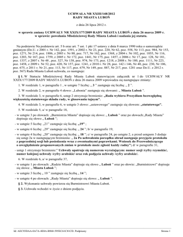 UCHWAŁA NR XXIII/148/2012 RADY MIASTA LUBOŃ z dnia 26 lipca 2012 r. w sprawie zmiany UCHWAŁY NR XXIX/177/2009 RADY MIASTA LUBOŃ z dnia 26 marca 2009 r. w sprawie: powołania Młodzieżowej Rady Miasta Luboń i nadania jej statutu. Na podstawie Na podstawie art. 5 b oraz art. 7 ust. 1 pkt 17 ustawy z dnia 8 marca 1990 roku o samorządzie gminnym (Dz.U. z 2001 r. Nr 142, poz. 1591, z 2002 r. Nr 23, poz. 220, Nr 62, poz. 558, Nr 113, poz. 984, Nr 153, poz. 1271, Nr 214, poz. 1806, z 2003 r. Nr 80, poz. 717, Nr 162, poz. 1568, z 2004 r. Nr 102, poz. 1055, Nr 116, poz. 1203, Nr 167, poz. 1759, z 2005 r. Nr 172, poz. 1441, Nr 175, poz. 1457, z 2006 r. Nr 17, poz. 128, Nr 181, poz. 1337, z 2007 r. Nr 48 , poz. 327, Nr 138, poz. 974, Nr 173, poz. 1218, z 2008 r. Nr 180, poz. 1111, Nr 223, poz. 1458, z 2009 r. Nr 52, poz. 420, Nr 157, poz. 1241, z 2010 r. Nr 28, poz. 142 i 146, Nr 40, poz. 230, Nr 106, poz. 675, z 2011 r. Nr 21, poz. 113, Nr 117, poz. 679, Nr 149, poz. 887, Nr 217, poz. 1281 oraz Dz.U. z 2012 r. poz. 567) Rada Miasta Luboń uchwala, co następuje: § 1. W Statucie Młodzieżowej Rady Miasta Luboń stanowiącym załącznik nr 1 do UCHWAŁY NR XXIX/177/2009 RADY MIASTA LUBOŃ z dnia 26 marca 2009 wprowadza się następujące zmiany: 1. W rozdziale 1, w paragrafie 1 , w ustępie 7 liczbę: „ 3 ” zastępuje się liczbą: „ 2 ”. 2. W rozdziale 2, w paragrafie 4 słowo: „Lubonia” zastępuje się słowami: „ Miasta Luboń ”. 3. W rozdziale 3, w paragrafie 6, ustęp 2 otrzymuje brzmienie: „Rada wybiera Prezydium bezwzględną większością statutowego składu rady, w głosowaniu tajnym”. 4. W rozdziale 3, w paragrafie 6, w ustępie 3 słowo: „ustawowego” zastępuje się słowem: „statutowego”. 5. W rozdziale 5, a/ w paragrafie 18, - w ustępie 3 po słowach: „Burmistrza Miasta” dopisuje się słowo: „ Luboń ” oraz po słowach:„Rady Miasta” dopisuje się słowo „ Luboń ”; - w ustępie 5 liczbę: „21” zastępuje się liczbą: „19” ; - w ustępie 6 liczbę: „29” zastępuje się liczbą: „ 24 ”; b/ w paragrafie 19, - w ustępie 4 liczbę: „20” zastępuje się liczbą: „ 18 ”; c/ w paragrafie 24, po ustępie 2, a przed ustępem 3 dodaje się ustęp 2a w następującym brzmieniu: „ 2a Po uchwaleniu porządku obrad następuje przyjęcie protokołu z poprzedniej sesji lub posiedzenia wraz z ewentualnymi poprawkami. Wniosek do Przewodniczącego o uwzględnienie proponowanych zmian w protokole może zgłosić każdy radny”; d/ w paragrafie 31, - ustęp 1 otrzymuje brzmienie:” Uchwały opatruje się numerem wyrażającym: numer sesji /cyfry rzymskie/, numer kolejnej uchwały /cyfry arabskie/ oraz rok podjęcia uchwały /cyfry arabskie/. 6. W rozdziale 6, a/ w paragrafie 37, - w ustępie 1 po słowach: „Radzie Miasta” dopisuje się słowo „ Luboń ” oraz po słowie: „Burmistrzowi” dopisuje się słowa: „ Miasta Luboń ”; - w ustępie 3 liczbę „ 10 ” zastępuje się liczbą „ 14 ”; - w ustępie 4 po słowach: „Rady Miasta” dopisuje się słowo: „ Luboń ”. § 2. Wykonanie uchwały powierza się Burmistrzowi Miasta Luboń. § 3. Uchwała wchodzi w życie z dniem podjęcia. ————————————————————————————————————————————————————————— Id: AEC93DAA-0A7A-4E0A-B968-595EC61C81CD. Podpisany Strona 1 Uzasadnienie do UCHWAŁY NR XXIII/148/2012 RADY MIASTA LUBOŃ z dnia 26 stycznia 2012 roku w sprawie: zmiany UCHWAŁY NR XXIX/177/2009 RADY MIASTA LUBOŃ z dnia 26 marca w sprawie : powołania Młodzieżowej Rady Miasta Luboń i nadania jej statutu. Szczegółowa analiza zapisów statutu Młodzieżowej Rady Miasta Luboń wskazała, że należy skorygować niektóre zapisy, a niektóre doprecyzować. Dlatego też wprowadzenie zmian w statucie jest zasadne. ————————————————————————————————————————————————————————— Id: AEC93DAA-0A7A-4E0A-B968-595EC61C81CD. Podpisany Strona 1