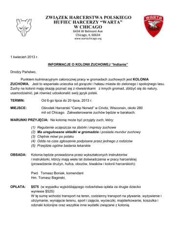 ZWIĄZEK HARCERSTWA POLSKIEGO HUFIEC HARCERZY “WARTA” W CHICAGO 6434 W Belmont Ave Chicago, IL 60634 www.wartachicago.org 1 kwiecień 2013 r. INFORMACJE O KOLONII ZUCHOWEJ “Indianie” Drodzy Państwo, Punktem kulminacyjnym całorocznej pracy w gromadach zuchowych jest KOLONIA ZUCHOWA. Jest to wspaniała ucieczka od gorączki i hałasu miasta do zielonego i spokojnego lasu. Zuchy na kolonii mają okazję poznać się z rówieśnikami z innych gromad, zbliżyć się do natury, usamodzielnić, jak również udoskonalić swój język polski. TERMIN: Od 6-go lipca do 20 lipca, 2013 r. MIEJSCE: Ośrodek Harcerski “Camp Norwid” w Crivitz, Wisconsin, około 280 mil od Chicago. Zakwaterowanie zuchów będzie w barakach. WARUNKI PRZYJĘCIA: Na kolonię może być przyjęty zuch, który: (1) (2) (3) (4) (5) OBSADA: Regularnie uczęszcza na zbiórki i imprezy zuchowe Ma uregulowane składki w gromadzie i posiada mundur zuchowy Chętnie mówi po polsku Odda na czas zgłoszenie podpisane przez jednego z rodziców Przejdzie ogólne badania lekarskie Kolonia będzie prowadzona przez wykształconych instruktorów i instruktorki, którzy mają wiele lat doświadczenia w pracy harcerskiej (prowadzenie drużyn, hufca, obozów, biwaków i kolonii harcerskich): Pwd. Tomasz Boniak, komendant Hm. Tomasz Baginski, OPŁATA: $575 (w wypadku wyjeżdżającego rodzeństwa opłata za drugie dziecko wyniesie $525) W tę sumę wchodzi transport na teren, codzienny transport na pływanie, wyżywienie i utrzymanie, wynajęcie terenu, sport i zajęcia, wycieczki, majsterkowanie, koszulka i odznaki kolonijne oraz wszytkie inne wydatki związane z kolonią. ZGŁOSZENIA I CZEKI Z ZALICZKĄ $300 NALEŻY WYSŁAĆ DO 5-GO MAJA: Hm. Tomasz Baginski (skarbnik) 3000 Banbury Ln. Lake in the Hills, IL 60045 Czeki lub “money order” na PSO-ZHP, INC. UWAGA! JEŚLI PIECZĄTKA BĘDZIE PO 10-GO MAJA, NALEŻY DOPŁACIĆ $20 KARY. 10-go maja nie gwarantujemy miejsc. DRUGA WPŁATA: DO 10-GO CZERWCA ($20 kary po terminie). BADANIE LEKARSKIE: Dalsze informacje będą podane tym zuchom, które zapisały się na kolonię. DODATKOWE INFORMACJE: Z pytaniami prosimy zwracać się do wodzów gromad lub do: Dha Tomka Boniaka, tel. (847)942-3495 Dha Tomka Baginskiego, tel. (773)251-2664 APEL: Kolonia nie może odbyć się bez pomocy rodziców. Potrzebne są osoby do gotowania posiłków i utrzymywania porządku na terenie. Prosimy chętnych o zgłaszanie się. Z góry dziękujemy Państwu za współpracę i łączymy nasze serdeczne zuchowe pozdrowienie. CZUJ! Hm. Zygmunt Figol Hufcowy, Hufiec “Warta” Pwd. Tomasz Boniak Komendant Kolonii Po Zwiazek Harcerstwa Polskiego Choragiew Harcerzy w U.S.A. Hufiec Harcerzy "WARTA" w Chicago POZWOLENIE RODZICOW PARENTAL PERMISSION Polish Scouting Organization - Z.H.P., Inc. Boys Division in U.S.A. Chicago Chapter Zezwalam mojemu dziecku ______________________________________ _______________________________ I hereby give permission for my child or ward First Name / Imie Last Name / Nazwisko Data Urodzenia ____ / ____ / ____ Wiek ________ Rozmiar ________ Telefon Domowy _________________ Date of Birth Age T-Shirt Size Home Phone Adres _________________________________________ Miasto ___________________ Stan ____ State Zip Code _____________ Address City Gromada _____________________________________ Email __________________________________________ Troop Name To participate in activity Na wziecie udzialu w Kolonii Zuchowej HUFIEC WARTA Data Pod Opieka Tomasz Boniak, Tomasz Baginski 7/6/2013 - 7/20/2013 Camp Norwid, Crivitz, Wisconsin Under the supervision of Leader in charge Imie I Nazwisko Kierownika Miejscowosc / Location Imie i Nazwisko Ojca ______________________________________ Telefon do pracy lub komorkowy ____________________ Father's name Work phone or Cell phone Imie i Nazwisko Matki _____________________________________ Telefon do pracy lub komorkowy ____________________ Mother's name Work phone or Cell phone W przypadku nieobecnosci rodzicow w domu prosze powiadomic : In case of emergency if parents are not home please notify: Imie i nazwisko ________________________________ Telefon ___________________ Pokrewienstwo _____________________ Name Phone Relationship ZRZECZENIE / WAIVER OF LIABILITY: Zezwalam swemu dziecku, wymienionemu wyzej, na wziecie udzialu w wymienionej wyprawie. Zobowiazuje sie nie wnosic zadnych zadan ani nie wszczynac zadnych akcji prawnych przeciwko komendzie lub obsadzie w wypadku obrazen poniesionych przez moje dziecko podczas trwania wyprawy. Niniejszym pozwalam lekarzowi wybranemu przez komende do zlecenia przeswietlen, badan I prostych zabiegow koniecznych dla zdrowia mojego dziecka, a w naglych wypadkach, gdy nie bedzie mozliwe porozumienia sie ze mna, zezwalam temu lekarzowi na skierowanie mego dziecka do szpitala, zarzadzenie odpowiednich zabiegow, zastrzykow, znieczulen, i operacji. Uznanym jest ze jezeli jeden rodzic podpisal upowaznienie i zrzecenie to z wiedza i zgoda drugiego rodzica. I give pemission to my child named on this form, to take part in the named activity I waive any daim, demand or cause of action, legal or equitable against its Officers and staff for any injuries to my child that rnght be sustained by her/him during the period of the program. I also give perrnssion to the physidan selected by the activity Director to order X-rays. routine tests and treatment for the health of my child and, in the event that I cannot be reached in an emergency, I hereby give permission to the physician selected by the activity Director to hospitalize, secure proper treatment for and to order injection and/or surgery for my child named herein. It is further warranted that if this consent form is signed by one of two parents or guardians, it is with the authority of the other. ______________________ data / date _______________________________________________________________________ Podpis rodzica / Signature of parent Dziecko może być odebrane przez: (Child