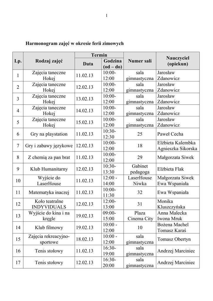 1 Harmonogram zajęć w okresie ferii zimowych Lp. 1 2 3 4 5 6 7 8 9 10 11 12 13 14 15 16 17 Termin Rodzaj zajęć Godzina Data (od – do) Zajęcia taneczne 10:0011.02.13 Hokej 12:00 Zajęcia taneczne 10:0012.02.13 Hokej 12:00 Zajęcia taneczne 10:0013.02.13 Hokej 12:00 Zajęcia taneczne 10:0014.02.13 Hokej 12:00 Zajęcia taneczne 10:0015.02.13 Hokej 12:00 10:30Gry na playstation 11.02.13 12:30 10:00Gry i zabawy językowe 12.02.13 12:00 10:00Z chemią za pan brat 11.02.13 12:00 10:30Klub Humanitarny 12.02.13 13:30 Wyjście do 12:00 11.02.13 LaserHouse 14:00 10:00Matematyka inaczej 11.02.13 11:30 Koło teatralne 12:0012.02.13 INDYVIDUALS 13:00 Wyjście do kina i na 09:0019.02.13 kręgle 15:00 10:00 Klub filmowy 19.02.13 12:00 Zajęcia rekreacyjno10:00 18.02.13 sportowe 12:00 16:30Tenis stołowy 11.02.13 19:00 16:30Tenis stołowy 12.02.13 20:00 Numer sali sala gimnastyczna sala gimnastyczna sala gimnastyczna sala gimnastyczna sala gimnastyczna Nauczyciel (opiekun) Jarosław Zdanowicz Jarosław Zdanowicz Jarosław Zdanowicz Jarosław Zdanowicz Jarosław Zdanowicz 25 Paweł Cecha 18 Elżbieta Kalembka Agnieszka Sikorska 29 Małgorzata Siwek Gabinet pedagoga LaserHouse Niwka 32 Elżbieta Flak Małgorzata Siwek Ewa Wspaniała Ewa Wspaniała Monika Kluszczyńska Plaza Anna Malecka Cinema City Iwona Mruk Bożena Machel 10 Tomasz Karaś sala Tomasz Obertyn gimnastyczna sala Andrzej Marciniec gimnastyczna sala Andrzej Marciniec gimnastyczna 31 2 18 Tenis stołowy 14.02.13 19 Tenis stołowy 15.02.13 20 Tenis stołowy 18.02.13 21 Tenis stołowy 19.02.13 22 Tenis stołowy 21.02.13 23 Tenis stołowy 22.02.13 16:3019:00 16:3019:00 16:3019:00 16:3020:00 16:3019:00 16:3019:00 sala gimnastyczna sala gimnastyczna sala gimnastyczna sala gimnastyczna sala gimnastyczna sala gimnastyczna Andrzej Marciniec Andrzej Marciniec Andrzej Marciniec Andrzej Marciniec Andrzej Marciniec Andrzej Marciniec