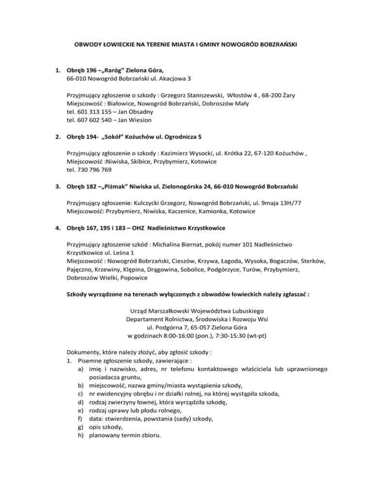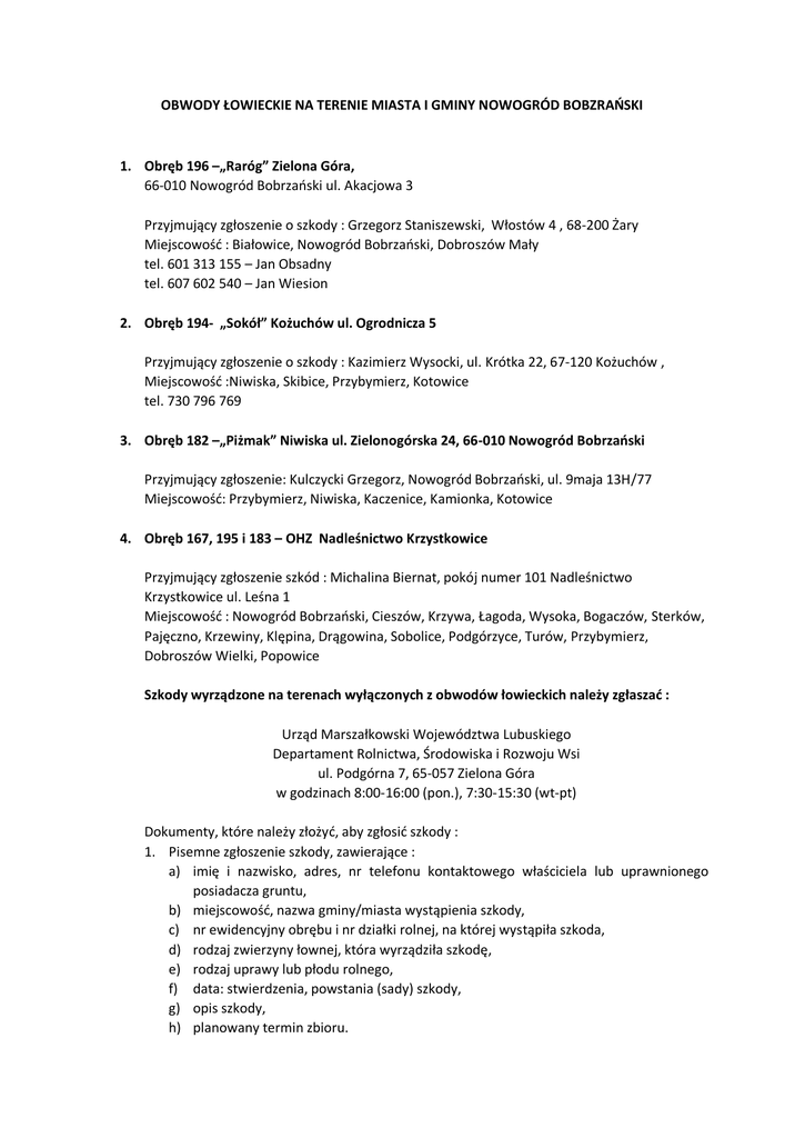 OBWODY ŁOWIECKIE NA TERENIE MIASTA I GMINY NOWOGRÓD BOBZRAŃSKI 1. Obręb 196 –„Raróg” Zielona Góra, 66-010 Nowogród Bobrzański ul. Akacjowa 3 Przyjmujący zgłoszenie o szkody : Grzegorz Staniszewski, Włostów 4 , 68-200 Żary Miejscowość : Białowice, Nowogród Bobrzański, Dobroszów Mały tel. 601 313 155 – Jan Obsadny tel. 607 602 540 – Jan Wiesion 2. Obręb 194- „Sokół” Kożuchów ul. Ogrodnicza 5 Przyjmujący zgłoszenie o szkody : Kazimierz Wysocki, ul. Krótka 22, 67-120 Kożuchów , Miejscowość :Niwiska, Skibice, Przybymierz, Kotowice tel. 730 796 769 3. Obręb 182 –„Piżmak” Niwiska ul. Zielonogórska 24, 66-010 Nowogród Bobrzański Przyjmujący zgłoszenie: Kulczycki Grzegorz, Nowogród Bobrzański, ul. 9maja 13H/77 Miejscowość: Przybymierz, Niwiska, Kaczenice, Kamionka, Kotowice 4. Obręb 167, 195 i 183 – OHZ Nadleśnictwo Krzystkowice Przyjmujący zgłoszenie szkód : Michalina Biernat, pokój numer 101 Nadleśnictwo Krzystkowice ul. Leśna 1 Miejscowość : Nowogród Bobrzański, Cieszów, Krzywa, Łagoda, Wysoka, Bogaczów, Sterków, Pajęczno, Krzewiny, Klępina, Drągowina, Sobolice, Podgórzyce, Turów, Przybymierz, Dobroszów Wielki, Popowice Szkody wyrządzone na terenach wyłączonych z obwodów łowieckich należy zgłaszać : Urząd Marszałkowski Województwa Lubuskiego Departament Rolnictwa, Środowiska i Rozwoju Wsi ul. Podgórna 7, 65-057 Zielona Góra w godzinach 8:00-16:00 (pon.), 7:30-15:30 (wt-pt) Dokumenty, które należy złożyć, aby zgłosić szkody : 1. Pisemne zgłoszenie szkody, zawierające : a) imię i nazwisko, adres, nr telefonu kontaktowego właściciela lub uprawnionego posiadacza gruntu, b) miejscowość, nazwa gminy/miasta wystąpienia szkody, c) nr ewidencyjny obrębu i nr działki rolnej, na której wystąpiła szkoda, d) rodzaj zwierzyny łownej, która wyrządziła szkodę, e) rodzaj uprawy lub płodu rolnego, f) data: stwierdzenia, powstania (sady) szkody, g) opis szkody, h) planowany termin zbioru. 2. Wypis z rejestru gruntów obejmujący działkę/i, na której/ch wystąpiły szkody (wystawiony nie wcześniej niż 1 miesiąc od dnia stwierdzenia/powstania szkody). 3. Dokument potwierdzający udzielenie pełnomocnictwa w przypadku, gdy poszkodowany nie może osobiście uczestniczyć w ewentualnym szacowaniu szkody. 4. Ewentualnie dodatkowo : szacowany rozmiar strat (powierzchnia, wartość), szkic uprawy.