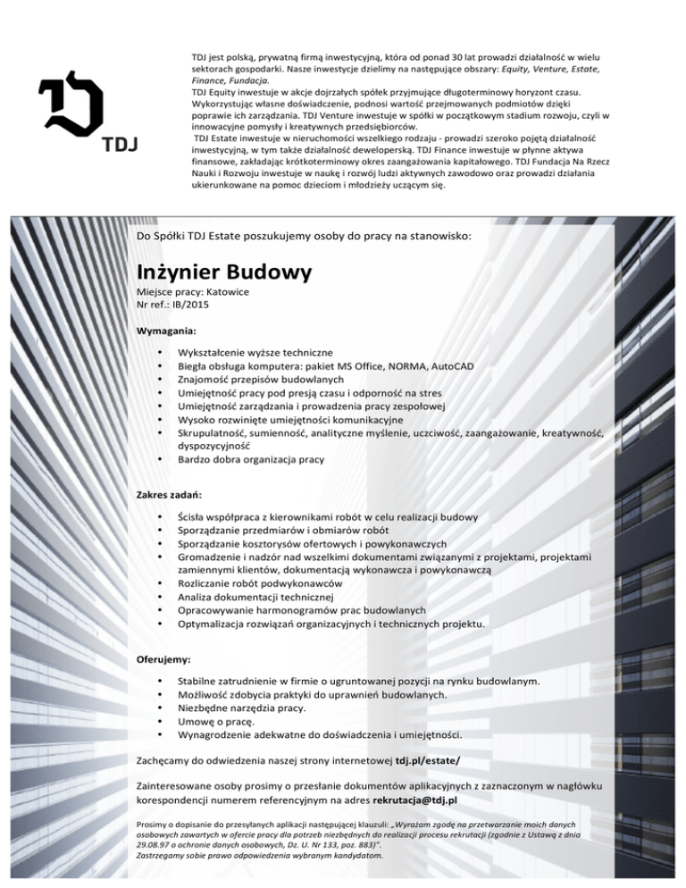 TDJjestpolską,prywatnąfirmąinwestycyjną,któraodponad30latprowadzidziałalnośćwwielu sektorachgospodarki.Naszeinwestycjedzielimynanastępująceobszary:Equity,Venture,Estate, Finance,Fundacja. TDJEquityinwestujewakcjedojrzałychspółekprzyjmującedługoterminowyhoryzontczasu. Wykorzystującwłasnedoświadczenie,podnosiwartośćprzejmowanychpodmiotówdzięki poprawieichzarządzania.TDJVentureinwestujewspółkiwpoczątkowymstadiumrozwoju,czyliw innowacyjnepomysłyikreatywnychprzedsiębiorców. TDJEstateinwestujewnieruchomościwszelkiegorodzaju-prowadziszerokopojętądziałalność inwestycyjną,wtymtakżedziałalnośćdeweloperską.TDJFinanceinwestujewpłynneaktywa finansowe,zakładająckrótkoterminowyokreszaangażowaniakapitałowego.TDJFundacjaNaRzecz NaukiiRozwojuinwestujewnaukęirozwójludziaktywnychzawodowoorazprowadzidziałania ukierunkowanenapomocdzieciomimłodzieżyuczącymsię. DoSpółkiTDJEstateposzukujemyosobydopracynastanowisko: InżynierBudowy Miejscepracy:Katowice Nrref.:IB/2015 Wymagania: • • • • • • • • Wykształceniewyższetechniczne Biegłaobsługakomputera:pakietMSOffice,NORMA,AutoCAD Znajomośćprzepisówbudowlanych Umiejętnośćpracypodpresjączasuiodpornośćnastres Umiejętnośćzarządzaniaiprowadzeniapracyzespołowej Wysokorozwinięteumiejętnościkomunikacyjne Skrupulatność,sumienność,analitycznemyślenie,uczciwość,zaangażowanie,kreatywność, dyspozycyjność Bardzodobraorganizacjapracy Zakreszadań: • • • • • • • • Ścisławspółpracazkierownikamirobótwcelurealizacjibudowy Sporządzanieprzedmiarówiobmiarówrobót Sporządzaniekosztorysówofertowychipowykonawczych Gromadzenieinadzórnadwszelkimidokumentamizwiązanymizprojektami,projektami zamiennymiklientów,dokumentacjąwykonawczaipowykonawczą Rozliczanierobótpodwykonawców Analizadokumentacjitechnicznej Opracowywanieharmonogramówpracbudowlanych Optymalizacjarozwiązańorganizacyjnychitechnicznychprojektu. Oferujemy: Stabilnezatrudnieniewfirmieougruntowanejpozycjinarynkubudowlanym. Możliwośćzdobyciapraktykidouprawnieńbudowlanych. Niezbędnenarzędziapracy. Umowęopracę. Wynagrodzenieadekwatnedodoświadczeniaiumiejętności. Zachęcamydoodwiedzenianaszejstronyinternetowejtdj.pl/estate/ • • • • • Zainteresowaneosobyprosimyoprzesłaniedokumentówaplikacyjnychzzaznaczonymwnagłówku [email protected] Prosimyodopisaniedoprzesyłanychaplikacjinastępującejklauzuli:„Wyrażamzgodęnaprzetwarzaniemoichdanych osobowychzawartychwoferciepracydlapotrzebniezbędnychdorealizacjiprocesurekrutacji(zgodniezUstawązdnia 29.08.97oochroniedanychosobowych,Dz.U.Nr133,poz.883)”. Zastrzegamysobieprawoodpowiedzeniawybranymkandydatom.