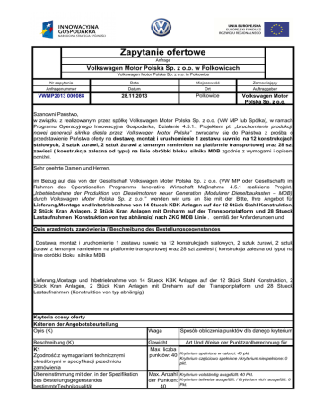 Zapytanie ofertowe Anfrage Volkswagen Motor Polska Sp. z o.o. w Polkowicach Volkswagen Motor Polska Sp. z o.o. in Polkowice Nr zapytania Data Miejscowość Zamawiający Anfragenummer Datum Ort Auftraggeber VWMP2013 000088 28.11.2013 Polkowice Volkswagen Motor Polska Sp. z o.o. Szanowni Państwo, w związku z realizowanym przez spółkę Volkswagen Motor Polska Sp. z o.o. (VW MP lub Spółka), w ramach Programu Operacyjnego Innowacyjna Gospodarka, Działanie 4.5.1., Projektem pt. „Uruchomienie produkcji nowej generacji silnika diesla przez Volkswagen Motor Polska” zwracamy się do Państwa z prośbą o przedstawienie Państwa oferty na dostawę, montaż i uruchomienie 1 zestawu suwnic na 12 konstrukcjach stalowych, 2 sztuk żurawi, 2 sztuk żurawi z łamanym ramieniem na platformie transportowej oraz 28 szt zawiesi ( konstrukcja zalezna od typu) na linie obróbki bloku silnika MDB zgodnie z wymogami i opisem poniżej. Sehr geehrte Damen und Herren, im Bezug auf das von der Gesellschaft Volkswagen Motor Polska Sp. z o.o. (VW MP oder Gesellschaft) im Rahmen des Operationellen Programms Innovative Wirtschaft Maβnahme 4.5.1 realisierte Projekt. „Inbetriebnahme der Produktion von Dieselmotoren neuer Generation (Modularer Dieselbaukasten – MDB) durch Volkswagen Motor Polska Sp. z o.o .” wenden wir uns an Sie mit der Bitte, Ihre Angebot für Lieferung,Montage und Inbetriebnahme von 14 Stueck KBK Anlagen auf der 12 Stück Stahl Konstruktion, 2 Stück Kran Anlagen, 2 Stück Kran Anlagen mit Dreharm auf der Transportplatform und 28 Stueck Lastaufnahmen (Konstruktion von typ abhängig) nach ZKG MDB Linie , gemäß der Anforderungen und Opis przedmiotu zamówienia / Beschreibung des Bestellungsgegenstandes Dostawa, montaż i uruchomienie 1 zestawu suwnic na 12 konstrukcjach stalowych, 2 sztuk żurawi, 2 sztuk żurawi z łamanym ramieniem na platformie transportowej oraz 28 szt zawiesi ( konstrukcja zalezna od typu) na linie obróbki bloku silnika MDB Lieferung,Montage und Inbetriebnahme von 14 Stueck KBK Anlagen auf der 12 Stück Stahl Konstruktion, 2 Stück Kran Anlagen, 2 Stück Kran Anlagen mit Dreharm auf der Transportplatform und 28 Stueck Lastaufnahmen (Konstruktion von typ abhängig) Kryteria oceny oferty Kriterien der Angebotsbeurteilung Opis (K) Beschreibung (K) K1 Zgodność z wymaganiami technicznymi określonymi w specyfikacji przedmiotu zamówienia Ȕbereinstimmung mit der, in der Spezifikation des Bestellungsgegenstandes bestimmteTechnikqualität Waga Sposób obliczenia punktów dla danego kryterium Gewicht Art Und Weise der Punktzahlberechnung für jedes Kriterium Max. liczba punktów: 40 Kryterium spełnione w całości: 40 pkt. Kryterium częściowo spełnione / kryterium niespełnione: 0 pkt. Max. Anzahl Kryterium vollständig ausgefüllt: 40 Pkt. der Punkten: Kryterium teilweise ausgefüllt: / Kryterium nicht ausgefüllt: 0 Pkt. 40 K2 Termin dostawy wskazany przez VWMP Max. liczba Zgodność z terminem dostawy wymaganym przez punktów: 30 Zamawiającego: 30 pkt. Częściowa lub całlkowita niezgodność z terminem dostawy wymaganym przez Zamawiającego: 0 pkt. Liefertermin, der vom Auftraggeber erfordert wird Max. Anzahl Übereinstimmung mit dem vom Auftraggeber erfordern der Punkten: Liefertermin: 30 Pkt. Teilweise Übereinstimmung und Unstimmigkeit mit dem vom 30 Auftraggeber erfordern Liefertermin: 0 Pkt. cena najniższa ---------------------------------------- x 30 = liczba punktów cena zadeklarowana przez Oferenta K3 Cena Max. liczba punktów: 30 Preis Max. Anzahl niedrigste Preis der Punkten: --------------------------------------------- x 30= Punktzahl 30 von dem Anbieter vorgeschalagener Preis Miejsce realizacji zamówienia / Ort der Bestellungsrealisierung Siedziba Volkswagen Motor Polska Sp z o. o.: ul. Strefowa 1, 59-101 Polkowice Termin zakończenia prac / Bertiebliche Übergabe TK 04 /2014 / KW 04/2014 Najważniejsze informacje dotyczące sposobu, terminu oraz miejsca składania ofert Die wichtigste Anmerkungen bezüglich der Art und Weise, Frist, sowie des Orts der Angebotsabgabe − Oferta powinna zostać złożona w formie pisemnej i zaadresowana na Volkswagen Motor Polska Sp. z o.o. z siedzibą w Polkowicach, ul. Strefowa 1, 59-101 Polkowice; _ Oferta powinna zostać złożona w terminie do dnia 05.12.2012 r.; − Każda oferta powinna wskazywać termin ważności. − Das Angebot soll im Schriftform eingerichtet werden und an Volkswagen Motor Polska Sp. z o.o. mit Sitz in Polkowice, ul. Strefowa 1, 59-101 Polkowice adressiert werden; _ Das Angebot soll bis zum 05.12.2012 r. abgegeben werden; − Jedes Angebot sollte auf ihre Geltungsdauer hinweisen. Inne istotne postanowienia / uwagi Andere relevante Bestimmungen / Anmerkungen − Zamawiający zastrzega sobie możliwość negocjowania Ofert. O terminie ew. negocjacji Oferenci zostaną poinformowani w odpowiednim czasie; − Der Auftraggeber behält sich das Recht vor, die Angeboten verhandeln zu können. Vom Termin der ev. Verhandlung werden die Anbieter in der ensprechenden Frist benachrichtigt; Osoba do kontaktu ze strony Zamawiającego Anprechpartner seitens des Auftraggebers Małgorzata Kruk, Specjalista ds. Handlu Zagranicznego i Zakupów Dawid Odrobina, Planowanie E-mail Telefon Adres [email protected] + 48 76 848 3264 Volkswagen Motor Polska Sp zoo ul. Strefowa 1, 59-101 Polkowice [email protected] + 48 76 8483945 Volkswagen Motor Polska Sp zoo ul. Strefowa 1, 59-101 Polkowice 1. Obowiązuje „Instrukcja organizacyjna nr 17 „Procedura zamówień w ramach projektu Uruchomienie produkcji nowej generacji silnika diesla (MDB – Modularer Dieselbaukasten) przez Volkswagen Motor Polska” („Instrukcja organizacyjna nr 17”), która stanowi integralną część niniejszego zapytania ofertowego. 2. Obowiązują Ogólne Warunki Zakupów VWMP. 3. Obowiązuje szczegółowa specyfikacja przedmiotu zamówienia (Lastenheft). Zusätzliche Bestimmungen: 1. Es gilt die Organisationsanweisung Nr 17 „Das 