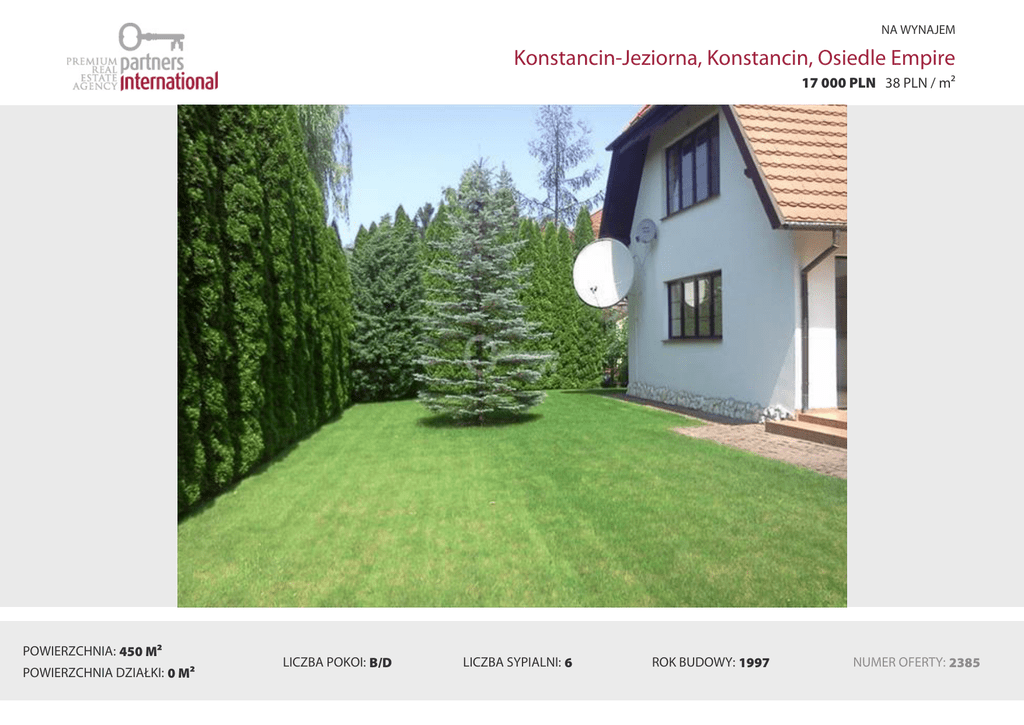 NA WYNAJEM Konstancin-Jeziorna, Konstancin, Osiedle Empire 17 000 PLN 38 PLN / m² POWIERZCHNIA: 450 M² POWIERZCHNIA DZIAŁKI: 0 M² LICZBA POKOI: B/D LICZBA SYPIALNI: 6 ROK BUDOWY: 1997 NUMER OFERTY: 2385 Opis Wygodny dom na strzeżonym osiedlu Empire. Rozkład pomieszczeń: Dom składa się z pięciu dużych sypialni, pokoju do pracy (gabinetu), salonu 50 m2, kuchni o pow. 27 m2 z zabudowanym sprzętem AGD (nowe szafki i część sprzętu), trzech łazienek, pralni (pralka + suszarka), garażu na dwa samochody i wielu pomieszczeń dodatkowych (m. in. spiżarni, garderoby, schowków itp.) o łącznej powierzchni 450 m2 oraz ogrodu o powierzchni ok. 1000 m2 (centralne nawodnienie ogrodu). Do domu doprowadzone są media miejskie, jedna linia telefoniczna stacjonarna, telewizja satelitarna, jest zainstalowany alarm. W domu na poziomie zerowym jest terakota i ogrzewanie podłogowe, natomiast na górze parkiet jesionowy elegancko ułożony oraz szafy przesuwane typu Stanley w trzech sypialniach i wydzielona garderoba przy największej sypialni. Na górę prowadzą schody z marmuru z artystycznie wykonanymi poręczami. Z salonu jest bezpośrednie wyjście na taras (drzwi suwane). Lokalizacja: Dom znajduje się w bezpiecznym osiedlu strzeżonym całodobowo. Mieszkańcami tego osiedla są głównie obcokrajowcy. Polecam. KONTAKT: Marta 502 157 999 POŚREDNIK ODPOWIEDZIALNY: Joanna Czapska (licencja zawodowa nr 4585), Przedstawiona wyżej propozycja nie jest ofertą handlową w rozumieniu przepisów prawa lecz ma charakter informacyjny. Wszelkie dane dotyczące nieruchomości uzyskano na podstawie oświadczeń Sprzedających. ——————————————————————————————————————————————————————————————————————————— Comfortable house in a good standard in the gated community Empire in a green Konstancin. It is located in a safe neighborhood guarded round the clock. The inhabitants of the estate are mostly foreigners. The house consists of five large bedrooms, office room, living room (50 sqm), kitchen (27 sqm) with built-in appliances , three bathrooms, laundry room (washer + dryer), garage for two cars and a number of additional rooms (among others: pantry, closets, lockers, etc.) with a total area of 450 sqm and garden area of approximately 1000 sqm (central watering system). Highly recommended property! Contact: Marta 502 157 999 Broker responsible professionals Joanna Czapska No license 4585 The above information is not a commercial offer for the purposes of the law but is informative. All data relating to real estate was obtained on the basis statements of the Landlords Lokalizacja Image not found https://maps.googleapis.com/maps/api/staticmap?center=<br /> <b>Warning</b>: Illegal string offset 'lat' in <b>/wp-content/themes/partnersinternational/partials/pdf/templates/default/single-listing.php</b> on line <b>426</b><br /> ,<br /> <b>Warning</b>: Illegal string offset 'lng' in <b>/wp-content/themes/partnersinternational/partials/pdf/templates/default/single-listing.php</b> on line <b>426</b><br /> &zoom=12&size=800x425&scale=2&style=feature:all|element:all|visibility:simplified|saturation:-100&markers=color:red%7C<br /> <b>Warning</b>: Illegal string offset 'lat' in <b>/wp-content/themes/partnersinternational/partials/pdf/templates/default/single-listing.php</b> on line <b>426</b><br /> ,<br /> <b>Warning</b>: Illegal string offset 'lng' in <b>/wp-content/themes/partnersinternational/partials/pdf/templates/default/single-listing.php</b> on line <b>426</b><br /> Katarzyna Joanna Czapska Katarzyna Joanna Czapska Ul. Koszykowa 10/19 00-564 Warszawa tel. (+48 22) 646 52 02 fax: (+48 22) 646 26 99 partnersinternational.pl Pośrednik odpowiedzialny: MARTA PECKO telefon: 502157999 email: [email protected]