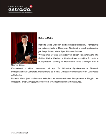 Roberto Metro Roberto Metro ukończył studia w klasie fortepianu i kompozycji na Uniwersytecie w Messynie. Studiował u takich profesorów, jak Sonja Pahor, Maria Tipo, Elliodoro Sollima. Występował w wielu prestiŜowych salach koncertowych: The Golden Hall w Wiedniu, w Akademii Muzycznej im. F. Liszta w Budapeszcie, Gaeteig w Monachium oraz Carnegie Hall w Nowym Jorku. Koncertował z takimi orkiestrami, jak np.: TV Orkiestra Symfoniczna w Słowenii, budapeszteńska Camerata, mediolańska La Scala, Orkiestra Symfoniczna San Luis Potosi w Meksyku. Roberto Metro jest profesorem fortepianu w Konserwatorium Muzycznym w Reggio, we Włoszech, oraz wizytującym profesorem w Konserwatorium w Singapurze. www.estrada.com.pl