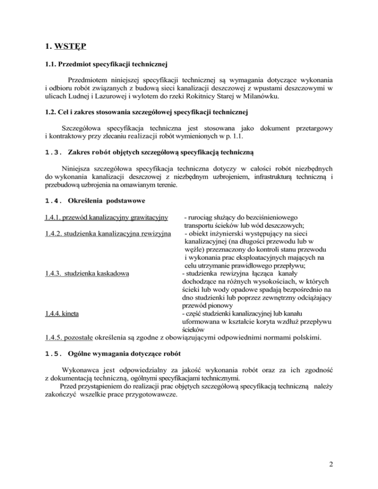 1. WSTĘP 1.1. Przedmiot specyfikacji technicznej Przedmiotem niniejszej specyfikacji technicznej są wymagania dotyczące wykonania i odbioru robót związanych z budową sieci kanalizacji deszczowej z wpustami deszczowymi w ulicach Ludnej i Lazurowej i wylotem do rzeki Rokitnicy Starej w Milanówku. 1.2. Cel i zakres stosowania szczegółowej specyfikacji technicznej Szczegółowa specyfikacja techniczna jest stosowana jako dokument przetargowy i kontraktowy przy zlecaniu realizacji robót wymienionych w p. 1.1. 1.3. Zakres robót objętych szczegółową specyfikacją techniczną Niniejsza szczegółowa specyfikacja techniczna dotyczy w całości robót niezbędnych do wykonania kanalizacji deszczowej z niezbędnym uzbrojeniem, infrastrukturą techniczną i przebudową uzbrojenia na omawianym terenie. 1.4. Określenia podstawowe 1.4.1. przewód kanalizacyjny grawitacyjny - rurociąg służący do bezciśnieniowego transportu ścieków lub wód deszczowych; 1.4.2. studzienka kanalizacyjna rewizyjna - obiekt inżynierski występujący na sieci kanalizacyjnej (na długości przewodu lub w węźle) przeznaczony do kontroli stanu przewodu i wykonania prac eksploatacyjnych mających na celu utrzymanie prawidłowego przepływu; 1.4.3. studzienka kaskadowa - studzienka rewizyjna łącząca kanały dochodzące na różnych wysokościach, w których ścieki lub wody opadowe spadają bezpośrednio na dno studzienki lub poprzez zewnętrzny odciążający przewód pionowy 1.4.4. kineta - część studzienki kanalizacyjnej lub kanału uformowana w kształcie koryta wzdłuż przepływu ścieków 1.4.5. pozostałe określenia są zgodne z obowiązującymi odpowiednimi normami polskimi. 1.5. Ogólne wymagania dotyczące robót Wykonawca jest odpowiedzialny za jakość wykonania robót oraz za ich zgodność z dokumentacją techniczną, ogólnymi specyfikacjami technicznymi. Przed przystąpieniem do realizacji prac objętych szczegółową specyfikacją techniczną należy zakończyć wszelkie prace przygotowawcze. 2 2. MATERIAŁY 2.1. Materiały do budowy kanałów i sieci Wszystkie zakupione przez Wykonawcę materiały, dla których normy PN i BN aprobaty techniczne przewidują posiadanie zaświadczenia o jakości lub atestu, powinny być zaopatrzone przez producenta w taki dokument. 2.2. Rury kanałowe Należy stosować rury litych PCV kl. „S” (SDR34) łączonych na uszczelki gumowe o średnicach: Dn630x18,4mm, Dn500x14,6mm, Dn400x11,7mm Dn300x9,2mm, Dn250x7,3mm. Przykanaliki do wpustów deszczowych wykonać z rur litych PCV kl. „S” (SDR34). Włączenie do kanału przykanalików sanitarnych przewiduje się bezpośrednio poprzez studnie lub trójniki. Istniejące przyłącza i sieci do przełożenia: Należy dokonać rozwiązania kolizji zgodnie z projektem i załączonymi warunkami technicznymi gestorów sieci. 2.3. Studnie rewizyjne Uzbrojenie projektowanych kanałów stanowią monolityczne studzienki o konstrukcji z betonu C35/45 o średnicy nominalnej Dn1200mm DN 1500 mmz fabrycznie zamontowanymi metalowymi stopniami złazowymi. Podstawa studzienek wyprofilowana w kształcie kinet z kierunkiem zgodnym z przebiegiem kanałów dopływowych i odpływowych. Włazy kanalizacyjne klasy D400 dn600mm (wg PN-EN 124:2000) z żeliwa z uszczelką zamykane na zatrzask. Posadowienie włazów na żelbetowym pierścieniu odciążającym wg załączonego rysunku. Włazy kl.D400 dn600mm. Stosowane studnie winny posiadać aprobatę techniczną ITB. Rysunek powtarzalny studni w cz. graficznej opracowania. Przewidziano na zwieńczeniu studni pierścień odciążający betonowy Ø1240/625mm oraz właz najazdowy typu ciężkiego klasy D400 w formie odlewu żeliwnego z wypełnieniem betonowym (wg PN-EN 124:2000) zamykane na zatrzask. Studnie 1200mm usytuowane centrycznie dla rur sieciowych. Wejścia do studni przez wmontowane w obudowę stopnie włazowe ze stali nierdzewnej. W skład studni wchodzą kręgi pośrednie, pokrywa betonowa, stopnie złazowe. Włazy najazdowe typu ciężkiego klasy D400 w formie odlewu żeliwnego z wypełnieniem betonowym (wg PN-EN 124:2000) zamykane na zatrzask. Kinety studni wykonane z betonu B-45 wyłożona wkładką polipropylenową Włączenia przyłączy wpustów deszczowych należy realizować za pośrednictwem studni rewizyjnych i rewizyjno–połączeniowych oraz trójników zróżnicowanych w zależności od średnic kanałów ulicznych. 3 2.4. Materiał na zasypkę przewodów Do zasypania przewodów w strefie bezpiecznej - minimum 0,3m nad przewodem, powinien być użyty piasek drobno lub średnioziarnisty wg PN-74/B-02480, bez grud i kamieni, nie powinien być zmrożony. Zagęszczenia tej partii zasypki należy dokonywać wyłącznie przy użyciu narzędzi ręcznych warstwami ubijanymi co 15-20cm, z zachowaniem szczególnej ostrożności w celu uniknięcia uszkodzenia rur. 2.5. Beton Beton użyty do wykonania elementów betonowych oraz żelbetowych powinien odpowiadać wymaganiom normy PN-62/6738-07. 2.6. Wpusty deszczowe Przykanaliki deszczowe zakończone są studzienkami osadnikowymi z kręgów betonowych Ø0,5m wg. KB4.3.3-10(1), wykonanie z kręgów betonowych wg KB1-22.2.66(6) (wg rysunku szczegółowego). Na studzienkach osadnikowych należy zamontować wpusty żeliwne uliczne wg PN-74/H-74081. Głębokość osadnika – 0,8 m. Włączenie do projektowanych kanałów przewodów podłączających wpusty deszczowe przewiduje się oś w oś przez studnie sieciowe i trójniki. Stosowane studnie winny posiadać aprobatę techniczną ITB. Rysunek powtarzalny studni w cz. graficznej opracowania. 2.7. Regulator przepływu Regulator przepływu zlokalizowany będzie przed zrzutem wód do rzeki o parametrach zgodnych z dokumentacją projektową. Regulator należy zamontować w studni betonowej Dn1200mm. Korpus montuje się z prefabrykowanych elementów betonowych – elementu dennego i kręgów pośrednich. Elementy wykonane są z betonu wibroprasowanego klasy C35/45, wodoszcze