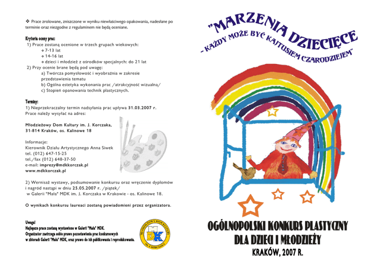 Prace zrolowane, zniszczone w wyniku niew³aœciwego opakowania, nades³ane po terminie oraz niezgodne z regulaminem nie bêd¹ oceniane. Kryteria oceny prac: 1) Prace zostan¹ ocenione w trzech grupach wiekowych: 7-13 lat 14-16 lat dzieci i m³odzie¿ z oœrodków specjalnych: do 21 lat 2) Przy ocenie brane bêd¹ pod uwagê: a) Twórcza pomys³owoœæ i wyobraŸnia w zakresie przedstawienia tematu b) Ogólna estetyka wykonania prac /atrakcyjnoœæ wizualna/ c) Stopieñ opanowania technik plastycznych. Terminy: 1) Nieprzekraczalny termin nadsy³ania prac up³ywa 31.03.2007 r. Prace nale¿y wysy³aæ na adres: M³odzie¿owy Dom Kultury im. J. Korczaka, 31-814 Kraków, os. Kalinowe 18 Informacje: Kierownik Dzia³u Artystycznego Anna Siwek tel. (012) 647-15-25 tel./fax (012) 648-37-50 e-mail: [email protected] www.mdkkorczak.pl 2) Wernisa¿ wystawy, podsumowanie konkursu oraz wrêczenie dyplomów i nagród nast¹pi w dniu 25.05.2007 r. /pi¹tek/ w Galerii "Ma³a" MDK im. J. Korczaka w Krakowie - os. Kalinowe 18. O wynikach konkursu laureaci zostan¹ powiadomieni przez organizatora. Uwaga! Najlepsze prace zostan¹ wystawione w Galerii "Ma³a" MDK. Organizator zastrzega sobie prawo pozostawienia prac konkursowych w zbiorach Galerii "Ma³a" MDK, oraz prawo do ich publikowania i reprodukowania. KRAKÓW, 2007 R. OGÓLNOPOLSKI KONKURS PLASTYCZNY DLA DZIECI I M£ODZIE¯Y "MARZENIA DZIECIÊCE - KA¯DY MO¯E BYÆ KAJTUSIEM CZARODZIEJEM" KRAKÓW, 2007 "Marzenie jest programem ¿ycia. Gdybyœmy je umieli odczytywaæ, wiedzielibyœmy, ¿e marzenia siê spe³niaj¹." J. Korczak /"Jak kochaæ dziecko"/. Drodzy Przyjaciele! Pragniemy przypomnieæ Wam s³owa zachêty Janusza Korczaka, który apelowa³ do dzieci by "górne mia³y marzenia" i wierzy³y, ¿e "coœ zawsze z nich siê stanie". Stary Doktor w wielu swoich ksi¹¿kach pisa³ o znaczeniu marzeñ, wypowiada³ siê na ten temat równie¿ w radio. Uwa¿a³, ¿e marzenia, dobre marzenia mog¹ byæ programem ¿ycia, a kiedy nauczymy siê je odczytywaæ oka¿e siê, ¿e siê spe³niaj¹. Tak te¿ sta³o siê w przypadku Olka i W³adka, bohaterów opowiadania "S³awa ". Zapraszamy Was do "przelania" na papier waszych marzeñ, zilustrowania tego, co podpowiada Wam wyobraŸnia. Marz¹c mo¿ecie "tworzyæ to, co nie istnieje, ale istnieæ mo¿e, ale pragniecie by istnia³o", mo¿ecie poczuæ siê czarodziejami. St¹d nazwa konkursu, do którego Was zapraszamy "Ka¿dy mo¿e byæ Kajtusiem Czarodziejem". Wierzymy, ¿e Wasza bogata wyobraŸnia plastyczna oraz nieograniczone mo¿liwoœci twórcze pozwol¹ na zaprezentowanie na wystawie barwnych marzeñ i postaci ze œwiata bajek Korczaka oraz ca³ego bogactwa treœci zawartych w twórczoœci tego niezwyk³ego pisarza. Czekamy na Wasze prace. Organizatorzy Regulamin konkursu Organizator: M³odzie¿owy Dom Kultury im. J. Korczaka w Krakowie Wspó³organizator: Stowarzyszenie im. J. Korczaka w Krakowie Cele konkursu: Konfrontacja dzieciêcej i m³odzie¿owej twórczoœci plastycznej Zainteresowanie dzieci i m³odzie¿y twórczoœci¹ literack¹ Janusza Korczaka Odwo³anie siê do nieprzemijaj¹cych wartoœci i idei tkwi¹cych w dzie³ach i systemie wychowawczym Janusza Korczaka Pobudzanie aktywnoœci twórczej m³odych plastyków Wymiana doœwiadczeñ i poszerzenie wiedzy z zakresu ró¿nych technik plastycznych Formy prezentacji oraz warunki uczestnictwa: Uczestnikami konkursu mog¹ byæ dzieci i m³odzie¿ w wieku 7-16 lat /dzieci i m³odzie¿ z oœrodków specjalnych: do 21 lat/ Uczestnicy wykonuj¹ prace w dowolnych technikach malarskich /bez rysunku, rzeŸby i form przestrzennych/: - malarstwo /tempera, kolorowe tusze, farby olejne, akwarele , pastele olejne i suche, kola¿/ - batik, malarstwo na tkaninie - malarstwo na szkle, witra¿ - grafika /linoryt, drzeworyt, monotypia/ - nowatorskie techniki plastyczne i techniki ³¹czone Format prac dowolny /minimalny A-3/. Ka¿da praca mo¿e zostaæ oprawiona w kartonowe passe-partout. Prace powinny byæ szczegó³owo i czytelnie opisane /pismem drukowanym/ zgodnie z za³¹czonym wzorem. Tabelkê nale¿y trwale przykleiæ na odwrocie pracy. W przypadku wysy³ki wiêkszej iloœci prac prosimy o do³¹czenie zbiorczej listy uczestników i ich prac /wzór w za³¹czeniu/. Maksymalna iloœæ prac z jednej placówki: 30, od uczestnika indywidualnego: 3. Prace uczestnik wykonuje samodzielnie - nie zbiorowo.