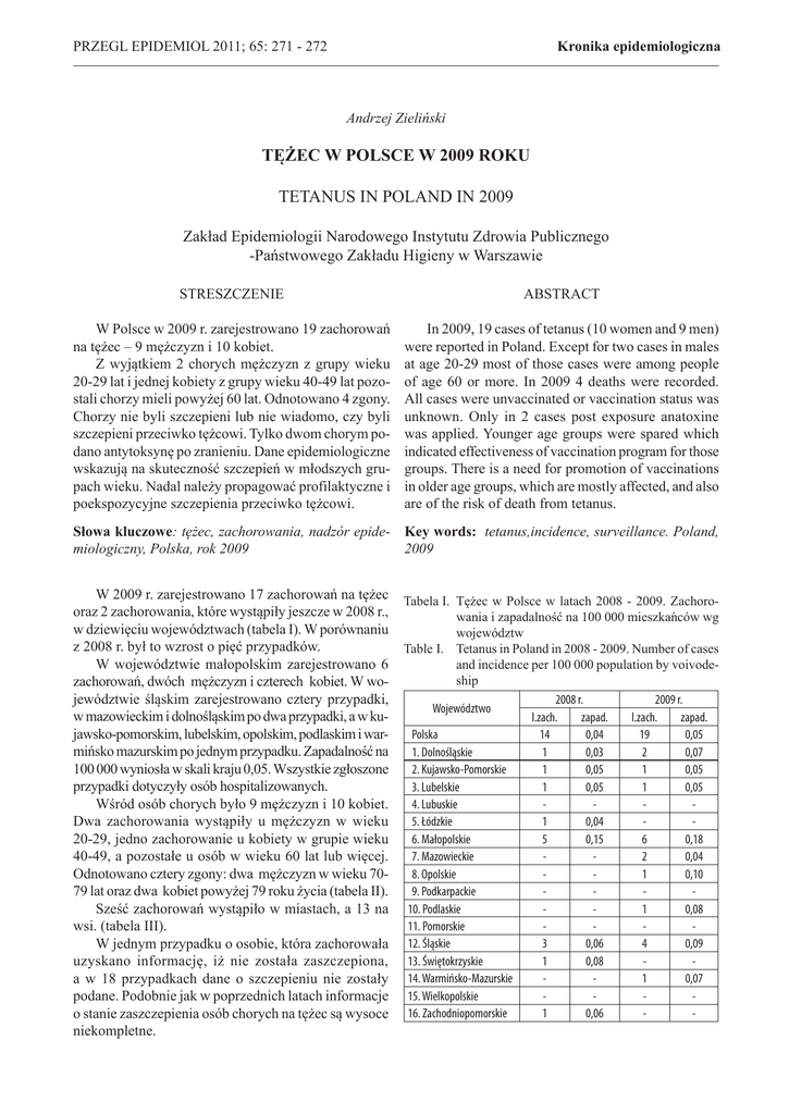 Kronika epidemiologiczna PRZEGL EPIDEMIOL 2011; 65: 271 - 272 Andrzej Zieliński TĘŻEC W POLSCE W 2009 ROKU TETANUS IN POLAND IN 2009 Zakład Epidemiologii Narodowego Instytutu Zdrowia Publicznego -Państwowego Zakładu Higieny w Warszawie STRESZCZENIE ABSTRACT W Polsce w 2009 r. zarejestrowano 19 zachorowań na tężec – 9 mężczyzn i 10 kobiet. Z wyjątkiem 2 chorych mężczyzn z grupy wieku 20-29 lat i jednej kobiety z grupy wieku 40-49 lat pozostali chorzy mieli powyżej 60 lat. Odnotowano 4 zgony. Chorzy nie byli szczepieni lub nie wiadomo, czy byli szczepieni przeciwko tężcowi. Tylko dwom chorym podano antytoksynę po zranieniu. Dane epidemiologiczne wskazują na skuteczność szczepień w młodszych grupach wieku. Nadal należy propagować profilaktyczne i poekspozycyjne szczepienia przeciwko tężcowi. In 2009, 19 cases of tetanus (10 women and 9 men) were reported in Poland. Except for two cases in males at age 20-29 most of those cases were among people of age 60 or more. In 2009 4 deaths were recorded. All cases were unvaccinated or vaccination status was unknown. Only in 2 cases post exposure anatoxine was applied. Younger age groups were spared which indicated effectiveness of vaccination program for those groups. There is a need for promotion of vaccinations in older age groups, which are mostly affected, and also are of the risk of death from tetanus. Słowa kluczowe: tężec, zachorowania, nadzór epide- Key words: tetanus,incidence, surveillance. Poland, miologiczny, Polska, rok 2009 2009 W 2009 r. zarejestrowano 17 zachorowań na tężec oraz 2 zachorowania, które wystąpiły jeszcze w 2008 r., w dziewięciu województwach (tabela I). W porównaniu z 2008 r. był to wzrost o pięć przypadków. W województwie małopolskim zarejestrowano 6 zachorowań, dwóch mężczyzn i czterech kobiet. W województwie śląskim zarejestrowano cztery przypadki, w mazowieckim i dolnośląskim po dwa przypadki, a w kujawsko-pomorskim, lubelskim, opolskim, podlaskim i warmińsko mazurskim po jednym przypadku. Zapadalność na 100 000 wyniosła w skali kraju 0,05. Wszystkie zgłoszone przypadki dotyczyły osób hospitalizowanych. Wśród osób chorych było 9 mężczyzn i 10 kobiet. Dwa zachorowania wystąpiły u mężczyzn w wieku 20-29, jedno zachorowanie u kobiety w grupie wieku 40-49, a pozostałe u osób w wieku 60 lat lub więcej. Odnotowano cztery zgony: dwa mężczyzn w wieku 7079 lat oraz dwa kobiet powyżej 79 roku życia (tabela II). Sześć zachorowań wystąpiło w miastach, a 13 na wsi. (tabela III). W jednym przypadku o osobie, która zachorowała uzyskano informację, iż nie została zaszczepiona, a w 18 przypadkach dane o szczepieniu nie zostały podane. Podobnie jak w poprzednich latach informacje o stanie zaszczepienia osób chorych na tężec są wysoce niekompletne. Tabela I. Tężec w Polsce w latach 2008 - 2009. Zachorowania i zapadalność na 100 000 mieszkańców wg województw Table I. Tetanus in Poland in 2008 - 2009. Number of cases and incidence per 100 000 population by voivodeship 2008 r. 2009 r. Województwo l.zach. zapad. l.zach. zapad. Polska 14 0,04 19 0,05 1. Dolnośląskie 1 0,03 2 0,07 2. Kujawsko-Pomorskie 1 0,05 1 0,05 3. Lubelskie 1 0,05 1 0,05 4. Lubuskie 5. Łódzkie 1 0,04 6. Małopolskie 5 0,15 6 0,18 7. Mazowieckie 2 0,04 8. Opolskie 1 0,10 9. Podkarpackie 10. Podlaskie 1 0,08 11. Pomorskie 12. Śląskie 3 0,06 4 0,09 13. Świętokrzyskie 1 0,08 14. Warmińsko-Mazurskie 1 0,07 15. Wielkopolskie 16. Zachodniopomorskie 1 0,06 - 272 Andrzej Zieliński Nr 2 Tabela II.Tężec w Polsce w roku 2009. Zachorowania i zapadalność na 100 000 mieszkańców oraz zgony wg płci i wieku Table II. Tetanus in Poland in 2009. Number of cases, incidence per 100 000 and deaths by age and sex Mężczyźni Kobiety Ogółem Grupy wieku l.zach. zapad. zgony % l.zach. zapad. zgony % l.zach. zapad. zgony % 0-19 20-29 2 0,063 2 0,032 30-39 40-49 1 0,041 1 0,020 50-59 60-69 2 0,131 1 0,053 3 0,09 70-79 3 0,308 2 66,7 4 0,258 7 0,28 2 28,6 80 i > 2 0,550 4 0,465 2 50,0 6 0,49 2 33,3 Ogółem 9 0,049 2 22,2 10 0,051 2 20,0 19 0,050 4 21,1 Tabela III. Tężec w Polsce w roku 2009. Zachorowania i zapadalność na 100 000 mieszkańców wśród mężczyzn i kobiet w mieście i na wsi oraz zgony wg województw Table III. Tetanus in Poland in 2009. Number of cases and incidence per 100 000 by sex in urban and rural population and deaths by voivodeship Mężczyźni Kobiety Miasto Wieś Województwo Zgony l.zach. zapad. l.zach. zapad. l.zach. zapad. l.zach. zapad. Polska 9 0,05 10 0,05 6 0,03 13 0,09 4 1. Dolnośląskie 1 0,07 1 0,07 1 0,05 1 0,12 2 2. Kujawsko-Pomorskie 1 0,09 1 0,08 3. Lubelskie 1 0,10 1 0,09 4. Lubuskie 5. Łódzkie 6. Małopolskie 2 0,13 4 0,24 1 0,06 5 0,30 7. Mazowieckie 1 0,04 1 0,04 2 0,11 8. Opolskie 1 0,19 1 0,20 1 9. Podkarpackie 10. Podlaskie 1 0,17 1 0,21 1 11. Pomorskie 12. Śląskie 3 0,13 1 0,04 2 0,06 2 0,20 13. Świętokrzyskie 14. Warmińsko-Mazurskie 1 0,14 1 0,12 15. Wielkopolskie 16. Zachodniopomorskie - Charakter ran osób zakażonych laseczkami tężca był różnorodny. W ośmiu przypadkach była to rana kłuta, w trzech otarcie lub skaleczenie, w trzech rana cięta, w dwóch rana szarpana i w dwóch poparzenie. W jednym przypadku zakażenie zostało spowodowane przez ugryzienie. W 17 przypadkach nie zastosowano żadnej profilaktyki, a w dwóch podano anatoksynę tężcową. Podany okres wylęgania tężca wynosił w ośmiu przypadkach do 7 dni, w sześciu 8-14 dni, a w jednym powyżej 21 dni. W czterech przypadkach okres wylęgania pozostał nieznany. Najwięcej zachorowań wystąpiło w sierpniu (cztery), w lipcu trzy, w kwietniu, maju, czerwcu, i wrześniu po dwa, a po jednym w lutym i w październiku. Dwa zachorowania z 2008 r. zgłoszono w 2009 r. Taki sezonowy rozkład zachorowań potwierdza związek zakażeń laseczkami tężca z okresem prac polowych i aktywności zawodowej lub rekreacyjnej na zewnątrz budynków. W ostat