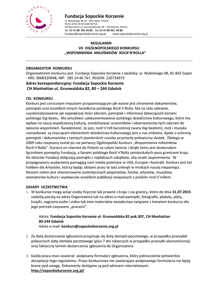 Fundacja Sopockie Korzenie ul. Wybickiego 48, 81 – 842 Sopot, Poland Biuro, adres do korespondencji: CH Manhattan ul. Grunwaldzka 82, 80 – 244 Gdańsk, Poland tel. 00 48 58 351 43 82 fax 00 48 58 351 43 82 [email protected] www.sopockiekorzenie.org.pl REGULAMIN VII OGÓLNOPOLSKIEGO KONKURSU „WSPOMNIENIA MIŁOŚNIKÓW ROCK’N’ROLLA” ORGANIZATOR KONKURSU Organizatorem konkursu jest Fundacja Sopockie Korzenie z siedzibą: ul. Wybickiego 48, 81-842 Sopot - KRS: 0000320948, NIP: 585 14 46 767, REGON: 220734973 Adres korespondencyjny: Fundacja Sopockie Korzenie CH Manhattan ul. Grunwaldzka 82, 80 – 244 Gdańsk CEL KONKURSU Konkurs jest corocznym impulsem przypominającym jak ważne jest chronienie dokumentów, pamiątek oraz wszelkich innych świadectw polskiego Rock’n’Rolla. Ma na celu zebranie, usystematyzowanie jak największej ilości zdarzeń, pamiątek i informacji dotyczących korzeni polskiego big-beatu. Ma umożliwić udokumentowanie polskiego dziedzictwa kulturowego, które ma wpływ na naszą współczesną kulturę, zmobilizować uczestników i obserwatorów tych zdarzeń do spisania wspomnień. Świadomość, że jazz, rock’n’roll (wcześniej zwany big-beatem), rock i muzyka rozrywkowa są znaczącym elementem dziedzictwa kulturowego jest u nas znikoma. Apele o ochronę pamiątek i dokumentów z tamtych pionierskich czasów przyniosły połowiczny skutek. Dlatego w 2009 roku rozpisany został po raz pierwszy Ogólnopolski Konkurs „Wspomnienia miłośników Rock’n’Rolla”. Dociera on również do Polonii na całym świecie i dzięki temu jest doskonałym łącznikiem pomiędzy Fundacją, a fanami polskiego Rock’n’Rolla zamieszkałych poza granicami kraju. Do zbiorów Fundacji dołączają pamiątki z najdalszych zakątków, aby ocalić wspomnienia. W propagowaniu wydarzenia pomagają nam media polonijne w USA, Europie i Australii. Konkurs jest też hołdem dla Artystów, którzy będąc idolami przez te lata zniknęli w mrokach naszej niepamięci. Naszym celem jest uhonorowanie autentycznych pasjonatów, fanów, artystów, muzyków, animatorów kultury i wydawców wszelkich publikacji związanych z polskim rock’n’rollem. ZASADY UCZESTNICTWA 1. W konkursie mogą wziąć osoby fizyczne lub prawne z kraju i zza granicy, które do dnia 31.07.2015 nadeślą pocztą na adres Organizatora lub na adres e-mail pamiątki, fotografie, plakaty, płyty, książki, nagrania audio i video lub inne materialne świadectwa związane z tematem konkursu dla jego potrzeb nazywane „pracami”. Adres: Fundacja Sopockie Korzenie al. Grunwaldzka 82 pok.307, CH Manhattan 80-244 Gdańsk Adres e-mail: [email protected] 2. Za datę dostarczenia zgłoszenia przyjmuje się datę stempla pocztowego, w przypadku przesyłek poleconych datę stempla pocztowego (plus 7 dni roboczych w przypadku przesyłki ekonomicznej) oraz faktyczny termin dostarczenia zgłoszenia do Organizatora. 3. Każda praca musi zawierać podpisany formularz zgłoszenia, który jednocześnie potwierdza akceptacje tego regulaminu. Prace konkursowe nie zawierające podpisanego formularza nie będą brane pod uwagę. Dokumenty dostępne są pod adresem internetowym: http://sopockiekorzenie.org.pl/ Fundacja Sopockie Korzenie ul. Wybickiego 48, 81 – 842 Sopot, Poland Biuro, adres do korespondencji: CH Manhattan ul. Grunwaldzka 82, 80 – 244 Gdańsk, Poland tel. 00 48 58 351 43 82 fax 00 48 58 351 43 82 [email protected] www.sopockiekorzenie.org.pl 4. Wymogiem zgłoszenia pracy jest akceptacja poniższych oświadczeń: Oświadczam, że wyrażam zgodę na przetwarzanie moich danych osobowych zawartych w zgłoszeniu do konkursu, zgodnie z ustawą z dnia 29 sierpnia 1997 roku o ochronie danych osobowych (Dzienni Ustaw nr 101/2002, poz. 926, wraz z późniejszymi zmianami). Wyrażam zgodę na nieodpłatne wykorzystywanie nadesłanej przeze mnie pracy przez Fundację Sopockie Korzenie w dowolnym czasie i formie, w tym do druku w dowolnej liczbie egzemplarzy, do zamieszczenia ich w Internecie i innych publikacjach wydawanych przez Fundację. 5. Prace oceniane będą w trzech kategoriach: Wspomnienia uczestników lub świadków zdarzeń oraz niepublikowane opracowania o charakterze historycznym lub socjologicznym – wspomnienia w formie pisemnej lub nagrania audio i wideo. Dokumenty, pamiątki lub kolekcje uczestników / fanów, a także inne prace dotyczące szeroko rozumianej historii muzyki rozrywkowej - zdjęcia, plakaty, wydawnictwa, nagrania, nośniki i sprzęt muzyczny, elementy scenografii, prace plastyczne itp. Publikacja roku, czyli historyczne premiery lub reedycje związane z polską muzyką rozrywkową zgłaszane przez wydawnictw lub autorów - książki, płyty analogowe lub cyfrowe (CD), DVD oraz audycje, reportaże, felietony audio lub wideo. 6. Autorzy prac zobowiązani są wskazać w formularzu zgłoszeniowym jedną z w/w kategorii, w których ich praca powinna być oceniana. 7. W uzasadnionych przypadkach jury zastrzega sobie prawo zmiany zgłoszonej kategorii. 8. Jury oceniając prace będzie zwracać przede wszystkim uwagę na ich unikalny charakter, oryginalność, jakość formalną i merytoryczną oraz wartość historyczną. 9. Udział w konkursie jest bezpłatny. Organizator nie zwraca kosztów przesyłki prac ani ewentualnego udziału uczestników w ceremonii ogłoszenia wyników konkursu. 10. Organizator zastrzega sobie prawo do odmowy przyjęcia pracy na konkurs bez podania powodu. JURY Nadesłane prace oceniać będzie Jury powołane przez Zarząd Fundacji Sopockie Korzenie NAGRODY W każdej z kategorii przyznane zostaną nagrody pieniężne ufundowane przez sponsorów i patronów medialnych. Zarząd Fundacji Sopockie Korzenie wybierze jedną z nadesłanych prac i wykorzysta ją do promocji VII konkursu „Wspomnień miłośników rock’n’rolla” w 2016 roku. ROZSTRZYGNIĘCIE KONKURSU Ogłoszenie wyników Konkursu oraz wręczenie nagród odbędzie się w II połowie września 2015 