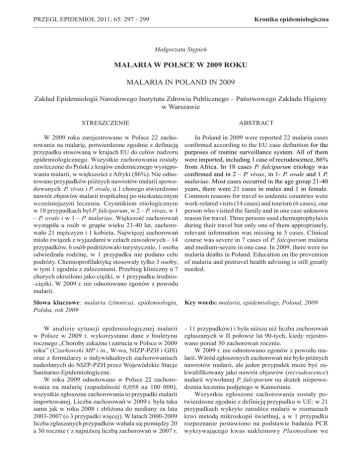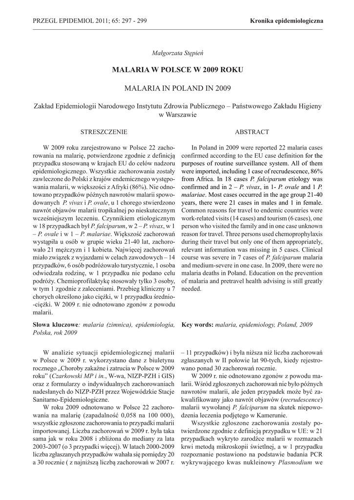 Kronika epidemiologiczna PRZEGL EPIDEMIOL 2011; 65: 297 - 299 Małgorzata Stępień MALARIA W POLSCE W 2009 ROKU MALARIA IN POLAND IN 2009 Zakład Epidemiologii Narodowego Instytutu Zdrowia Publicznego – Państwowego Zakładu Higieny w Warszawie STRESZCZENIE ABSTRACT W 2009 roku zarejestrowano w Polsce 22 zachorowania na malarię, potwierdzone zgodnie z definicją przypadku stosowaną w krajach EU do celów nadzoru epidemiologicznego. Wszystkie zachorowania zostały zawleczone do Polski z krajów endemicznego występowania malarii, w większości z Afryki (86%). Nie odnotowano przypadków późnych nawrotów malarii spowodowanych P. vivax i P. ovale, u 1 chorego stwierdzono nawrót objawów malarii tropikalnej po nieskutecznym wcześniejszym leczeniu. Czynnikiem etiologicznym w 18 przypadkach był P. falciparum, w 2 – P. vivax, w 1 – P. ovale i w 1 – P. malariae. Większość zachorowań wystąpiła u osób w grupie wieku 21-40 lat, zachorowało 21 mężczyzn i 1 kobieta. Najwięcej zachorowań miało związek z wyjazdami w celach zawodowych – 14 przypadków, 6 osób podróżowało turystycznie, 1 osoba odwiedzała rodzinę, w 1 przypadku nie podano celu podróży. Chemioprofilaktykę stosowały tylko 3 osoby, w tym 1 zgodnie z zaleceniami. Przebieg kliniczny u 7 chorych określono jako ciężki, w 1 przypadku średnio-ciężki. W 2009 r. nie odnotowano zgonów z powodu malarii. In Poland in 2009 were reported 22 malaria cases confirmed according to the EU case definition for the purposes of routine surveillance system. All of them were imported, including 1 case of recrudescence, 86% from Africa. In 18 cases P. falciparum etiology was confirmed and in 2 – P. vivax, in 1- P. ovale and 1 P. malariae. Most cases occurred in the age group 21-40 years, there were 21 cases in males and 1 in female. Common reasons for travel to endemic countries were work-related visits (14 cases) and tourism (6 cases), one person who visited the family and in one case unknown reason for travel. Three persons used chemoprophylaxis during their travel but only one of them appropriately, relevant information was missing in 5 cases. Clinical course was severe in 7 cases of P. falciparum malaria and medium-severe in one case. In 2009, there were no malaria deaths in Poland. Education on the prevention of malaria and pretravel health advising is still greatly needed. Słowa kluczowe: malaria (zimnica), epidemiologia, Key words: malaria, epidemiology, Poland, 2009 Polska, rok 2009 W analizie sytuacji epidemiologicznej malarii w Polsce w 2009 r. wykorzystano dane z biuletynu rocznego „Choroby zakaźne i zatrucia w Polsce w 2009 roku” (Czarkowski MP i in., W-wa, NIZP-PZH i GIS) oraz z formularzy o indywidualnych zachorowaniach nadesłanych do NIZP-PZH przez Wojewódzkie Stacje Sanitarno-Epidemiologiczne. W roku 2009 odnotowano w Polsce 22 zachorowania na malarię (zapadalność 0,058 na 100 000), wszystkie zgłoszone zachorowania to przypadki malarii importowanej. Liczba zachorowań w 2009 r. była taka sama jak w roku 2008 i zbliżona do mediany za lata 2003-2007 (o 3 przypadki więcej). W latach 2000-2009 liczba zgłaszanych przypadków wahała się pomiędzy 20 a 30 rocznie ( z najniższą liczbą zachorowań w 2007 r. – 11 przypadków) i była niższa niż liczba zachorowań zgłaszanych w II połowie lat 90-tych, kiedy rejestrowano ponad 30 zachorowań rocznie. W 2009 r. nie odnotowano zgonów z powodu malarii. Wśród zgłoszonych zachorowań nie było późnych nawrotów malarii, ale jeden przypadek może być zakwalifikowany jako nawrót objawów (recrudescence) malarii wywołanej P. falciparum na skutek niepowodzenia leczenia podjętego w Kamerunie. Wszystkie zgłoszone zachorowania zostały potwierdzone zgodnie z definicją przypadku w UE: w 21 przypadkach wykryto zarodźce malarii w rozmazach krwi metodą mikroskopii świetlnej, a w 1 przypadku rozpoznanie postawiono na podstawie badania PCR wykrywającego kwas nukleinowy Plasmodium we 298 Małgorzata Stępień Nr 2 Tabela I. Importowane zachorowania na malarię w Polsce w 2009 r. wg kraju narażenia i gatunku Plasmodium Table I. Number of imported malaria cases in Poland in 2009 by country of exposure and species of Plasmodium Kontynent i kraj zarażenia Gatunek Plasmodium Liczba przypadków P.vivax P. falciparum P.ovale P. malariae Afryka RAZEM 19 1 17 1 Ghana 3 3 Gwinea 1 1 Kamerun 2 1 1 Kenia 1 1 Mali 1 1 Nigeria 5 4 1 Sudan 2 2 Tanzania 1 1 Uganda 2 2 Nieustalone 1 1 Ameryka Płd RAZEM 1 1 Brazylia, Wenezuela (rejs) 1 1 Australia i Oceania RAZEM 2 1 1 Papua Nowa Gwinea 2 1 1 OGÓŁEM 22 2 18 1 1 krwi. Ogółem badanie PCR wykonano u 4 chorych; u jednego badanie było podstawą rozpoznania, u 3 badanie molekularne stanowiło uzupełnienie badania mikroskopowego. Czynnikiem etiologicznym większości zachorowań (18 przypadków; 81,8%) był P. falciparum, w 2 przypadkach rozpoznano P. vivax, oraz po jednym przypadku P. ovale i P. malariae. Gatunek zarodźca ustalono we wszystkich przypadkach (w 2 przypadkach badaniem rozstrzygającym było badanie PCR), nie odnotowano inwazji mieszanych. Przebieg kliniczny u 7 chorych określono jako ciężki (31,8%!), u jednego jako średnio-ciężki; w tej grupie w 4 przypadkach stwierdzono wykładniki ciężkiej malarii (severe malaria)zgodne z kryteriami WHO: niewydolność nerek, zaburzenia krzepliwości, samoistne krwawienia, niedokrwistość, zaburzenia świadomości, hyperparazytemię. Zwraca uwagę wysoki odsetek zachorowań o ciężkim przebiegu ( wg różnych źródeł udział malarii o ciężkim przebiegu wśród wszystkich przypadków malarii falciparum wynosi 1-5%, śmiertelność w tej grupie zwykle przekracza 20%). Wszystkie zachorowania o ciężkim przebiegu klinicznym były spowodowane przez P. falciparum. W 2009 r. zachorowało 21 mężczyzn (95,5%) i tylko 1 kobieta, wiek chorych wahał się od 16 do 60 lat, większość była w przedziale wieku 21-40 lat (68%). W tabeli I zestawiono