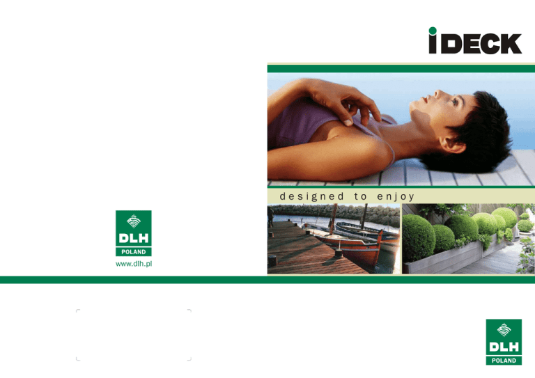 designed www.dlh.pl to enjoy Stworzone by cieszyæ Produkty iDECK s¹ presti¿o wym mater ia³em dla projektantów i wykona wców stosowa nym w architektur ze ogrodo wej, parko wej i elewacjach zewnêtrznych. Niezale¿nie od tego czy budujemy basen na o twar tym powietr zu, taras na dachu, resta uracjê, czy urz¹dza my ogólnie dostêpny teren rekreacyjny, wszêdzie tam produkty iDECK spisuj¹ siê doskonale. W naszej ofer cie znajdziecie Pañstwo elementy do budowy ta rasów, altan, patia, œcie¿ek, o grodzeñ i elewacji. Nasze drewno doskonale spisuje siê w pobli¿u wody, s³u¿¹c jako obrze¿a basenów i oczek wodnych. Wychodz¹c napr zeciw Pañstwa wysokim oczekiwaniom dostarczamy ma teria³ najwy¿szej jakoœci, o parametr ach technicznych, pozwalaj¹cych budo waæ niezawo dne tarasy kusz¹ce ciep³em, wyj¹tko wym czarem i obietnic¹ przyjemnie spêdzo nego czasu. Przy ur z¹dzaniu ogrodów za chêcamy Pañstwa do realizo wania swoich mar zeñ. Produkty iDECK bêd¹ Pañstwu na pewno przy tym niezwykle pomo cne. iDECK stwarza na turaln¹ a tmosferê do relaksu. Dotknij ciep³a iDECK i przekonaj siê jak ³a two o nie zadbaæ, idealne dla Ciebie i Twojej rodziny. Stworzone do ¿ycia, stworzone dla bezpieczeñstwa Dla zapewnienia bezpieczeñstwa u¿ytkowników, antypoœlizgo we paski SafeGr ip mog¹ byæ z ³a twoœci¹ fabrycznie za instalowa ne w deskach iDECK. Za luksusem i piêknym wygl¹dem iDECK kryje siê wysoki standard jakoœci. Pro dukt ten wyrobi³ sobie zas³u¿on¹ reputacjê jako jeden z najbardziej nieza wodnych mater ia³ów taraso wych dostêpnych na rynku. Precyzyjnie kontrolo wany proces pro dukcji SafeGr ip powo duje, ¿e mieszanka piasku kwarco wego i poliuretanu zapewnia nieza wodn¹ przyczepnoœæ. Wiedz¹c, i¿ prawdziw¹ mia r¹ jakoœci tego rodzaju produktów jest ich odpor noœæ na dzia³anie czasu. Naszym podsta wowym kr yterium przy wybor ze drewna na produkty iDECK jest jego zwiêkszona odpo rnoœæ na czynniki zewnêtrzne i procesy gnilne spo wodo wane przez gr zyby i szkodniki. SafeGr ip jest idealnym mater ia³em znajduj¹cym szerokie zastoso wanie w miejscach u¿ytecznoœci publicznej, takich jak: mosty, deptaki, place zabaw dla dzieci, schody, s³owem wszêdzie tam gdzie wyma gana jest doda tkowa pr zyczepnoœæ. Testowany w trudnych warunkach, Sa feGrip udo wodni³ swoj¹ tr wa³oœæ i podwy¿szone para metry bezpieczeñstwa za równo na przestr zeni czasu jak i w obliczu zmiennych warunków pogodo wych. Do produkcji iDECK'u wykor zystuje siê gatunki o wysokiej gêstoœci w³ókien co oznacza ¿e jest to drewno o wysokim stopniu twardoœci i posiada wyj¹tko wo wysok¹ odpornoœæ na uder zenia i œcieranie. Z natur y wytrzyma³e produkty iDECK chwalo ne s¹ za doskona³¹ odpornoœæ na zu¿ycie, dziêki czemu s¹ czêsto stosowa ne na powier zchniach u¿ytko wych takich jak: przystanie, po mosty ora z deptaki. Odporne na ka¿de war unki atmosfer yczne, o ka¿dej porze roku. Standardo wo ka¿dy przekrój za wiera dwa paski Sa feGrip, chocia¿ na ¿yczenie klienta mo¿na zainstalo waæ ich wiêcej. Dostêpne w postaci deski r yflowa nej o rozmia rach: 25x145mm lub 45x145mm (idealny mater ia³ na schody). Invisible iCLIP ® Nasz nowy i ulepszo ny iCLIP zosta³ zaprojekto wany z myœl¹ o mo¿liwoœci wyekspono wania na turalnego piêkna iDECK, unikaj¹c widocznych moco wañ. œlepe wkrêty Deski iDECK w systemie iCLIP zosta³y zaprojekto wane tak, aby dziêki precyzyjnie ciêtym k¹tom, moco wania iCLIP by³y niedostrzegalne, daj¹c niemal¿e jednolit¹ powier zchniê tarasu z minimalnymi odstêpa mi miêdzy deskami. Nasze pierwszo rzêdne ma teria³y iDECK to produkty o najwy¿szej jakoœci. W systemie iCLIP zastosowaliœmy gatunek dr ewna Lapacho / Ipe, wysoko ceniony za swój wygl¹d i trwa³oœæ. ¿adnych widocznych czêœci mocuj¹cych Pude³ko zawier a 150 moco wañ iClip oraz wkrêty nier dzewne (A2). dostêpne w formie g³adkiej ora z ryflowanej Kszta³t iCLIP'ów pozwala skutecznie moco waæ poszczególne deski za pomoc¹ jednej specjalnej nierdzewnej œruby. Monta¿ ten jest wyj¹tko wo prosty. iDECK stworzo ny dla Twojej wygody, iCLIP - có¿ mog³oby byæ prostsze. Ofero wane ga tunki drewna BANGKIRAI LAPACHO / IPE MASSARANDUBA TATAJUBA CUMARU MODRZEW Wystêpowanie: Indonezja i Malezja Wystêpowanie: Ameryka Po³udnio wa Wystêpowanie: Ameryka Po³udnio wa Wystêpowanie: Ameryka Po³udnio wa Wystêpowanie: Ameryka Po³udnio wa Wystêpowanie: Syberia Rodzina: Dipterocarpacaea ceae Rodzina: Bignoniaceae Rodzina: Sapotacea e Rodzina: Moraceae Rodzina: Fabaceae Rodzina: Laricoideae Nazwa botaniczna: Shorea Argentea Nazwa botaniczna: Tabebuja spp. Nazwa botaniczna: Manilkara spp. Nazwa botaniczna: Bogassa guianensis Aubl. Nazwa botaniczna: Dipteryx spp. Nazwa botaniczna: Larix sibirica Ciê¿ar drewna œwie¿ego: 1200-1300 kg/m3 Ciê¿ar drewna œwie¿ego: 1300 kg/m3 Ciê¿ar drewna œwie¿ego: 1300 kg/m3 Ciê¿ar drewna œwie¿ego: 1100 kg/m3 Ciê¿ar drewna œwie¿ego: 1200 kg/m3 Ciê¿ar drewna œwie¿ego: 580 kg/m3 Opis: Bardzo wysoki stopieñ kurczenia siê pr zy wysuszaniu, œredni stopieñ zniekszta³cenia. Drobne wady ro zwojowe, na koñca ch trochê ¿ywicy. Ma³e dziurki po szkodnikach (œrednica 1-1,5mm) s¹ typowym skutkiem ingerencji szkodników, które wystêpuj¹ wy³¹cznie w drzewach stoj¹cych. Za wiera pewne substancje na turalne (w tym kwas tanino wy), które mog¹ byæ wyp³ukiwane przez deszcz w postaci br¹zo wej cieczy. Kontakt z ¿elazem mo¿e po wodowaæ powsta wanie niebiesko-czarnych plam, poniewa¿ substancje w drewnie utleniaj¹ ¿elazo. Opis: Ciê¿kie, twarde, elastyczne drewno z drobnymi porami, praktycznie bez ska z i pêkniêæ, niewielka tendencja do rozszczepiania siê, nie ulega zniekszta³ceniu. Drewno zawier a Lapachol - ¿ó³t¹ ciecz chroni¹c¹ drewno, która mo¿e po wodowaæ po dra¿nienie skór y. Opis: Bardzo ciê¿kie drewno, twar de, z drobnymi porami. Cha rakter yzuje je wysoki stopi