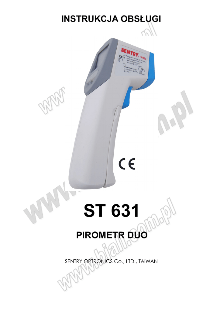 INSTRUKCJA OBSŁUGI ST 631 PIROMETR DUO SENTRY OPTRONICS Co., LTD., TAIWAN -2- Spis treści Strona 1. BEZPIECZEŃSTWO POMIARÓW ................................................................................... 4 2. SPECYFIKACJA ................................................................................................................5 2.1. Cechy konstrukcyjne i użytkowe.................................................................................5 2.2. Dane techniczne.........................................................................................................5 3. OBSŁUGA PIROMETRU ...................................................................................................6 4. CZYSZCZENIE ..................................................................................................................6 5. ZGODNOŚĆ Z DYREKTYWĄ 2002/95/EC .......................................................................7 6. UTYLIZACJA.......................................................................................................................... 7 -3- 1. BEZPIECZEŃSTWO POMIARÓW Przed przystąpieniem do przeprowadzenia pomiarów należy uważnie przeczytać instrukcję obsługi. Wszelkie naprawy oraz prace serwisowe mogą być wykonywane wyłącznie przez osoby odpowiednio przeszkolone. UWAGA Urządzenie nie jest wodoodporne. Nie wolno go wkładać do wody ani używać w zawilgoconym otoczeniu. Urządzenie nie jest przeznaczone do zastosowań medycznych. Może służyć do pomiarów temperatury ciała jedynie w zastosowaniach nieprofesjonalnych. Urządzenie może być używane jedynie do wstępnego badania temperatury ciała – aby dokładnie określić temperaturę ciała należy zastosować do pomiarów termometr medyczny. Temperatura ciała ludzkiego może zmieniać się indywidualnie w zależności od metabolizmu, pory dnia, aktywności i innych czynników. Dokładność miernika jest specyfikowana dla stałej temp. 25±2°C. Gdy następują znaczne zmiany temperatury: np. przy przenoszeniu miernika z zimnego pomieszczenia do ciepłego – należy odczekać 30min. Aby poznać temperaturę ciała należy używać trybu pomiarowego przeznaczonego do ciała. Zaleca się pomiar z odległości 2-5cm od czoła człowieka. Czoło powinno być suche i czyste, aby zachować dokładność pomiaru. Według wyników badań, wskazanie temperatury czoła jest jednoznaczne z temperatura w ustach. Podczas prowadzenia pomiarów należy zwracać uwagę na wybrany tryb pomiarowy. -4- Znaczenie symboli RoHS Niebezpieczeństwo! Przed przystąpieniem do wykonania pomiaru należy przeczytać instrukcję obsługi. Urządzenie posiada certyfikat CE Urządzenie jest zgodne z wytycznymi Dyrektywy RoHS 2. SPECYFIKACJA 2.1. Cechy konstrukcyjne i użytkowe Autowyłączanie miernika po 20 sekundach bezczynności Przełączana jednostka wskazania °C lub °F Podświetlenie wyświetlacza Pomiar z automatycznym zatrzymaniem wyniku pomiaru na LCD 2.2. Dane techniczne Zakres pomiarowy: Temp.użytkowania Dokładność: Dystans pomiaru / Rozdzielczość optyczna (D:S)*: Czas odpowiedzi: Czułość widmowa: Powtarzalność Rozdzielczość Środowisko przechowywania: Podświetlenie LCD Odczyt °C/°F Zasilanie: Żywotność baterii: Wymiary: Masa: Wyposażenie: Tryb pomiaru temperatury ciała 35°C÷42°C (95°F ÷107.6°F) 25±2°C(77°F ±4°F) ±0,5°C (±1°F) 2~5cm Tryb pomiarów temperatury przedmiotów 0°C÷100°C (32°F ÷212°F) 10.0~40.0°C(50°F ±104°F) ±1.0°C 8:1 1 sek 0,5 sek 5÷14 µm ±1°C (±2°F) 0.1°C -10°C÷60°C (14°F÷140°F) TAK TAK Bateria 9V (006P, IEC6F22, NEDA1604) 16 godzin 156x100x32 mm 135 g bateria, instrukcja obsługi * Rozdzielczość optyczna jest wyrażana stosunkiem odległości D do średnicy pola pomiaru S. Np. dla rozdzielczości 8:1 przy odległości 1 m średnica pola pomiaru wynosi 12,5 cm. -5- 3. OBSŁUGA PIROMETRU W celu dokonania pomiaru temperatury należy skierować pirometr na powierzchnię, której temperatura ma być pomierzona i wcisnąć przycisk pomiarowy. Podczas pomiaru należy zwrócić uwagę, aby mierzony obiekt znajdował się w obszarze stożka pomiarowego. Jeżeli na wyświetlaczu LCD pojawi się symbol sygnalizujący wyczerpanie baterii należy niezwłocznie wymienić baterie na nowe. Gdy dokonujemy pomiaru temperatury ciała należy wybrać tryb: Do pozostały zastosowań należy wybrać tryb: 4. CZYSZCZENIE Czyszczenie soczewki pomiarowej: Drobinki zanieczyszczeń usuwać z soczewki używając sprężonego powietrza. Zapyloną lub zakurzoną soczewkę można delikatnie przetrzeć miękkim pędzelkiem wykonanym z naturalnego włosia. Po usunięciu zanieczyszczeń stałych powierzchnię soczewki można delikatnie przetrzeć wilgotną bawełnianą szmatką. UWAGA Do czyszczenia soczewki pomiarowej nie wolno używać materiałów ściernych ani rozpuszczalników. Czyszczenie obudowy Należy okresowo przetrzeć obudowę wilgotną szmatką z niewielką ilością delikatnego detergentu -6- 5. ZGODNOŚĆ Z DYREKTYWĄ 2002/95/EC Technologia produkcji oraz materiały i podzespoły zastosowane w ST631 są zgodne z wymogami RoHS (Dyrektywa 2002/95/EC). 6. UTYLIZACJA Pirometr podlega dyrektywie WEEE 2002/96/EC. Symbol jak obok (umieszczony na obudowie przyrządu) oznacza, że produkt musi być utylizowany oddzielnie i powinien być dostarczany do odpowiedniego punktu zbierającego odpady. Nie należy go wyrzucać razem z odpadami gospodarstwa domowego. Aby uzyskać więcej informacji, należy skontaktować się z punktem sprzedaży detalicznej tego wyrobu, lokalnymi władzami odpowiedzialnymi za zarządzanie odpadami lub przedstawicielem przedsiębiorstwa. -7- WER. 2010-10-29 AW ST631 nr ind.: 114815 PIROMETR DUO Wyprodukowano na Tajwanie Importer: BIALL Sp. zo.o. Otomin, ul. Słoneczna 43 80-174 Gdańsk www.biall.com.pl -8-