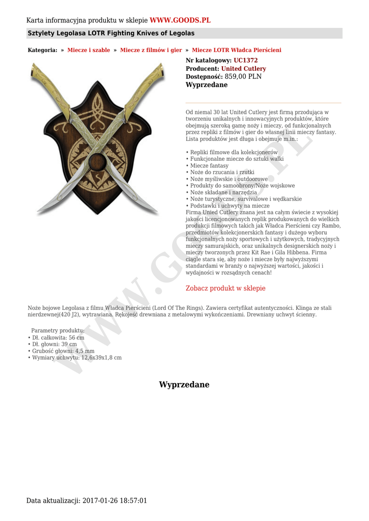 Karta informacyjna produktu w sklepie WWW.GOODS.PL Sztylety Legolasa LOTR Fighting Knives of Legolas Kategoria: » Miecze i szable » Miecze z filmów i gier » Miecze LOTR Władca Pierścieni Nr katalogowy: UC1372 Producent: United Cutlery Dostępność: 859,00 PLN Wyprzedane S. PL Od niemal 30 lat United Cutlery jest firmą przodująca w tworzeniu unikalnych i innowacyjnych produktów, które obejmują szeroką gamę noży i mieczy, od funkcjonalnych przez repliki z filmów i gier do własnej linii mieczy fantasy. Lista produktów jest długa i obejmuje m.in.: W .G O O D • Repliki filmowe dla kolekcjonerów • Funkcjonalne miecze do sztuki walki • Miecze fantasy • Noże do rzucania i rzutki • Noże myśliwskie i outdoorowe • Produkty do samoobrony/Noże wojskowe • Noże składane i narzędzia • Noże turystyczne, survivalowe i wędkarskie • Podstawki i uchwyty na miecze Firma Unied Cutlery znana jest na całym świecie z wysokiej jakości licencjonowanych replik produkowanych do wielkich produkcji filmowych takich jak Władca Pierścieni czy Rambo, przedmiotów kolekcjonerskich fantasy i dużego wyboru funkcjonalnych noży sportowych i użytkowych, tradycyjnych mieczy samurajskich, oraz unikalnych designerskich noży i mieczy tworzonych przez Kit Rae i Gila Hibbena. Firma ciągle stara się, aby noże i miecze były najwyższymi standardami w branży o najwyższej wartości, jakości i wydajności w rozsądnych cenach! Zobacz produkt w sklepie W Noże bojowe Legolasa z filmu Władca Pierścieni (Lord Of The Rings). Zawiera certyfikat autentyczności. Klinga ze stali nierdzewnej(420 J2), wytrawiana. Rękojeść drewniana z metalowymi wykończeniami. Drewniany uchwyt ścienny. W Parametry produktu: • Dł. całkowita: 56 cm • Dł. głowni: 39 cm • Grubość głowni: 4,5 mm • Wymiary uchwytu: 12,6x39x1,8 cm Data aktualizacji: 2017-01-26 18:57:01 Wyprzedane
