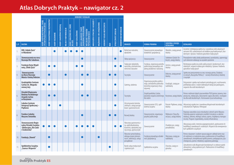 Atlas Dobrych Praktyk – nawigator cz. 2 7. Lokalne Centrum Integracji Społecznej – Piątkowo 8. Fundusz Lokalny Masywu Śnieżnika 9. Stowarzyszenie Regionalny Ośrodek Socjalno -Edukacyjny „Dla Ludzi i Środowiska” 10. Fundacja „Sławek” 11. Spółdzielnia Socjalna „Szansa i Wsparcie” ŚRODOWISKO NATURALNE 6. Ośrodek Wspierania Rodziny Parafialnego Zespołu Caritas w Korytowie SPOŁECZNOŚĆ LOKALNA Grudziądzkie Centrum Caritas im. Błogosławionej Juty NGO 5. ODBIORCY USŁUG MEDYCZNYCH Stowarzyszenie na Rzecz Rozwoju Miasta i Gminy Debrzno WIĘŹNIOWIE I BYLI WIĘŹNIOWIE 4. MNIEJSZOŚCI ETNICZNE I UCHODŹCY Fundacja Domy Wspólnoty „Chleb Życia” DZIECI I MŁODZIEŻ (TAKŻE ZAGROŻONE PATOLOGIAMI) MIESZKAŃCY TERENÓW POPEGEEROWSKICH 3. OSOBY UZALEŻNIONE Stowarzyszenia na rzecz Rozwoju Wsi Sokołowo OSOBY ZAKAŻONE HIV, CHORE NA AIDS 2. ROLNICY INDYWIDUALNI EKO „Szkoła Życia” w Wandzinie OSOBY ZAGROŻONE EKSMISJĄ 1. OSOBY BEZDOMNE NAZWA OSOBY DŁUGOTRWALE BEZROBOTNE L.P. OSOBY NIEPEŁNOSPRAWNE, CHORE I PO KRYZYSACH PSYCHICZNYCH ODBIORCY DZIAŁAŃ • •••• • • • •• •• •• • • •• •• ••• • • •• •• • • • • • •• ••• • •••• •• • • • • • Atlas Dobrych Praktyk ES BRANŻA FORMA PRAWNA SIEDZIBA I ZASIĘG DZIAŁANIA Rolnictwo naturalne, rękodzieło Stowarzyszenie prowadzące działalność gospodarczą i reintegracja społeczna i zawodowa osób zakażonych Wandzin, zasięg ponad- Leczenie wirusem HIV, uzależnionych od środków psychoaktywnych, bezlokalny domnych. Uprawa i hodowla gatunków tradycyjnych Sklep spożywczy Stowarzyszenie Sokołowo (Golub-Dobrzyń), zasięg lokalny Tradycyjne rękodzieło, warsztaty, przetwórstwo, rolnictwo naturalne Fundacja, organizacja pożytku Zochcin, zasięg ponadpublicznego prowadząca od- lokalny płatną działalność statutową Turystyka Stowarzyszenie Catering, szkolenia Organizacja pożytku publicznego, samodzielna jednostka Grudziądz, zasięg pokościelnej organizacji chary- nadlokalny tatywnej Turystyka Zespół parafialny Caritas, Pomoc rodzinom byłych pracowników PGR (pomoc prawna, teraplacówka wsparcia dziennego Korytowo, zasięg lokalny peutyczna, edukacyjna, dożywianie) zajęcia dla dzieci, noclegowdla rodzin nia dla osób bezdomnych. Animowanie życia kulturalnego Utrzymywanie terenów zielonych, usługi porządkowe i gastronomiczne Stowarzyszenie (CIS), spółdzielnia socjalna Poznań-Piątkowo, zasięg Aktywizacja społeczna i zawodowa długotrwale bezrobotnych lokalny mieszkańców Piątkowa i Winograd Rozwój lokalny Stowarzyszenie, organizacja pożytku publicznego Wójtowice (Stara Bystrzyca), zasięg lokalny Poprawa warunków życia mieszkańcó czterech gmin Masywu Śnieżnika poprzez wspieranie wszelkich inicjatyw w zakresie edukacji, zdrowia, ekologii, kultury, sportu, współpracy transgranicznej. Program stypendialny, rozwój infrastruktury Chudobczyce, zasięg ponadlokalny Aktywizacja osób z terenów popegeerowskich, podnoszenie ich kwalifikacji zawodowych i osobistych. Wsparcie dla nowopowstałych spółdzielni socjalnych Warsztaty gastronomiczny, ogólnobudowlany, krawiecki, rękodzieła arty- Stowarzyszenie stycznego, agroturystyki DZIAŁANIA Prowadzenie małej szkoły podstawowej i przedszkola, zapewniających dzieciom edukację na wysokim poziomie Reintegracja społeczna osób wykluczonych, bezdomnych, bezrobotnych, wsparcie edukacyjne młodzieży. Uprawa i hodowla gatunków tradycyjnych porozumienie na rzecz rozwoju gminy. Działania Debrzno, zasięg ponad- Społeczne w ramach „Naszyjnika Północy” - rozwój infrastruktury lokalnej lokalny i turystyki Warsztat samochodowy, obsługa imprez plenerowych, radiostacja, usługi porządkowe Fundacja prowadząca działal- Warszawa, zasięg poność gospodarczą nadlokalny Rynek usług medycznych i opiekuńczych Spółdzielnia socjalna Chorzów, zasięg regionalny Dożywianie i opieka nad osobami potrzebującymi, wychowanie, profilaktyka dzieci z rodzin dotkniętych biedą lub patologiami, wsparcie dla osób bezrobotnych Pomoc skazanym i osobom opuszczającym zakłady karne oraz ich rodzinom w znalezieniu pracy, podnoszenie ich kwalifikacji zawodowych, kompleksowa opieka prawna, pedagogiczna, psychologiczna, pomoc młodzieży zagrożonej patologią Zatrudnienie osób długotrwale bezrobotnych w sektorze opieki zdrowotnej i usług opiekuńczych. Podnoszenie ich kwalifikacji zawodowych