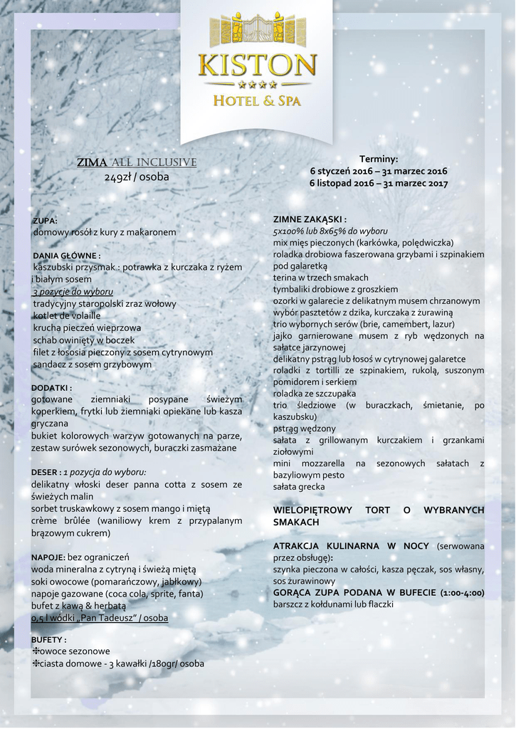 ZIMA All Inclusive 249zł / osoba ZUPA: domowy rosół z kury z makaronem DANIA GŁÓWNE : kaszubski przysmak : potrawka z kurczaka z ryżem i białym sosem 3 pozycje do wyboru tradycyjny staropolski zraz wołowy kotlet de volaille krucha pieczeń wieprzowa schab owinięty w boczek filet z łososia pieczony z sosem cytrynowym sandacz z sosem grzybowym DODATKI : gotowane ziemniaki posypane świeżym koperkiem, frytki lub ziemniaki opiekane lub kasza gryczana bukiet kolorowych warzyw gotowanych na parze, zestaw surówek sezonowych, buraczki zasmażane DESER : 1 pozycja do wyboru: delikatny włoski deser panna cotta z sosem ze świeżych malin sorbet truskawkowy z sosem mango i miętą crème brûlée (waniliowy krem z przypalanym brązowym cukrem) NAPOJE: bez ograniczeń woda mineralna z cytryną i świeżą miętą soki owocowe (pomarańczowy, jabłkowy) napoje gazowane (coca cola, sprite, fanta) bufet z kawą & herbatą 0,5 l wódki „Pan Tadeusz” / osoba BUFETY : ❈owoce sezonowe ❈ciasta domowe - 3 kawałki /180gr/ osoba Terminy: 6 styczeń 2016 – 31 marzec 2016 6 listopad 2016 – 31 marzec 2017 ZIMNE ZAKĄSKI : 5x100% lub 8x65% do wyboru mix mięs pieczonych (karkówka, polędwiczka) roladka drobiowa faszerowana grzybami i szpinakiem pod galaretką terina w trzech smakach tymbaliki drobiowe z groszkiem ozorki w galarecie z delikatnym musem chrzanowym wybór pasztetów z dzika, kurczaka z żurawiną trio wybornych serów (brie, camembert, lazur) jajko garnierowane musem z ryb wędzonych na sałatce jarzynowej delikatny pstrąg lub łosoś w cytrynowej galaretce roladki z tortilli ze szpinakiem, rukolą, suszonym pomidorem i serkiem roladka ze szczupaka trio śledziowe (w buraczkach, śmietanie, po kaszubsku) pstrąg wędzony sałata z grillowanym kurczakiem i grzankami ziołowymi mini mozzarella na sezonowych sałatach z bazyliowym pesto sałata grecka WIELOPIĘTROWY SMAKACH TORT O WYBRANYCH ATRAKCJA KULINARNA W NOCY (serwowana przez obsługę): szynka pieczona w całości, kasza pęczak, sos własny, sos żurawinowy GORĄCA ZUPA PODANA W BUFECIE (1:00-4:00) barszcz z kołdunami lub flaczki