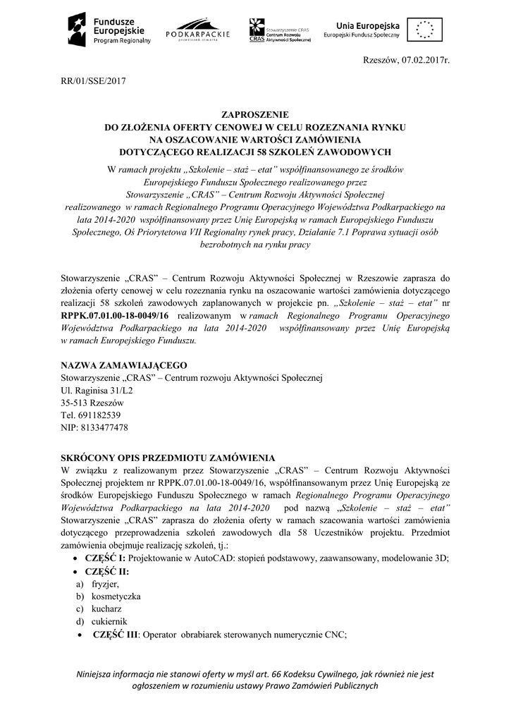 Rzeszów, 07.02.2017r. RR/01/SSE/2017 ZAPROSZENIE DO ZŁOŻENIA OFERTY CENOWEJ W CELU ROZEZNANIA RYNKU NA OSZACOWANIE WARTOŚCI ZAMÓWIENIA DOTYCZĄCEGO REALIZACJI 58 SZKOLEŃ ZAWODOWYCH W ramach projektu „Szkolenie – staż – etat” współfinansowanego ze środków Europejskiego Funduszu Społecznego realizowanego przez Stowarzyszenie „CRAS” – Centrum Rozwoju Aktywności Społecznej realizowanego w ramach Regionalnego Programu Operacyjnego Województwa Podkarpackiego na lata 2014-2020 współfinansowany przez Unię Europejską w ramach Europejskiego Funduszu Społecznego, Oś Priorytetowa VII Regionalny rynek pracy, Działanie 7.1 Poprawa sytuacji osób bezrobotnych na rynku pracy Stowarzyszenie „CRAS” – Centrum Rozwoju Aktywności Społecznej w Rzeszowie zaprasza do złożenia oferty cenowej w celu rozeznania rynku na oszacowanie wartości zamówienia dotyczącego realizacji 58 szkoleń zawodowych zaplanowanych w projekcie pn. „Szkolenie – staż – etat” nr RPPK.07.01.00-18-0049/16 realizowanym w ramach Regionalnego Programu Operacyjnego Województwa Podkarpackiego na lata 2014-2020 współfinansowany przez Unię Europejską w ramach Europejskiego Funduszu. NAZWA ZAMAWIAJĄCEGO Stowarzyszenie „CRAS” – Centrum rozwoju Aktywności Społecznej Ul. Raginisa 31/L2 35-513 Rzeszów Tel. 691182539 NIP: 8133477478 SKRÓCONY OPIS PRZEDMIOTU ZAMÓWIENIA W związku z realizowanym przez Stowarzyszenie „CRAS” – Centrum Rozwoju Aktywności Społecznej projektem nr RPPK.07.01.00-18-0049/16, współfinansowanym przez Unię Europejską ze środków Europejskiego Funduszu Społecznego w ramach Regionalnego Programu Operacyjnego Województwa Podkarpackiego na lata 2014-2020 pod nazwą „Szkolenie – staż – etat” Stowarzyszenie „CRAS” zaprasza do złożenia oferty w ramach szacowania wartości zamówienia dotyczącego przeprowadzenia szkoleń zawodowych dla 58 Uczestników projektu. Przedmiot zamówienia obejmuje realizację szkoleń, tj.: CZĘŚĆ I: Projektowanie w AutoCAD: stopień podstawowy, zaawansowany, modelowanie 3D; CZĘŚĆ II: a) fryzjer, b) kosmetyczka c) kucharz d) cukiernik CZĘŚĆ III: Operator obrabiarek sterowanych numerycznie CNC; Niniejsza informacja nie stanowi oferty w myśl art. 66 Kodeksu Cywilnego, jak również nie jest ogłoszeniem w rozumieniu ustawy Prawo Zamówień Publicznych CZĘŚĆ IV: a) operator koparko-ładowarki kl. III, b) kierowca operator wózków jezdniowych podnośnikowych z wymianą butli gazowych (wózki prowadzone i zdalnie sterowane, wózki podnośnikowe, podnośnikowe specjalizowane ze zmiennym wysięgiem) I, II, III WJO; CZĘŚĆ V: Szkolenie: Prowadzenie spraw rachunkowo-finansowych; CZĘŚĆ VI: Uprawnienia elektryczne do 1 kV kontrolno-pomiarowe; CZĘŚĆ VII: Spawanie metodą MIG 131, MAG 135 - stopień I; CZĘŚĆ VIII: Obsługa komputera; CZĘŚĆ IX: Opiekun w żłobku i klubie dziecięcym. OPIS PRZEDMIOTU ZAMÓWIENIA Cel zamówienia Niniejsze rozeznanie rynku ma na celu oszacowanie wartości zamówienia dotyczącego przeprowadzenia szkoleń zawodowych dla 58 Uczestników projektu „Szkolenie – staż – etat”. Przedmiot zamówienia Przedmiotem zamówienia jest oszacowanie wartości zamówienia dotyczącego przeprowadzenia szkoleń zawodowych dla 58 Uczestników projektu. Zamawiający dopuszcza możliwość składania ofert częściowych zawierających realizację wszystkich szkoleń w ramach danej części. Przedmiot zamówienia obejmuje realizację szkoleń tj.: Łączna liczba godzin 3 Lp. Nazwa szkolenia 1 2 1. Projektowanie w AutoCAD: stopień podstawowy, zaawansowany, modelowanie 3D 72 1. Cukiernik 280 2. Kucharz 280 3. Kucharz 4. Liczba osób Miejsce szkolenia Termin szkolenia Wymagania 5 6 7 Rzeszów luty–maj 2017 szkolenie zakończone egzaminem Autodesk 4 CZĘŚĆ I 1 CZĘŚĆ II Rzeszów 1 luty–maj 2017 3 Rzeszów luty–maj 2017 280 1 Przemyśl luty–maj 2017 Fryzjer 280 2 Rzeszów luty–maj 2017 5. Kosmetyczka 280 2 Rzeszów luty–maj 2017 1. Operator obrabiarek sterowanych numerycznie CNC szkolenie zakończone egzaminem czeladniczym szkolenie zakończone egzaminem czeladniczym szkolenie zakończone egzaminem czeladniczym szkolenie zakończone egzaminem czeladniczym szkolenie zakończone egzaminem czeladniczym CZĘŚĆ III 120 5 Rzeszów luty–maj 2017 szkolenie zakończone egzaminem czeladniczym CZĘŚĆ IV 1. 2 Operator koparko-ładowarki kl. III 202 1 Rzeszów luty–maj 2017 Kierowca operator wózków jezdniowych podnośnikowych z 67 3 Rzeszów luty–maj 2017 szkolenie zakończone egzaminem Instytutu Mechanizacji Budownictwa i Górnictwa Skalnego szkolenie zakończone egzaminem Urzędu Niniejsza informacja nie stanowi oferty w myśl art. 66 Kodeksu Cywilnego, jak również nie jest ogłoszeniem w rozumieniu ustawy Prawo Zamówień Publicznych wymianą butli gazowych (wózki prowadzone i zdalnie sterowane, wózki podnośnikowe, podnośnikowe specjalizowane ze zmiennym wysięgiem) I, II, III WJO Dozoru Technicznego CZĘŚĆ V 1. Szkolenie: Prowadzenie spraw rachunkowo-finansowych 90 9 Rzeszów luty–maj 2017 Szkolenie zakończone egzaminem i certyfikacją VCC lub egzaminem równoważnym luty–maj 2017 szkolenie zakończone egzaminem D i E Stowarzyszenia Elektryków Polskich lub egzaminem równoważnym luty–maj 2017 Szkolenie zakończone egzaminem Instytutu Spawalnictwa w Gliwicach lub egzaminem równoważnym luty–maj 2017 szkolenie zakończone egzaminem przeprowadzonym przez Centra Egzaminacyjne akredytowane przez PTI i uzyskaniem certyfikatu ECDL Base lub ECDL Advanced (w zakresie modułu A1 i A2) w zależności od poziomu ukończonego szkolenia lub egzaminem równoważnym luty–maj 2017 Szkolenie zakończone egzaminem nadającym kwalifikacje w zawodzie opiekun w żłobku i klubie dziecięcym zgodnie z art.16 ustawy z dnia 14 lutego 2011 o opiece nad dziećmi w wieku do lat 3 CZĘŚĆ VI 1. Uprawnienia elektryczne do 1 kV kontrolno-pomiarowe 35 1 Rzeszów CZĘŚĆ VI