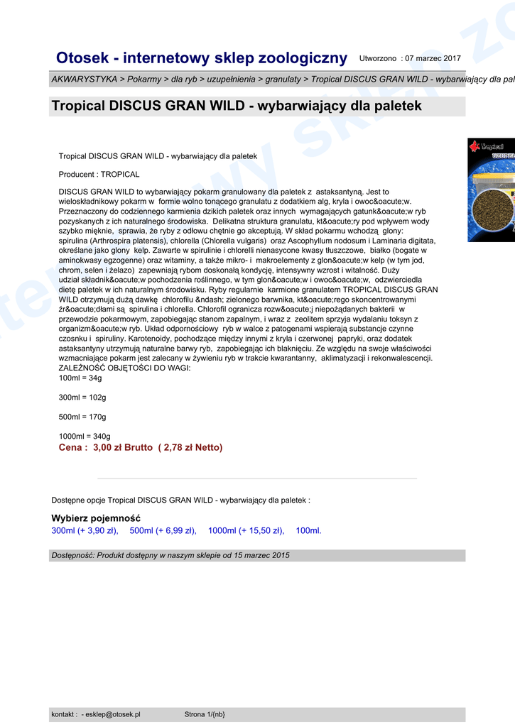 Otosek - internetowy sklep zoologiczny p le Utworzono : 07 marzec 2017 o z AKWARYSTYKA > Pokarmy > dla ryb > uzupełnienia > granulaty > Tropical DISCUS GRAN WILD - wybarwiający dla pal k s Tropical DISCUS GRAN WILD - wybarwiający dla paletek y w to Tropical DISCUS GRAN WILD - wybarwiający dla paletek Producent : TROPICAL DISCUS GRAN WILD to wybarwiający pokarm granulowany dla paletek z astaksantyną. Jest to wieloskładnikowy pokarm w formie wolno tonącego granulatu z dodatkiem alg, kryla i owoców. Przeznaczony do codziennego karmienia dzikich paletek oraz innych wymagających gatunków ryb pozyskanych z ich naturalnego środowiska. Delikatna struktura granulatu, który pod wpływem wody szybko mięknie, sprawia, że ryby z odłowu chętnie go akceptują. W skład pokarmu wchodzą glony: spirulina (Arthrospira platensis), chlorella (Chlorella vulgaris) oraz Ascophyllum nodosum i Laminaria digitata, określane jako glony kelp. Zawarte w spirulinie i chlorelli nienasycone kwasy tłuszczowe, białko (bogate w aminokwasy egzogenne) oraz witaminy, a także mikro- i makroelementy z glonów kelp (w tym jod, chrom, selen i żelazo) zapewniają rybom doskonałą kondycję, intensywny wzrost i witalność. Duży udział składników pochodzenia roślinnego, w tym glonów i owoców, odzwierciedla dietę paletek w ich naturalnym środowisku. Ryby regularnie karmione granulatem TROPICAL DISCUS GRAN WILD otrzymują dużą dawkę chlorofilu – zielonego barwnika, którego skoncentrowanymi źródłami są spirulina i chlorella. Chlorofil ogranicza rozwój niepożądanych bakterii w przewodzie pokarmowym, zapobiegając stanom zapalnym, i wraz z zeolitem sprzyja wydalaniu toksyn z organizmów ryb. Układ odpornościowy ryb w walce z patogenami wspierają substancje czynne czosnku i spiruliny. Karotenoidy, pochodzące między innymi z kryla i czerwonej papryki, oraz dodatek astaksantyny utrzymują naturalne barwy ryb, zapobiegając ich blaknięciu. Ze względu na swoje właściwości wzmacniające pokarm jest zalecany w żywieniu ryb w trakcie kwarantanny, aklimatyzacji i rekonwalescencji. ZALEŻNOŚĆ OBJĘTOŚCI DO WAGI: 100ml = 34g e n r e t n 300ml = 102g 500ml = 170g 1000ml = 340g Cena : 3,00 zł Brutto ( 2,78 zł Netto) Dostępne opcje Tropical DISCUS GRAN WILD - wybarwiający dla paletek : Wybierz pojemność 300ml (+ 3,90 zł), 500ml (+ 6,99 zł), 1000ml (+ 15,50 zł), Dostępność: Produkt dostępny w naszym sklepie od 15 marzec 2015 kontakt : - [email protected] Strona 1/{nb} 100ml. Model : -