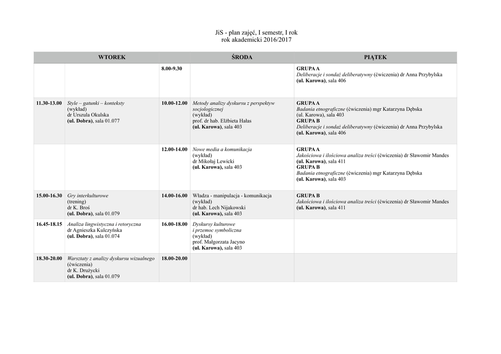 ! ! JiS - plan zajęć, I semestr, I rok rok akademicki 2016/2017 WTOREK ŚRODA PIĄTEK 8.00-9.30 GRUPA A Deliberacje i sondaż deliberatywny (ćwiczenia) dr Anna Przybylska (ul. Karowa), sala 406 10.00-12.00 Metody analizy dyskursu z perspektyw socjologicznej (wykład) prof. dr hab. Elżbieta Hałas (ul. Karowa), sala 403 GRUPA A Badania etnograficzne (ćwiczenia) mgr Katarzyna Dębska (ul. Karowa), sala 403 GRUPA B Deliberacje i sondaż deliberatywny (ćwiczenia) dr Anna Przybylska (ul. Karowa), sala 406 12.00-14.00 Nowe media a komunikacja (wykład) dr Mikołaj Lewicki (ul. Karowa), sala 403 GRUPA A Jakościowa i ilościowa analiza treści (ćwiczenia) dr Sławomir Mandes (ul. Karowa), sala 411 GRUPA B Badania etnograficzne (ćwiczenia) mgr Katarzyna Dębska (ul. Karowa), sala 403 15.00-16.30 Gry interkulturowe (trening) dr K. Broś (ul. Dobra), sala 01.079 14.00-16.00 Władza - manipulacja - komunikacja (wykład) dr hab. Lech Nijakowski (ul. Karowa), sala 403 GRUPA B Jakościowa i ilościowa analiza treści (ćwiczenia) dr Sławomir Mandes (ul. Karowa), sala 411 16.45-18.15 Analiza lingwistyczna i retoryczna dr Agnieszka Kulczyńska (ul. Dobra), sala 01.074 16.00-18.00 Dyskursy kulturowe i przemoc symboliczna (wykład) prof. Małgorzata Jacyno (ul. Karowa), sala 403 18.30-20.00 Warsztaty z analizy dyskursu wizualnego (ćwiczenia) dr K. Drużycki (ul. Dobra), sala 01.079 18.00-20.00 11.30-13.00 Style – gatunki – konteksty (wykład) dr Urszula Okulska (ul. Dobra), sala 01.077