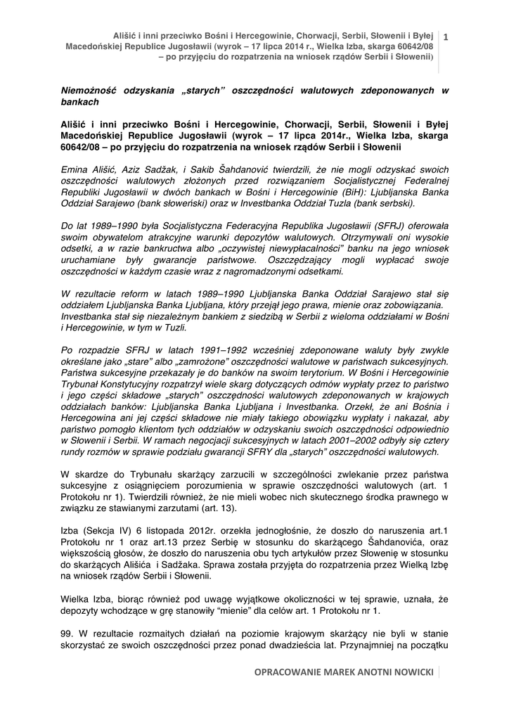 Ališić i inni przeciwko Bośni i Hercegowinie, Chorwacji, Serbii, Słowenii i Byłej Macedońskiej Republice Jugosławii (wyrok – 17 lipca 2014 r., Wielka Izba, skarga 60642/08 – po przyjęciu do rozpatrzenia na wniosek rządów Serbii i Słowenii) 1 Niemożność odzyskania „starych” oszczędności walutowych zdeponowanych w bankach Ališić i inni przeciwko Bośni i Hercegowinie, Chorwacji, Serbii, Słowenii i Byłej Macedońskiej Republice Jugosławii (wyrok – 17 lipca 2014r., Wielka Izba, skarga 60642/08 – po przyjęciu do rozpatrzenia na wniosek rządów Serbii i Słowenii Emina Ališić, Aziz Sadžak, i Sakib Šahdanović twierdzili, że nie mogli odzyskać swoich oszczędności walutowych złożonych przed rozwiązaniem Socjalistycznej Federalnej Republiki Jugosławii w dwóch bankach w Bośni i Hercegowinie (BiH): Ljubljanska Banka Oddział Sarajewo (bank słoweński) oraz w Investbanka Oddział Tuzla (bank serbski). Do lat 1989–1990 była Socjalistyczna Federacyjna Republika Jugosławii (SFRJ) oferowała swoim obywatelom atrakcyjne warunki depozytów walutowych. Otrzymywali oni wysokie odsetki, a w razie bankructwa albo „oczywistej niewypłacalności” banku na jego wniosek uruchamiane były gwarancje państwowe. Oszczędzający mogli wypłacać swoje oszczędności w każdym czasie wraz z nagromadzonymi odsetkami. W rezultacie reform w latach 1989–1990 Ljubljanska Banka Oddział Sarajewo stał się oddziałem Ljubljanska Banka Ljubljana, który przejął jego prawa, mienie oraz zobowiązania. Investbanka stał się niezależnym bankiem z siedzibą w Serbii z wieloma oddziałami w Bośni i Hercegowinie, w tym w Tuzli. Po rozpadzie SFRJ w latach 1991–1992 wcześniej zdeponowane waluty były zwykle określane jako „stare” albo „zamrożone” oszczędności walutowe w państwach sukcesyjnych. Państwa sukcesyjne przekazały je do banków na swoim terytorium. W Bośni i Hercegowinie Trybunał Konstytucyjny rozpatrzył wiele skarg dotyczących odmów wypłaty przez to państwo i jego części składowe „starych” oszczędności walutowych zdeponowanych w krajowych oddziałach banków: Ljubljanska Banka Ljubljana i Investbanka. Orzekł, że ani Bośnia i Hercegowina ani jej części składowe nie miały takiego obowiązku wypłaty i nakazał, aby państwo pomogło klientom tych oddziałów w odzyskaniu swoich oszczędności odpowiednio w Słowenii i Serbii. W ramach negocjacji sukcesyjnych w latach 2001–2002 odbyły się cztery rundy rozmów w sprawie podziału gwarancji SFRY dla „starych” oszczędności walutowych. W skardze do Trybunału skarżący zarzucili w szczególności zwlekanie przez państwa sukcesyjne z osiągnięciem porozumienia w sprawie oszczędności walutowych (art. 1 Protokołu nr 1). Twierdzili również, że nie mieli wobec nich skutecznego środka prawnego w związku ze stawianymi zarzutami (art. 13). Izba (Sekcja IV) 6 listopada 2012r. orzekła jednogłośnie, że doszło do naruszenia art.1 Protokołu nr 1 oraz art.13 przez Serbię w stosunku do skarżącego Šahdanovića, oraz większością głosów, że doszło do naruszenia obu tych artykułów przez Słowenię w stosunku do skarżących Ališića i Sadžaka. Sprawa została przyjęta do rozpatrzenia przez Wielką Izbę na wniosek rządów Serbii i Słowenii. Wielka Izba, biorąc również pod uwagę wyjątkowe okoliczności w tej sprawie, uznała, że depozyty wchodzące w grę stanowiły “mienie” dla celów art. 1 Protokołu nr 1. 99. W rezultacie rozmaitych działań na poziomie krajowym skarżący nie byli w stanie skorzystać ze swoich oszczędności przez ponad dwadzieścia lat. Przynajmniej na początku OPRACOWANIE MAREK ANOTNI NOWICKI 2 Ališić i inni przeciwko Bośni i Hercegowinie, Chorwacji, Serbii, Słowenii i Byłej Macedońskiej Republice Jugosławii (wyrok – 17 lipca 2014 r., Wielka Izba, skarga 60642/08 – po przyjęciu do rozpatrzenia na wniosek rządów Serbii i Słowenii) zamrożenie kont bankowych można było uznać za mające na celu kontrolę korzystania z mienia. Pojawiło się jednak pytanie, czy brak dostępu do depozytów przez tak długi okres nie oznaczał „pozbawienia” mienia. Biorąc jednak pod uwagę, że ustawodawstwo państw wchodzących w grę nie doprowadziło do umorzenia roszczeń skarżących ani w inny sposób nie odebrało im mocy prawnej, a poza tym ze względu na zgodę państw, że co do zasady również właściciele depozytów tacy, jak skarżący, powinni móc dysponować swoimi oszczędnościami, nie można było uznać, że zostali oni formalnie ich pozbawieni. Z tych samych powodów nie doszło do ich faktycznego wywłaszczenia. W tych okolicznościach oraz ze względu na skomplikowany charakter kwestii prawnych i faktycznych Trybunał uważał, że zarzuconego naruszenia prawa własności nie można było zaliczyć do żadnej konkretnej kategorii. Sprawę tę należało więc zbadać w świetle ogólnej zasady zawartej w zdaniu pierwszym art.1 Protokołu nr 1. W związku z kwestią natury zarzuconego naruszenia Trybunał podkreślił, że głównym przedmiotem art.1 Protokołu nr 1 jest ochrona przed nieusprawiedliwioną ingerencją państwa w spokojne korzystanie z mienia. Mogą się z nią jednak wiązać również obowiązki pozytywne mające zapewnić skuteczne korzystanie z praw zagwarantowanych w Konwencji. W kontekście art. 1 Protokołu nr 1 mogą one wymagać od państwa działań koniecznych dla ochrony prawa własności. Skarżący zarzucili, że nie mogli wycofać swoich oszczędności z kont w bankach wchodzących tu w grę. Ich depozyty stały się niedostępne z takich względów, jak brak funduszy w tych bankach, przyjęcie przepisów zamrażających konta oraz niepodjęcie przez władze działań umożliwiających właścicielom depozytów znajdującym się w sytuacji skarżących dysponowanie swoimi oszczędnościami. Taki stan rzeczy można było z powodzeniem uznać za ingerencję w skute